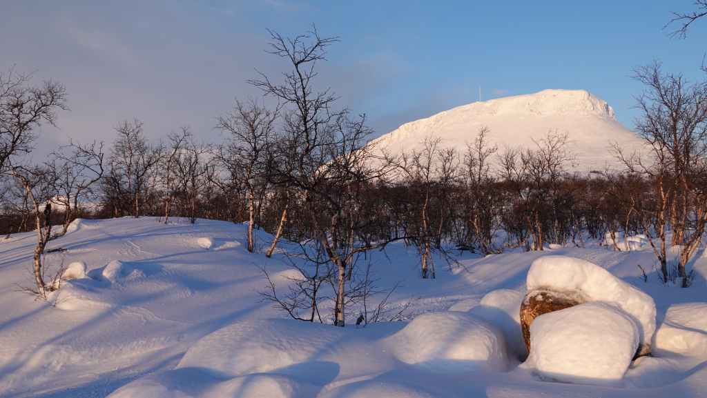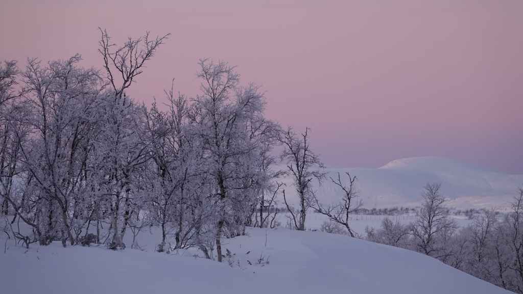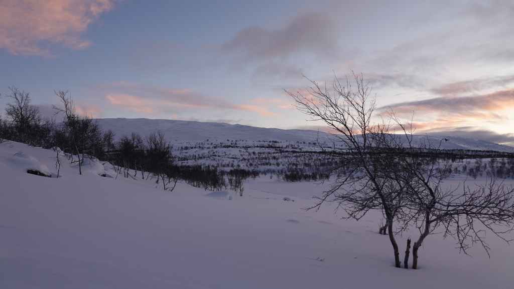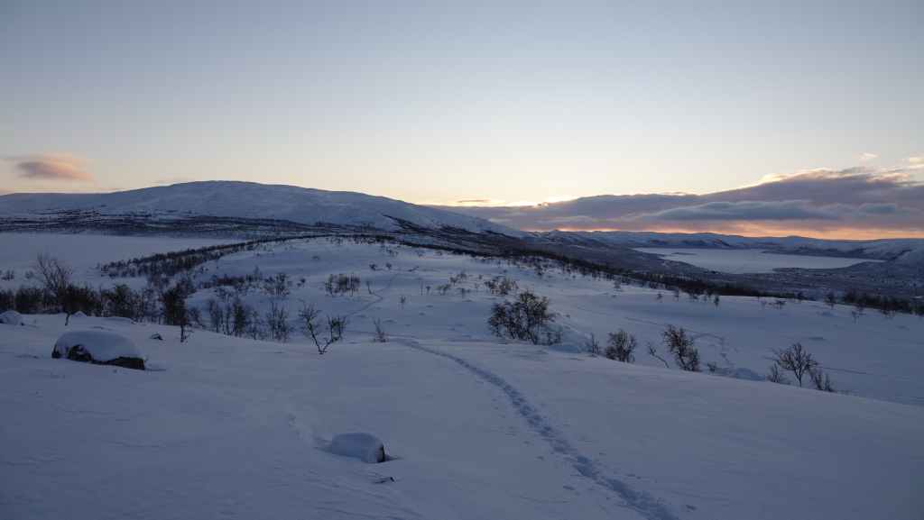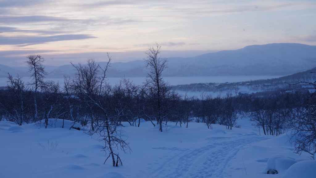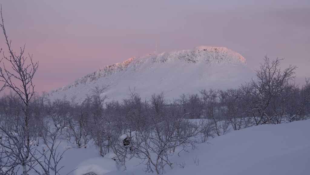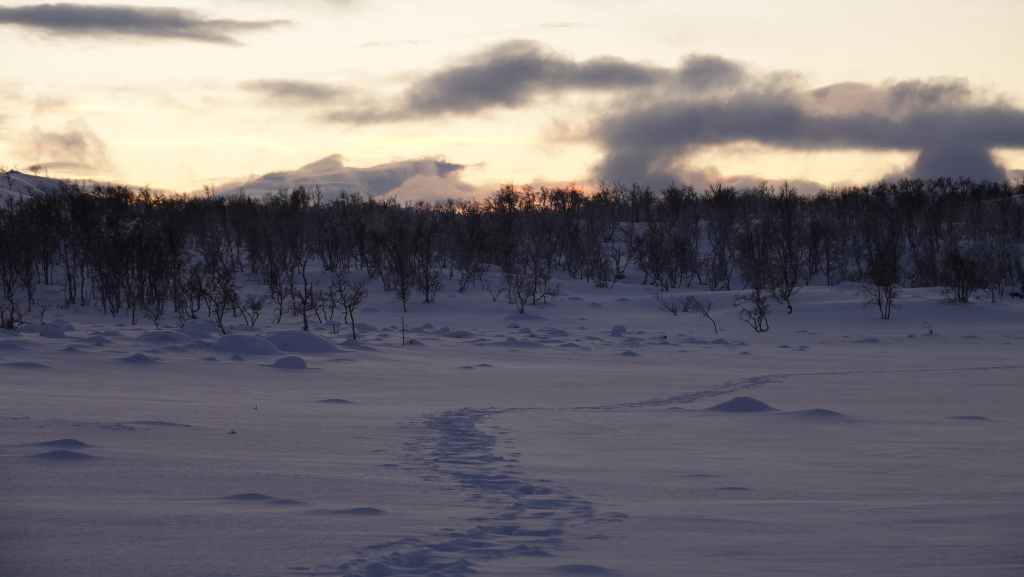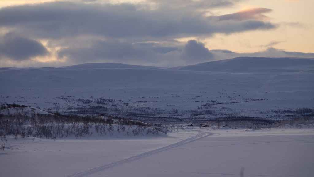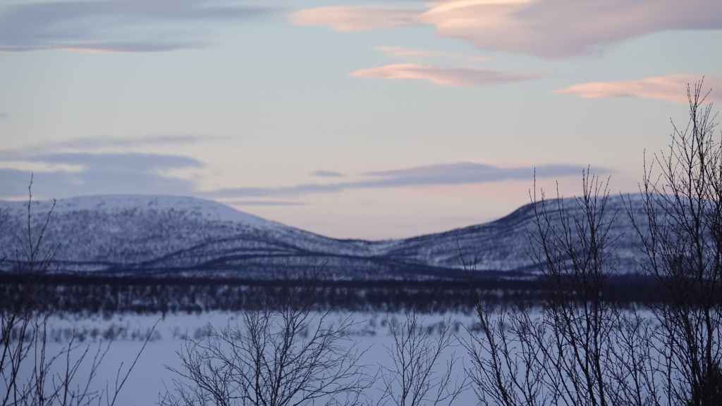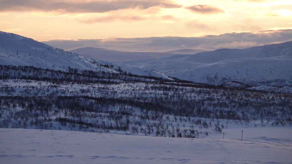 Je m’avance jusqu’à apercevoir une vallée lointaine près de la frontière norvégienne : une petite forêt de bouleaux et des parcs à rennes me rappellent que je suis bien en Laponie, au pays des Saamis. J’aurais envie de continuer vers la frontière, mais le soleil qui disparait petit à petit derrière les montagne me signale que je dois entamer le retour au village : dans 1h30, il fera nuit et je voudrais contempler les paysages jusqu’au bout, sans avoir à allumer la frontale.