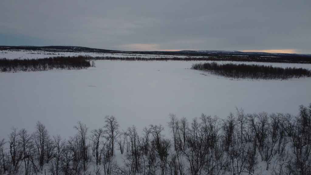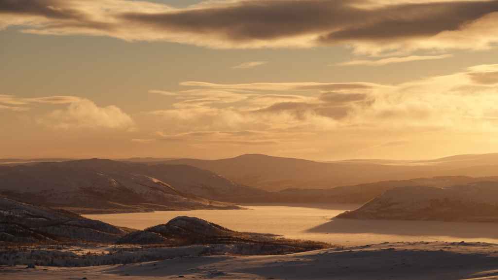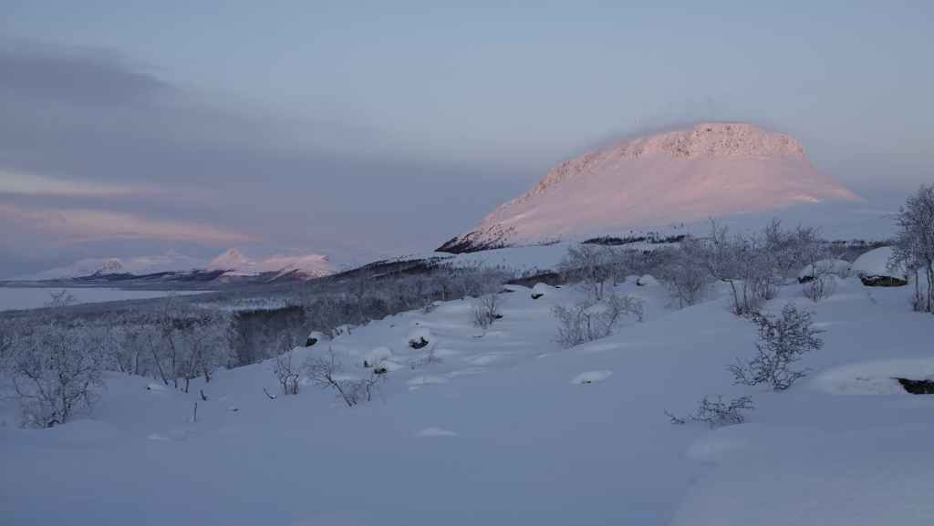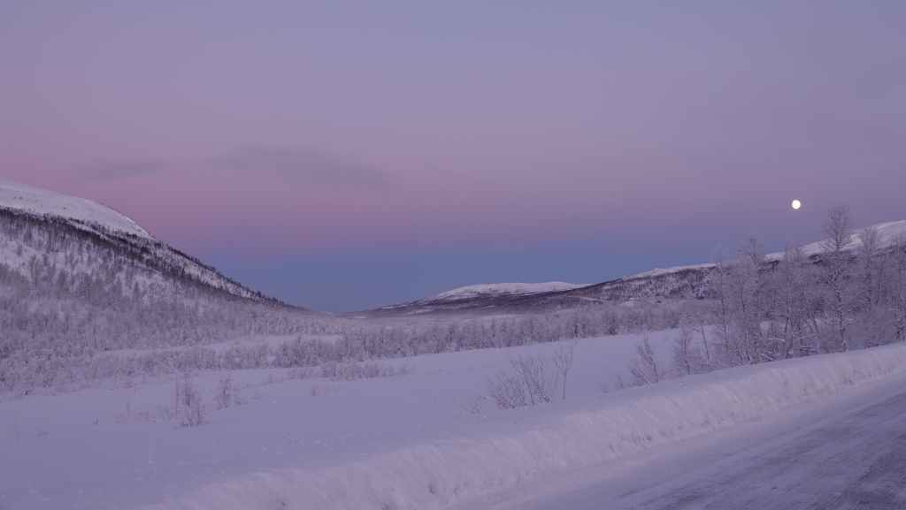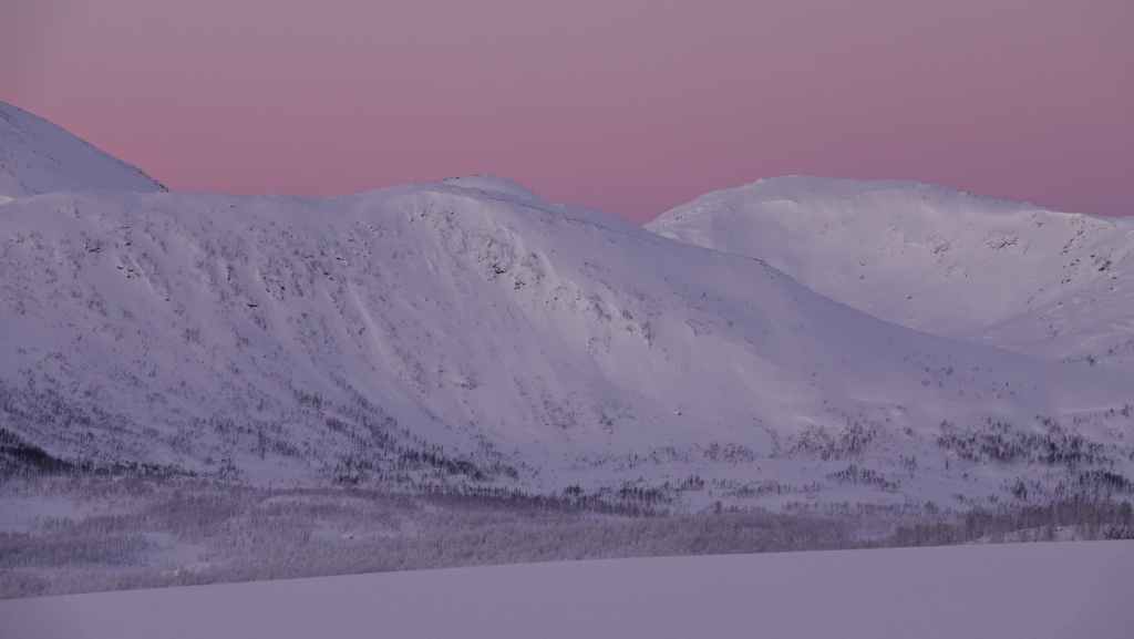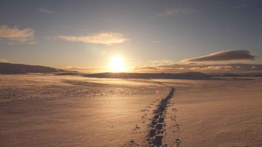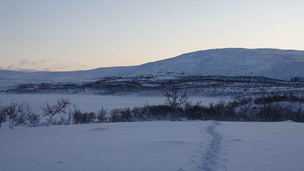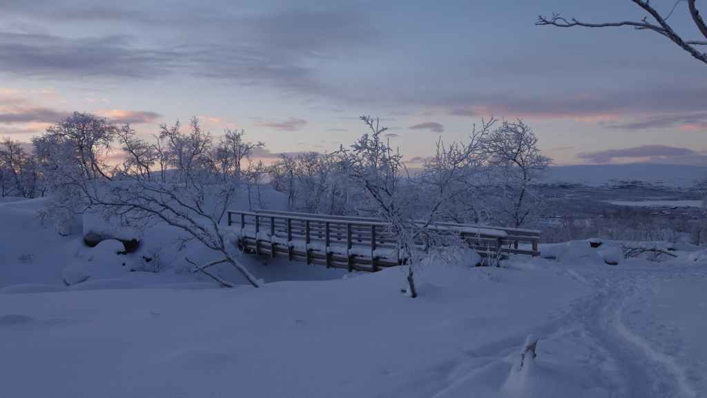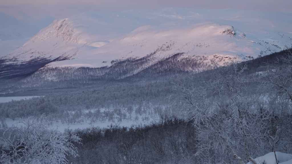 Je m’avance jusqu’à apercevoir une vallée lointaine près de la frontière norvégienne : une petite forêt de bouleaux et des parcs à rennes me rappellent que je suis bien en Laponie, au pays des Saamis. J’aurais envie de continuer vers la frontière, mais le soleil qui disparait petit à petit derrière les montagne me signale que je dois entamer le retour au village : dans 1h30, il fera nuit et je voudrais contempler les paysages jusqu’au bout, sans avoir à allumer la frontale.