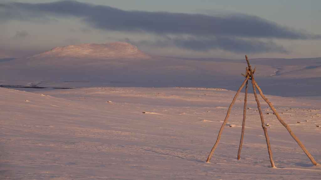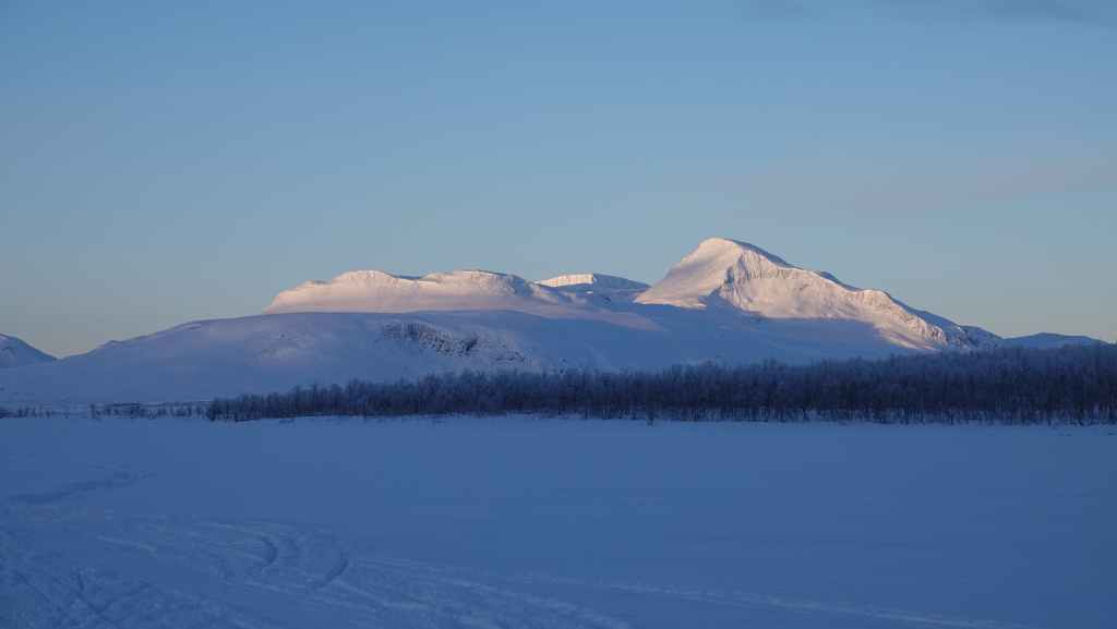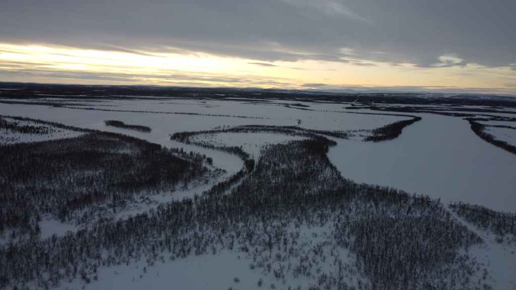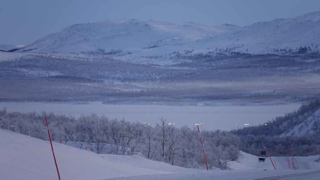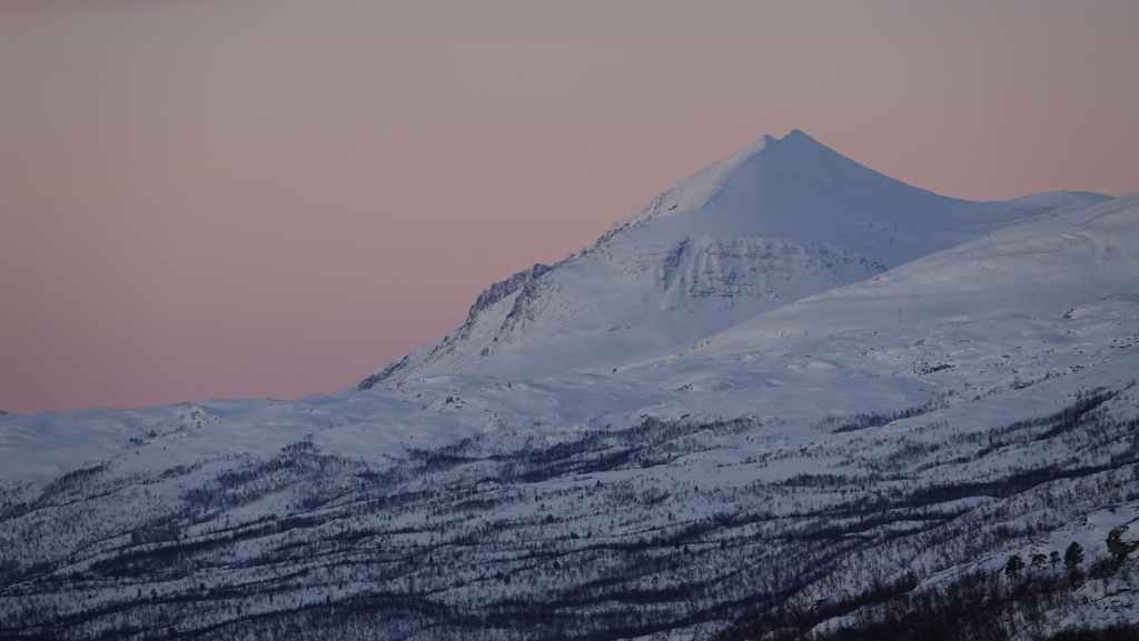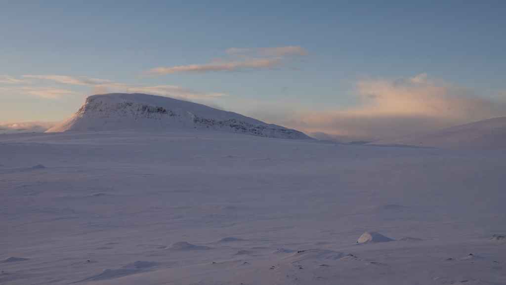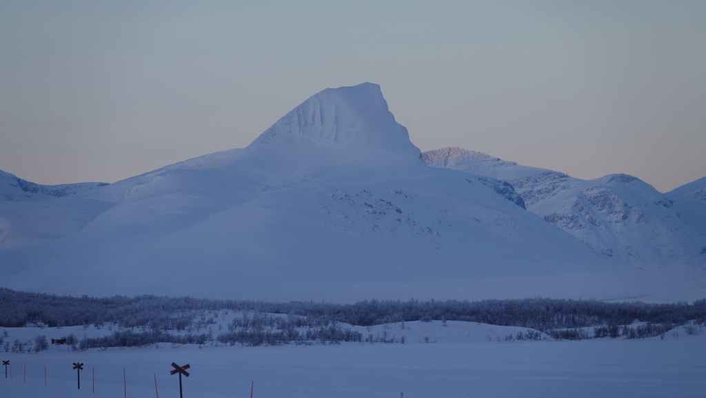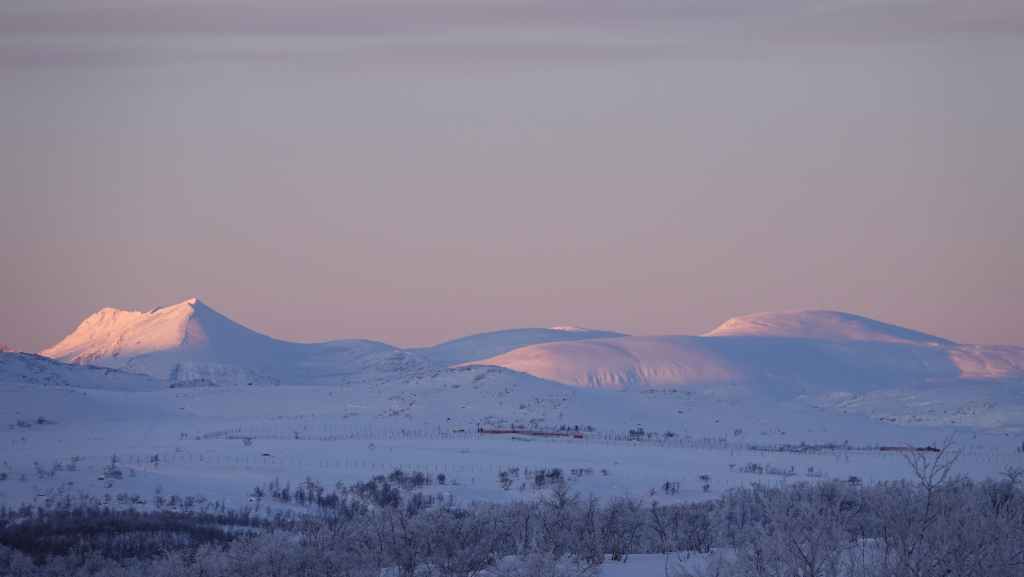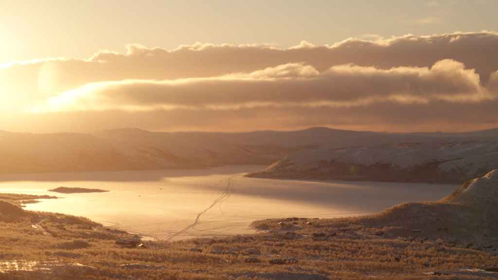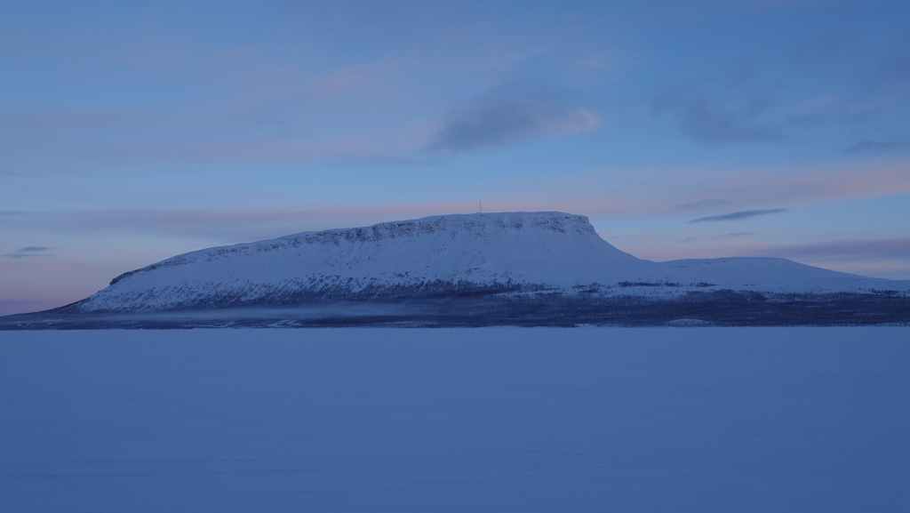 Je m’avance jusqu’à apercevoir une vallée lointaine près de la frontière norvégienne : une petite forêt de bouleaux et des parcs à rennes me rappellent que je suis bien en Laponie, au pays des Saamis. J’aurais envie de continuer vers la frontière, mais le soleil qui disparait petit à petit derrière les montagne me signale que je dois entamer le retour au village : dans 1h30, il fera nuit et je voudrais contempler les paysages jusqu’au bout, sans avoir à allumer la frontale.