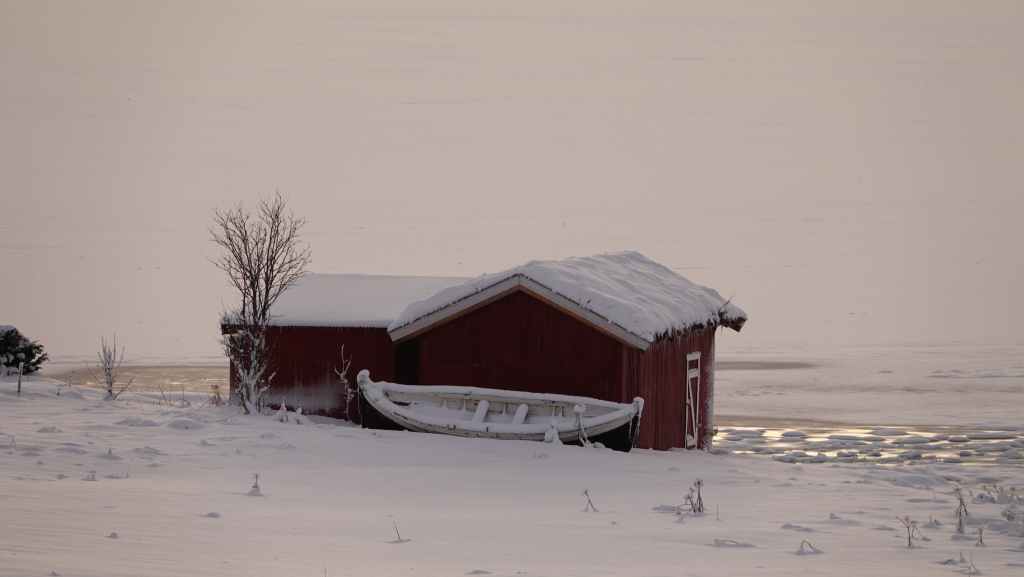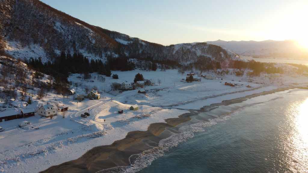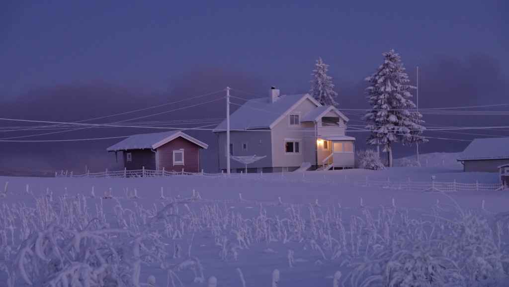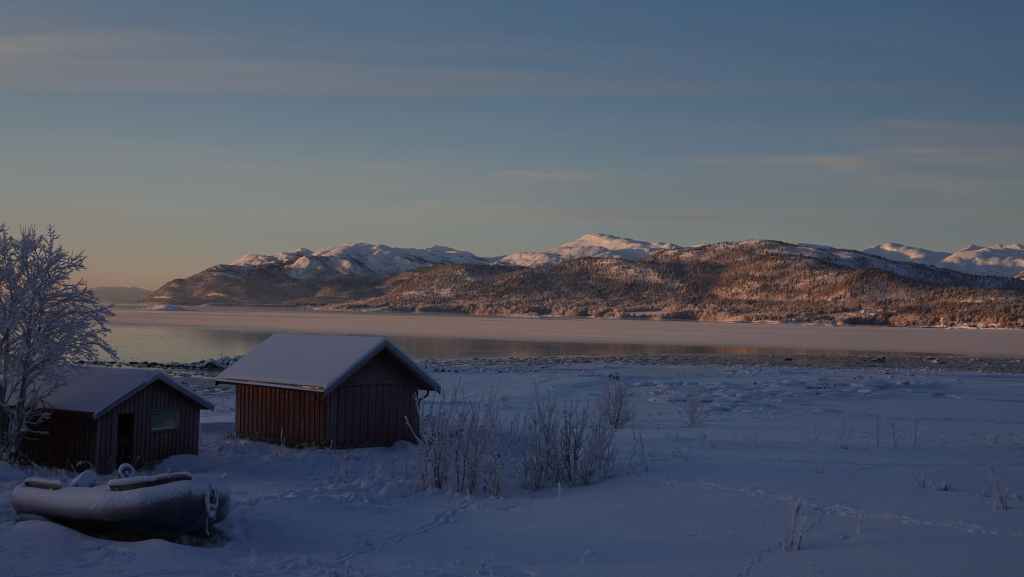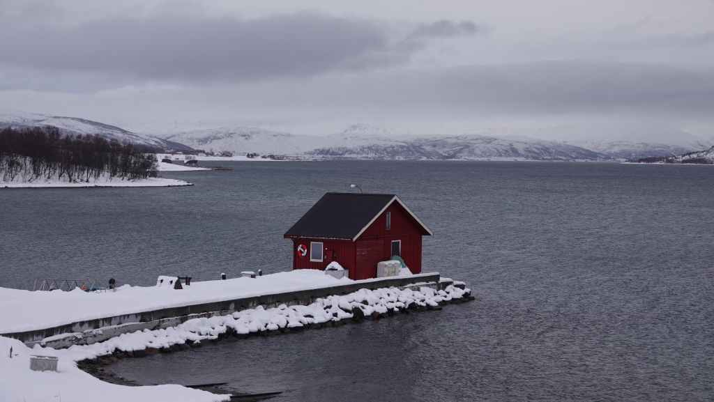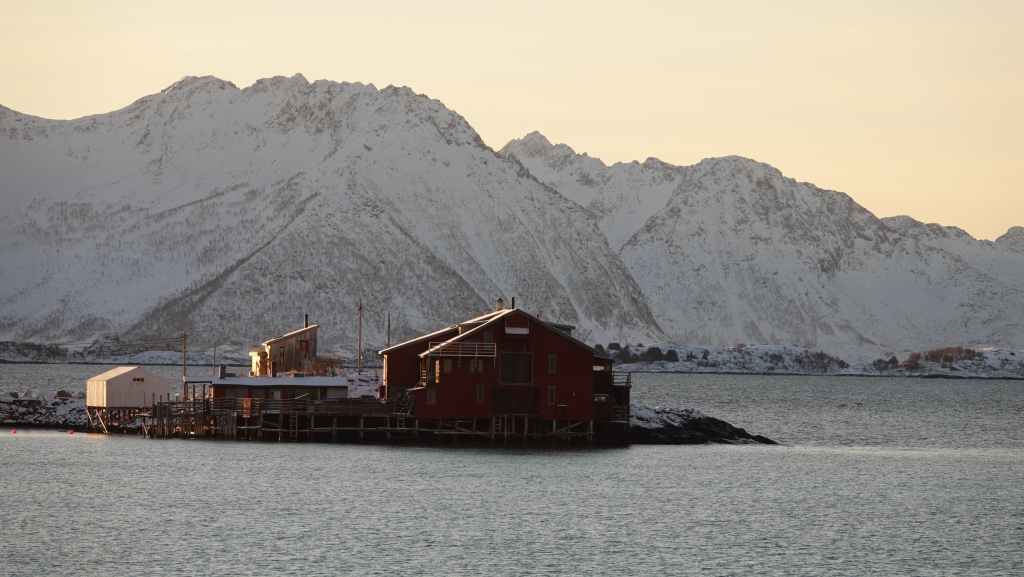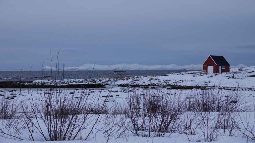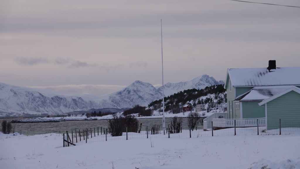 Nous franchissons le Finnfjord par un grand viaduc, très commun en Norvège. Nous sommes désormais sur l’île de Senja, deuxième plus grande île du pays. Le GPS nous emmène directement à notre second logement, à Brygghaugen, par des petites routes bien enneigées. Nous découvrons notre petite maison de couleur rouge de Falun, typique de Scandinavie. Cette fois, la maison est toute proprette avec un « bienvenue » en français et une boîte de crêpes roulées faites maison. Pas totalement rénovée, la maison reste très agréable et nous nous y sentons tout de suite chez nous : maison un peu isolée, silence royal et paysage simple mais authentique.