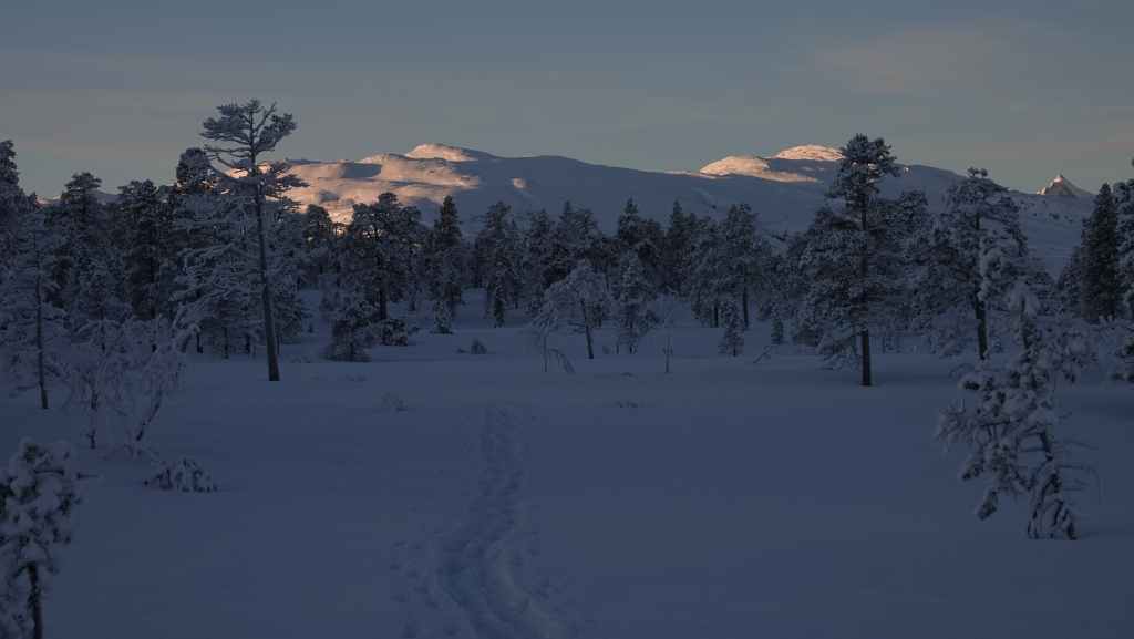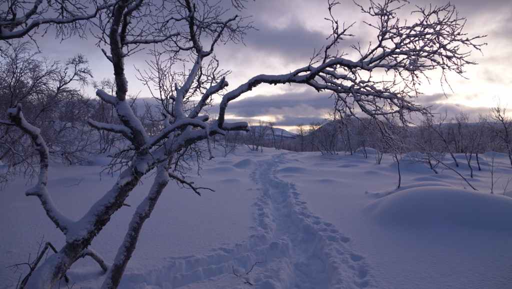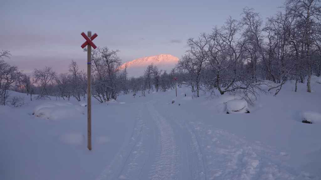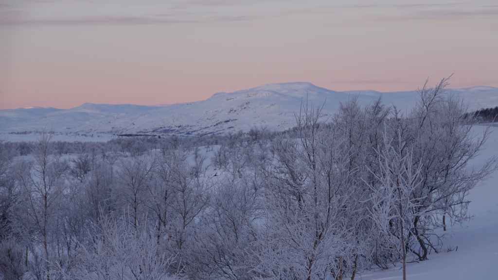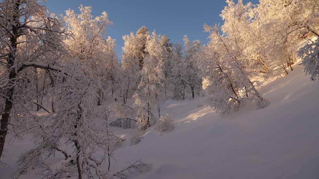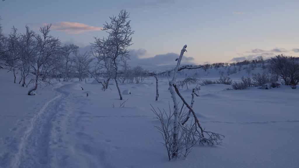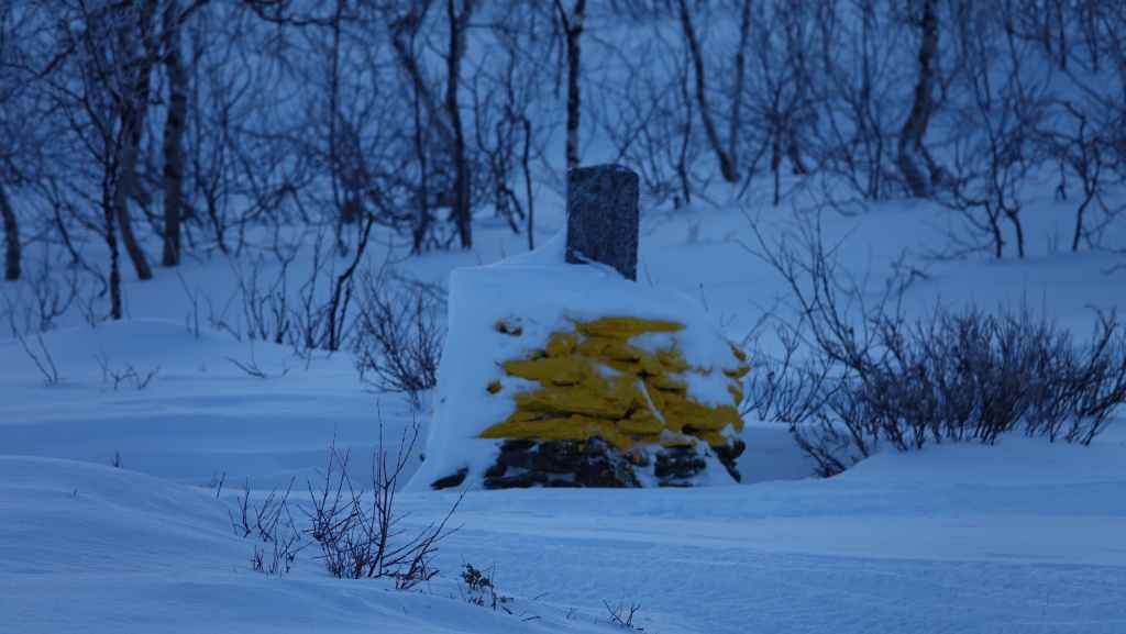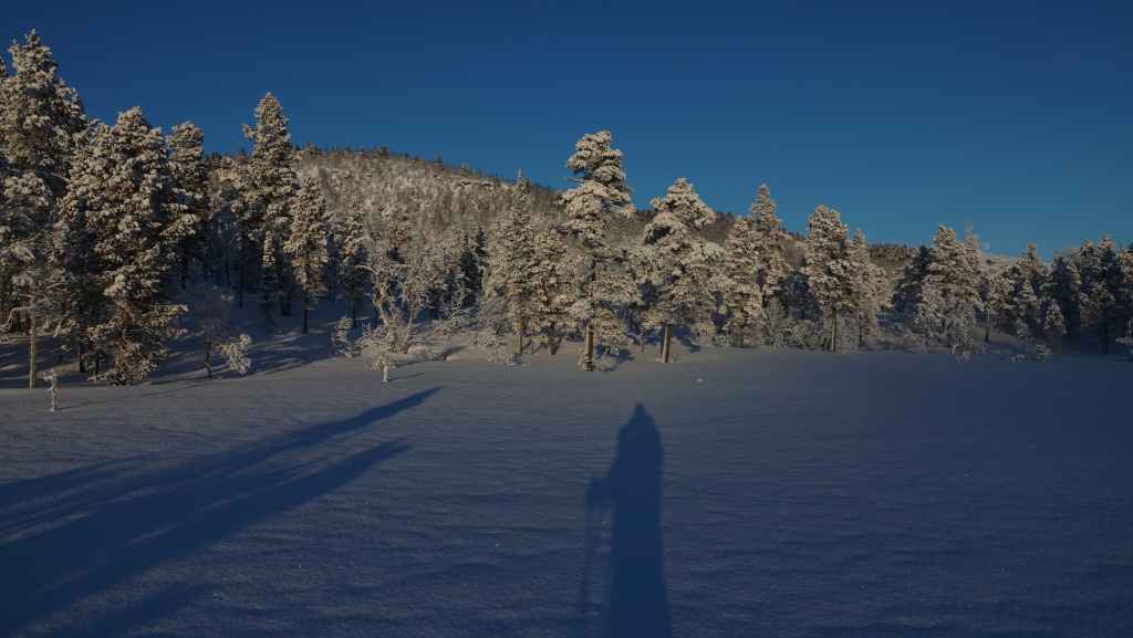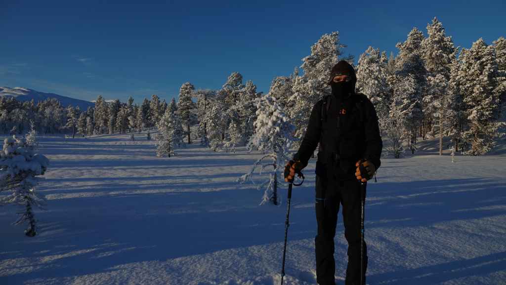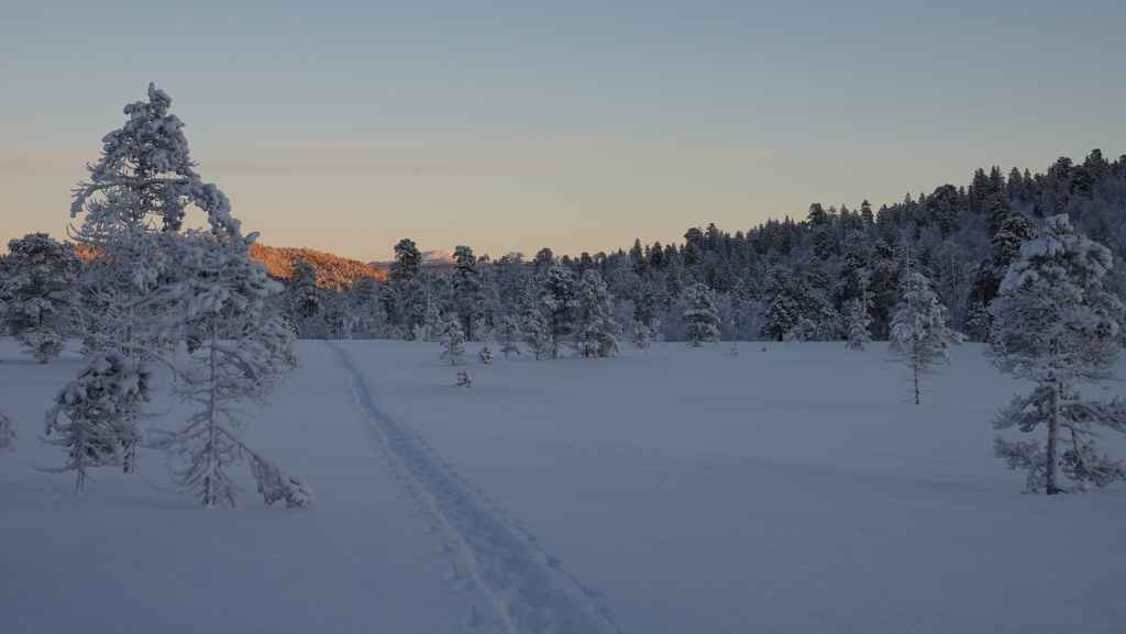 Au début, le froid est vif mais correct (-20°C), mais en s’enfonçant dans les terres, celui-ci devient plus piquant et nous prend aux poumons, en nous faisant toussoter. Plus loin dans, ce sont les poils qui givrent : on atteint probablement les -25°C… On enfile donc nos passe-montagnes sous nos bonnets ! Au début, il y a quelques panonceaux de direction puis plus rien. C’est avec le smartphone (qui fonctionne encore) et l’application de l’IGN norvégien que nous nous dirigeons. Nous traversons des forêts de bouleaux et de pins à crochets en croisant ça et là des traces fraîches et des laissées d’élan.
