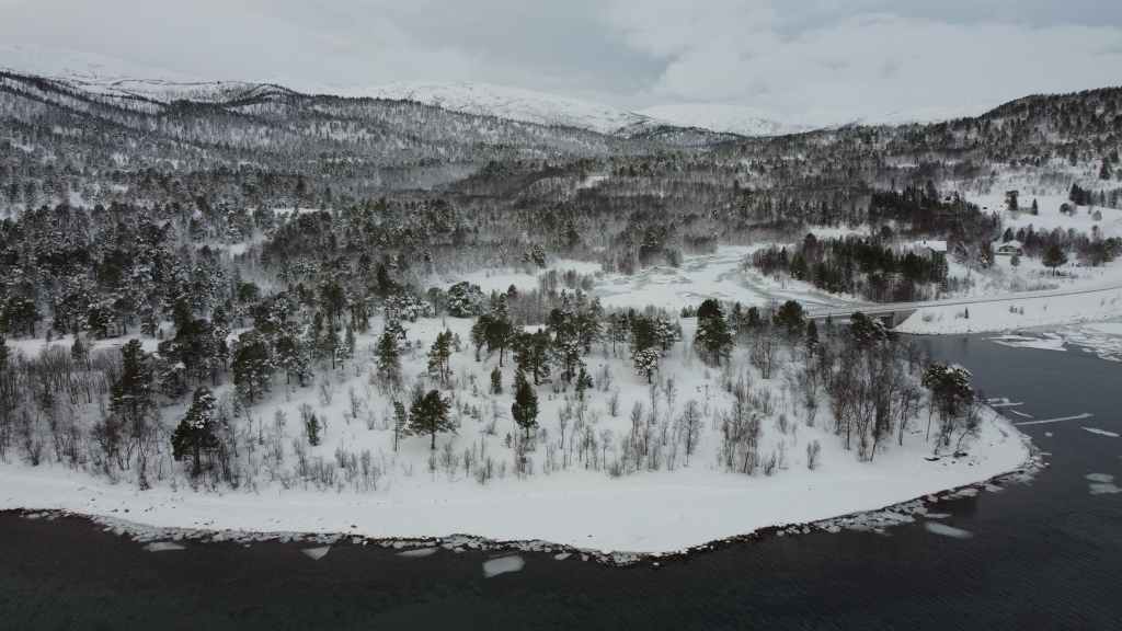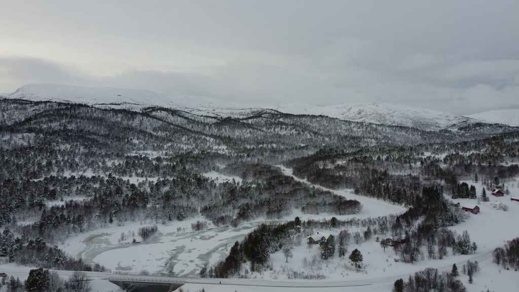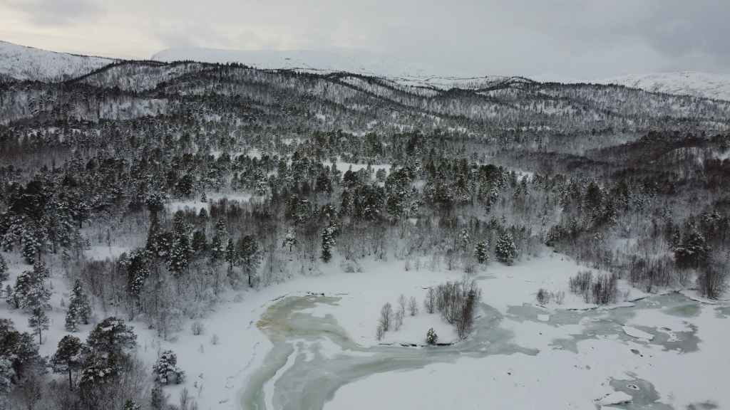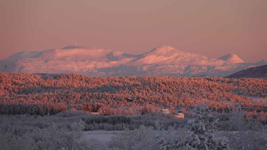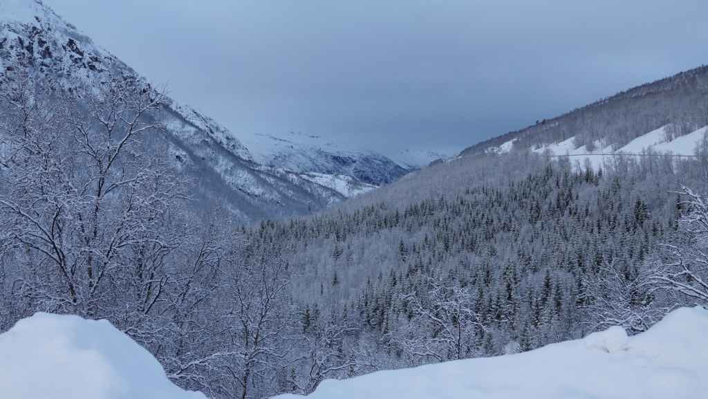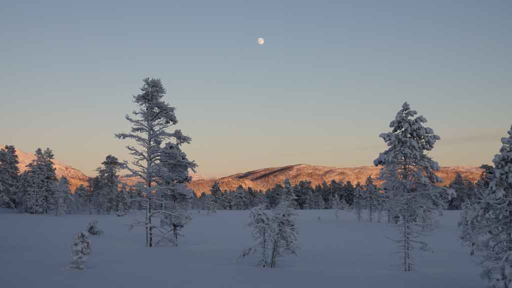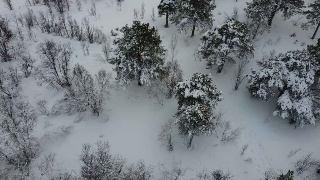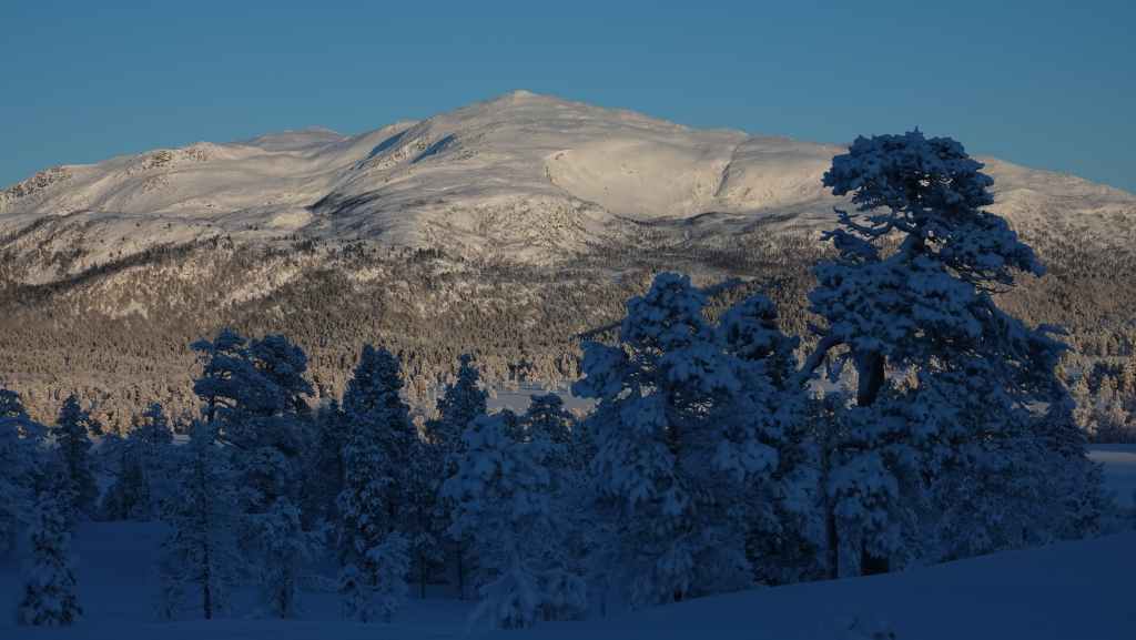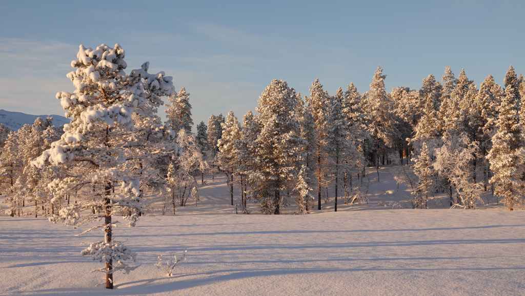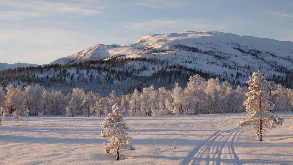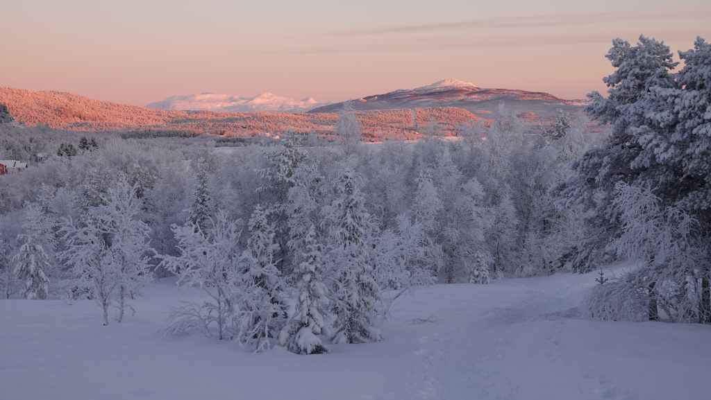 Au début, le froid est vif mais correct (-20°C), mais en s’enfonçant dans les terres, celui-ci devient plus piquant et nous prend aux poumons, en nous faisant toussoter. Plus loin dans, ce sont les poils qui givrent : on atteint probablement les -25°C… On enfile donc nos passe-montagnes sous nos bonnets ! Au début, il y a quelques panonceaux de direction puis plus rien. C’est avec le smartphone (qui fonctionne encore) et l’application de l’IGN norvégien que nous nous dirigeons. Nous traversons des forêts de bouleaux et de pins à crochets en croisant ça et là des traces fraîches et des laissées d’élan.