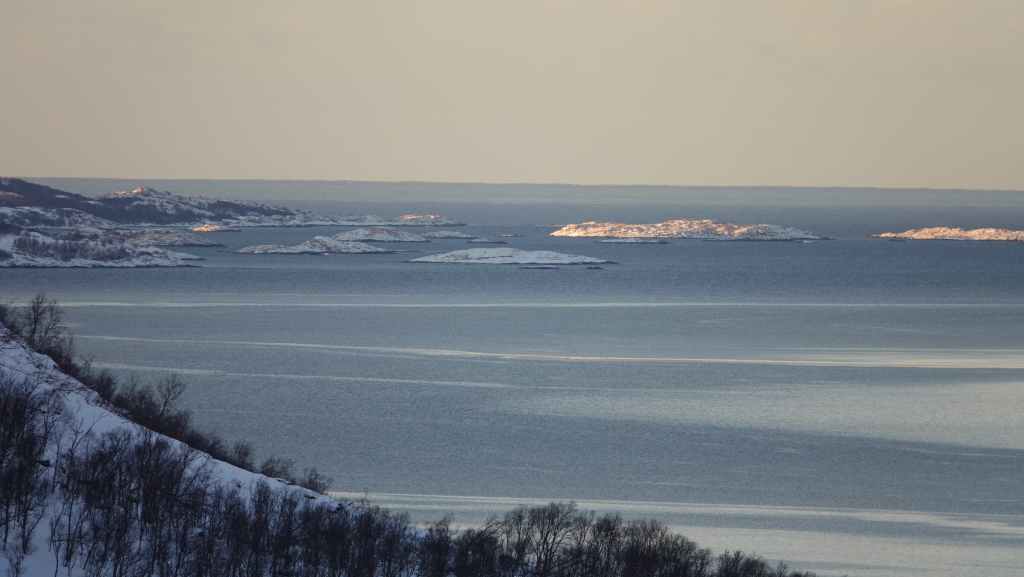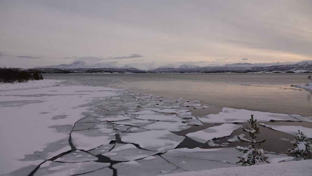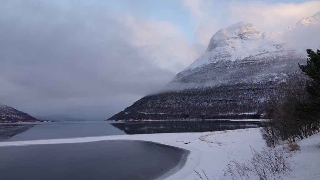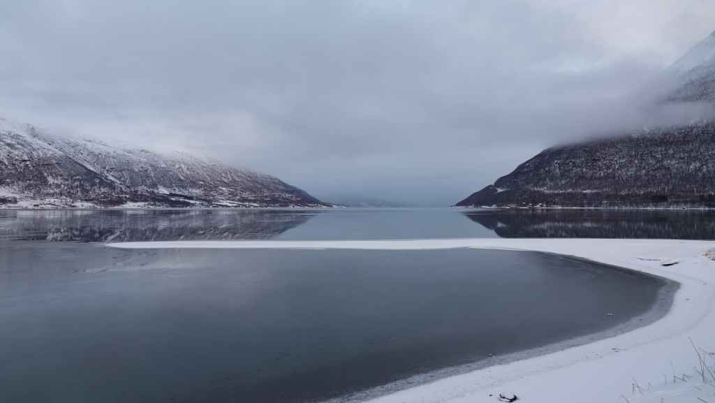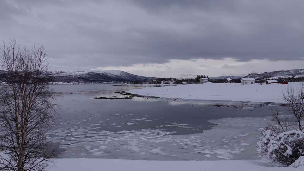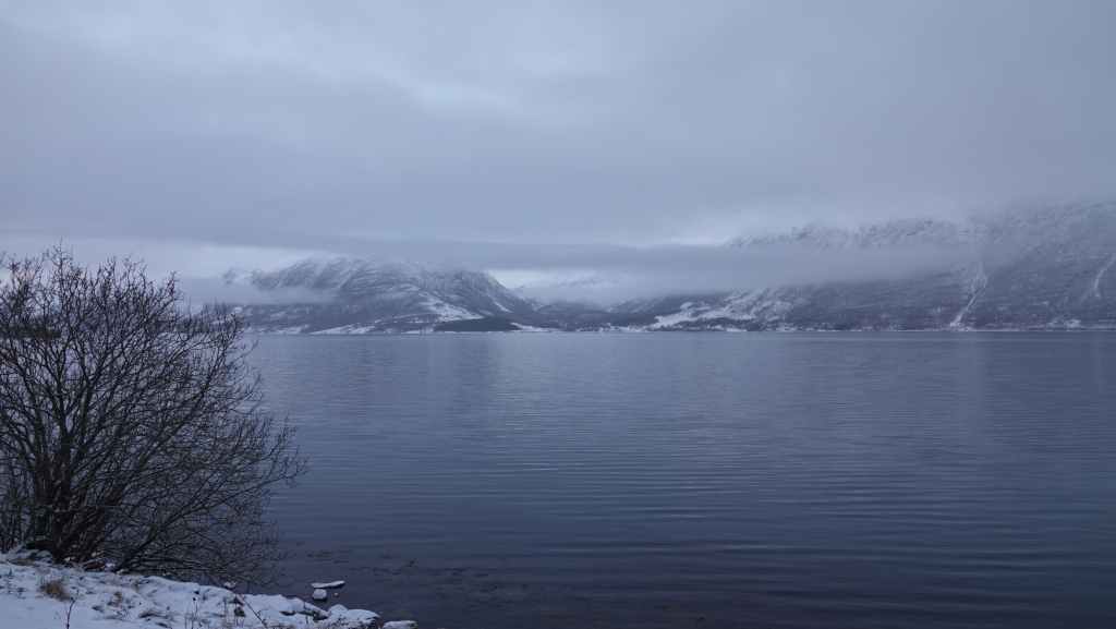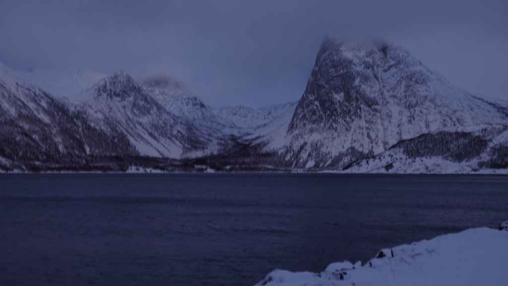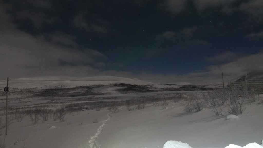 En soirée, bien que le ciel se charge de nuage, nous tentons une nouvelle chasse aux aurores. Nous allons jusqu’à Hamn, mais l’épaisse couche nuageuse qui recouvre la mer de Norvège, nous stoppe dans notre quête. La température est remontée à 0°C et annonce de prochaines chûtes de neige.