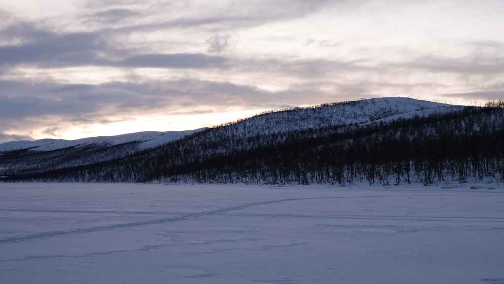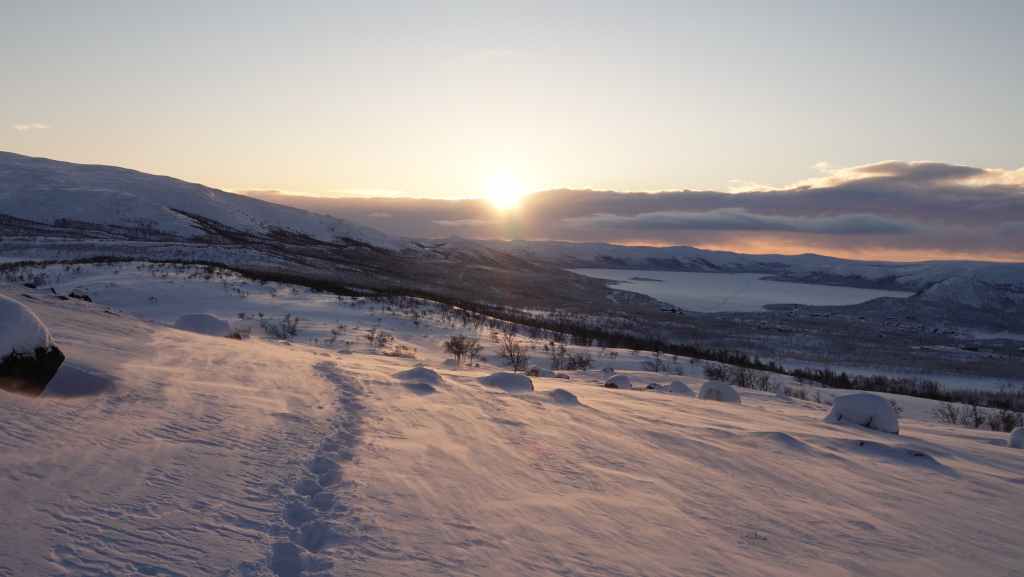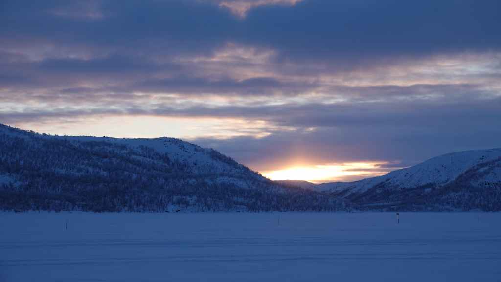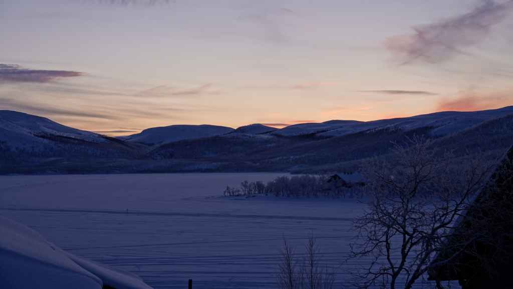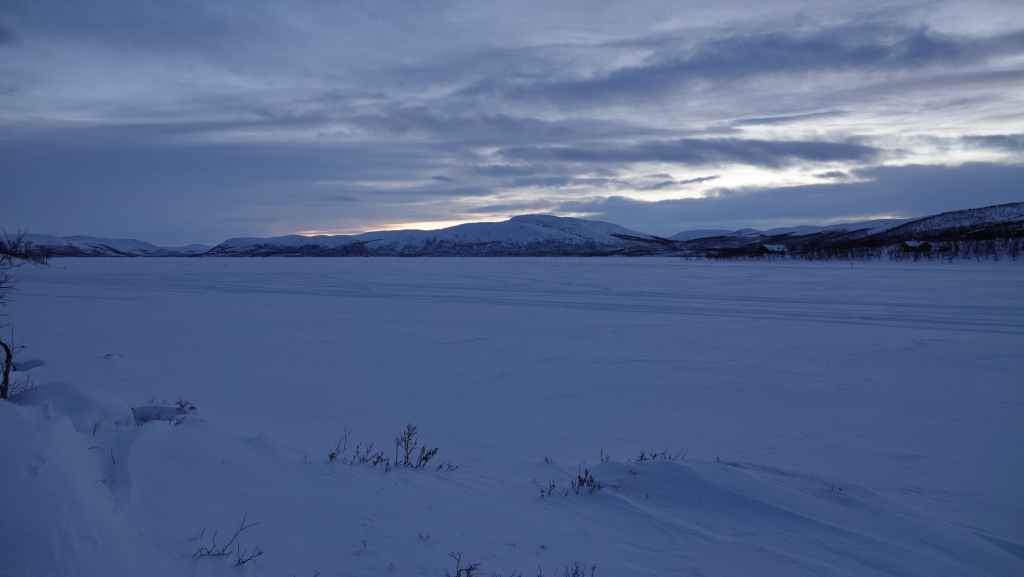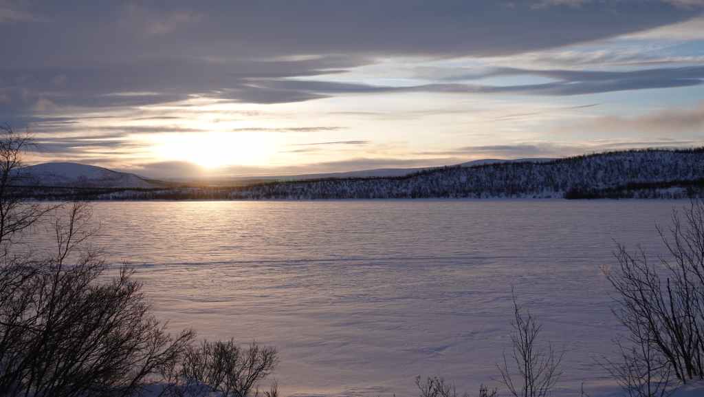 Nous redescendons déjeuner à l’appartement puis entamons le grand ménage afin de s’y sentir bien. Ce logement agréable (une fois propre) est bien situé, dans un petit lotissement de chalets en fustes (bois ronds) surtout habités de Norvégiens. Nous avons la vue sur le lac Kilpisjärvi, grand lac qui fait la frontière avec la Suède. Vers 15h30, au coucher du soleil, nous partons sur le lac pour une petite balade en raquettes… Nous finissons à la nuit tombante vers 16h45.