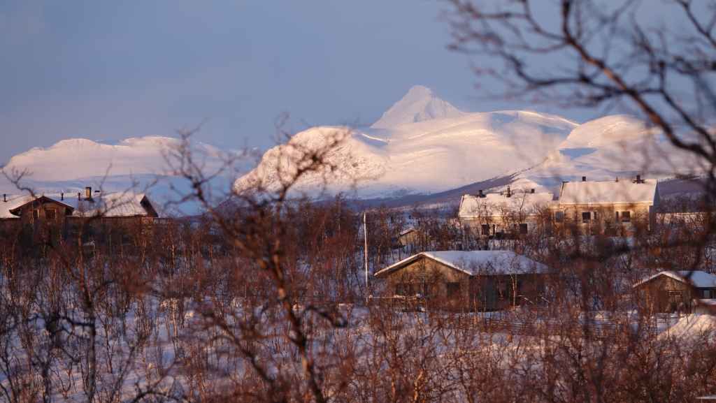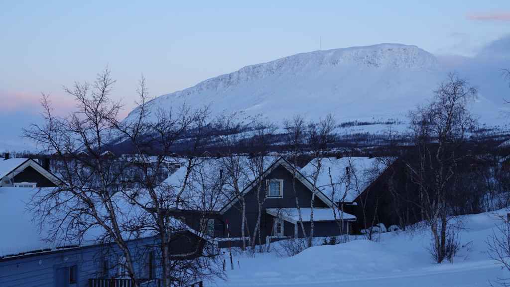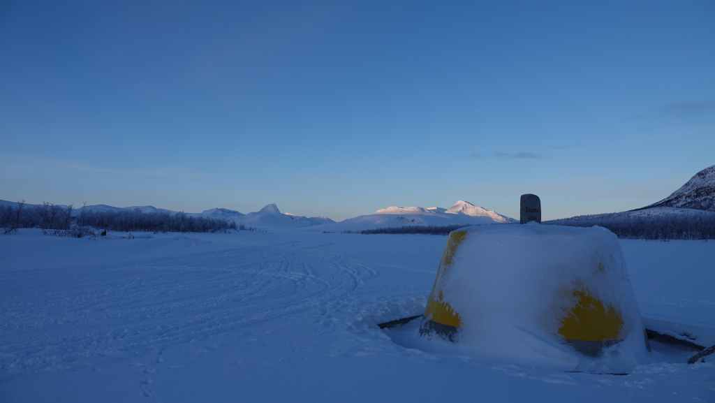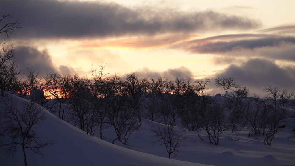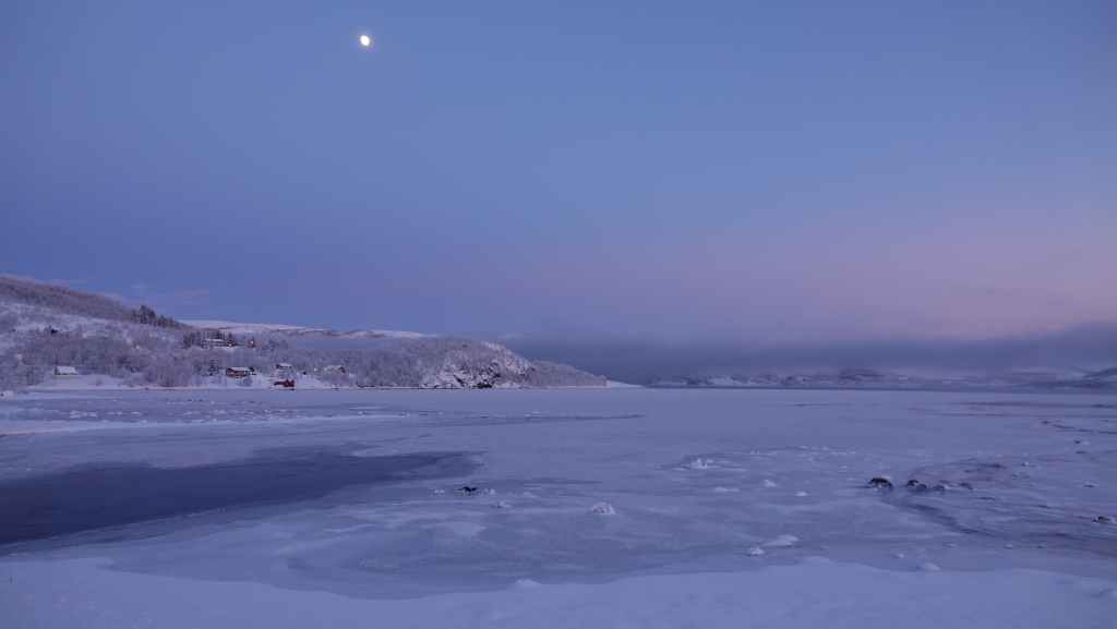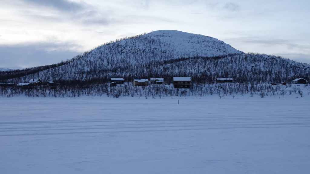 Nous redescendons déjeuner à l’appartement puis entamons le grand ménage afin de s’y sentir bien. Ce logement agréable (une fois propre) est bien situé, dans un petit lotissement de chalets en fustes (bois ronds) surtout habités de Norvégiens. Nous avons la vue sur le lac Kilpisjärvi, grand lac qui fait la frontière avec la Suède. Vers 15h30, au coucher du soleil, nous partons sur le lac pour une petite balade en raquettes… Nous finissons à la nuit tombante vers 16h45.