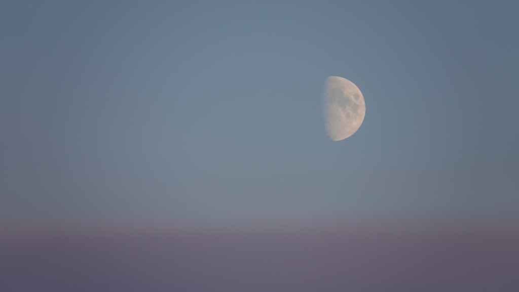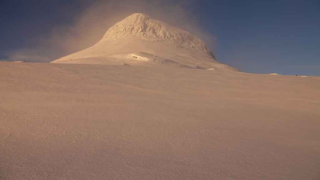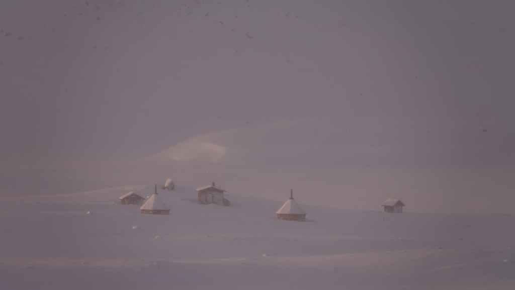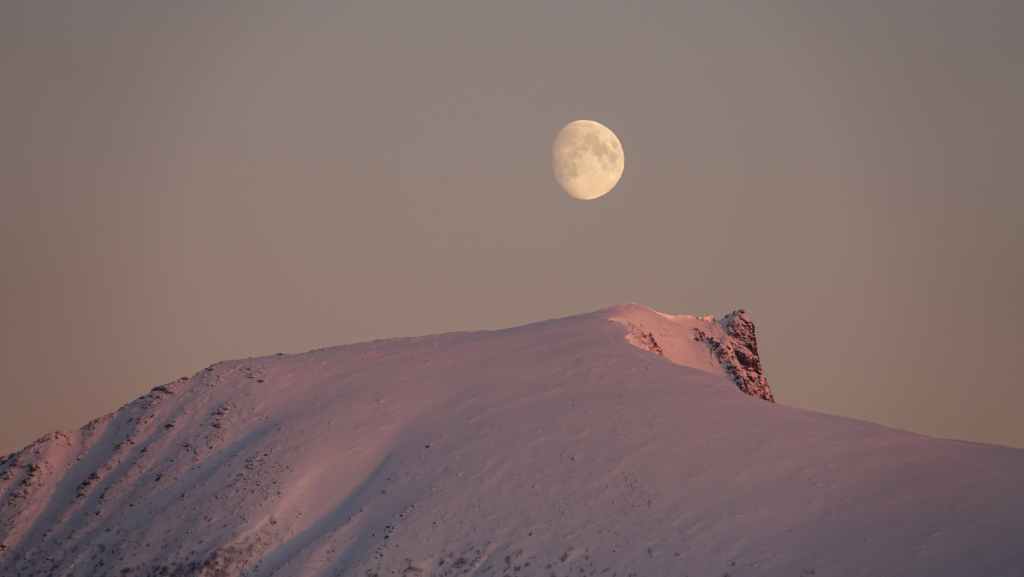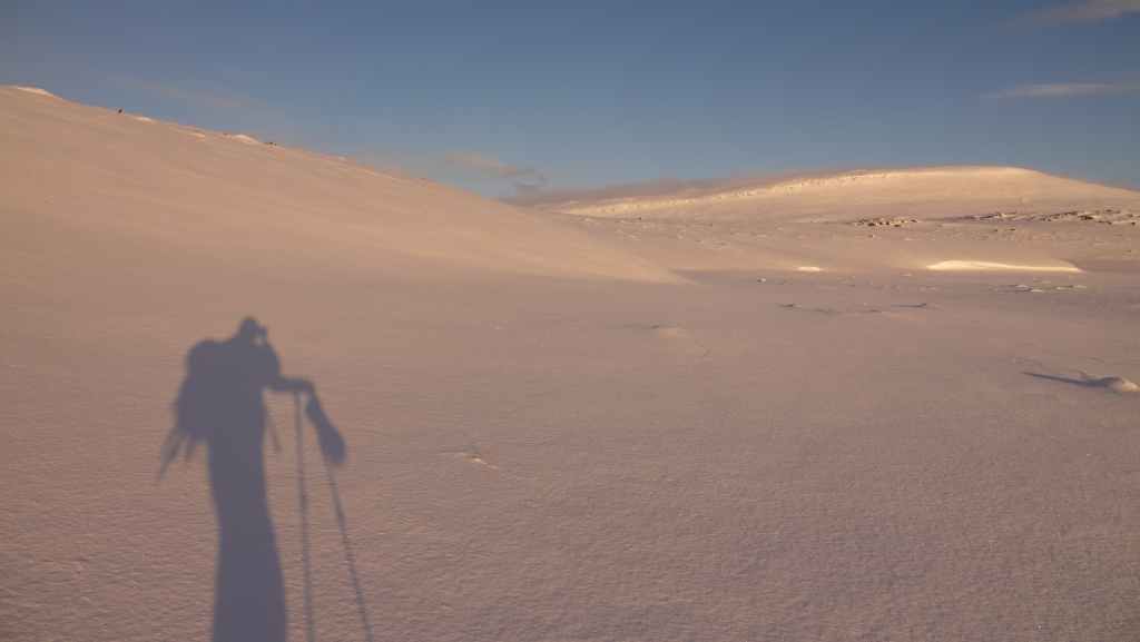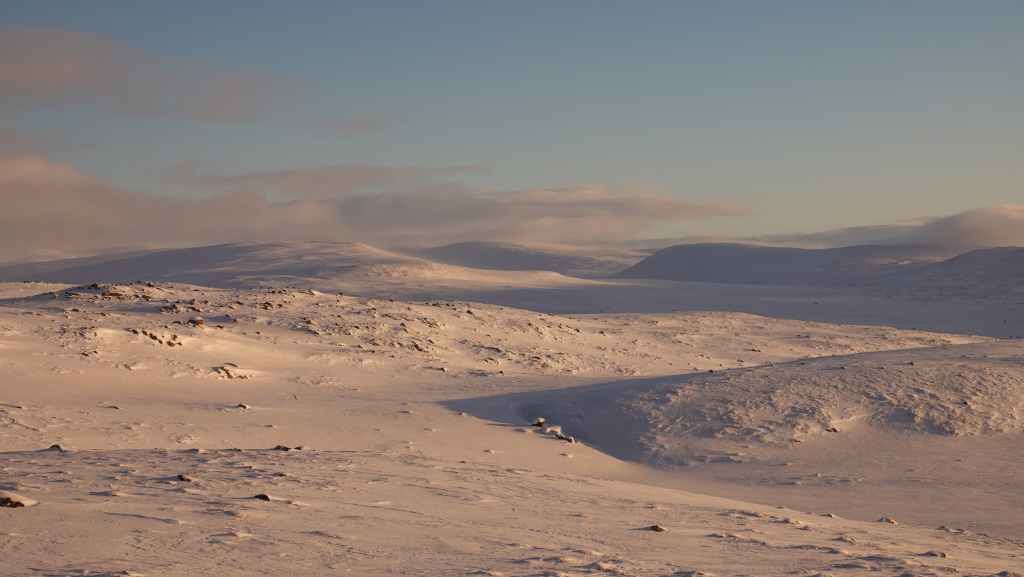 Je repars 1 heure après et traverse la piste de motoneige (que nous aurions dû suivre la veille si on était arrivés jusque-là) pour m’enfoncer dans la toundra… l’ambiance est fabuleuse : silence total et que du blanc autour de moi, des collines enneigées qui se perdent un temps dans les nuages…. Je pourrais m’imaginer sur la calotte glaciaire du pôle Nord si la température était nettement plus froide ! Pas de trace d’avion dans le ciel juste la lune présente tous les jours, pas d’oiseau, rien…
