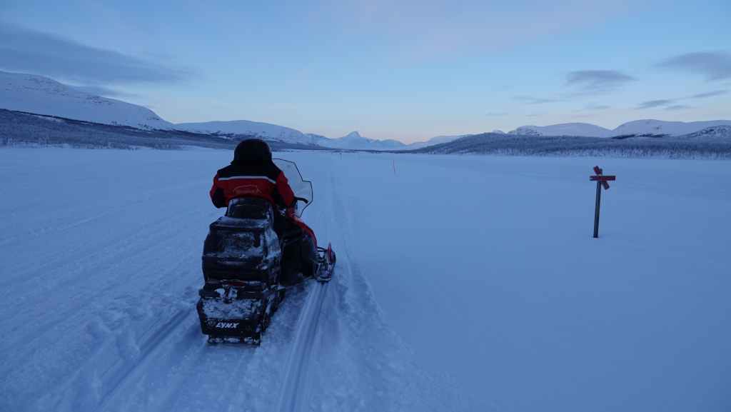 Aujourd’hui, c’est la grande aventure car nous avons réservé une journée de motoneige pour effectuer, en indépendant (donc sans guide), une boucle d’une centaine de kilomètres. Ce matin, il fait très beau mais la température est de – 25°C !!! Heureusement, nous avions réservé chez Kilpissafarit, avec la motoneige, des tenues chaudes (combinaison, bottes et gants chauds). Nous les enfilons par dessus nos tenues persos déjà bien chaudes. Nous ressemblons à 2 bibendums Michelin ! La personne qui nous équipe nous explique le fonctionnement de la machine et nous déconseille le tour que j’avais prévu, trop technique pour nous. Sur ces conseils, nous décidons de nous rendre au cairn des 3 frontières, au bout du lac Kilpisjärvi. Nous traversons le lac sans encombre… les couleurs du lever du jour sont magnifiques avec des teintes roses inédites.