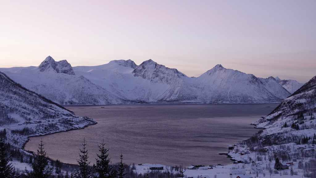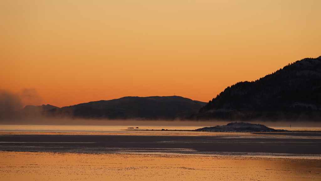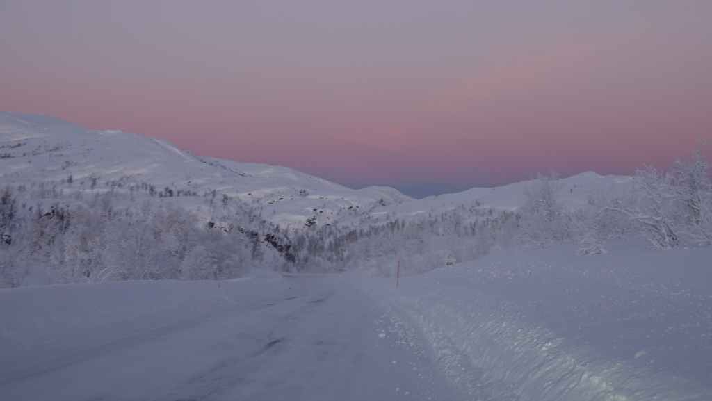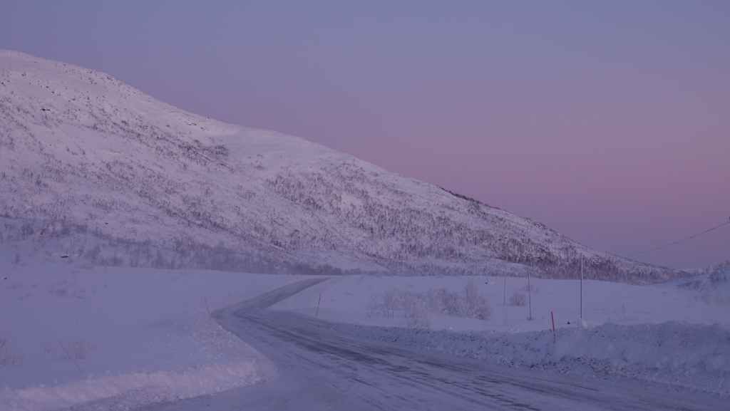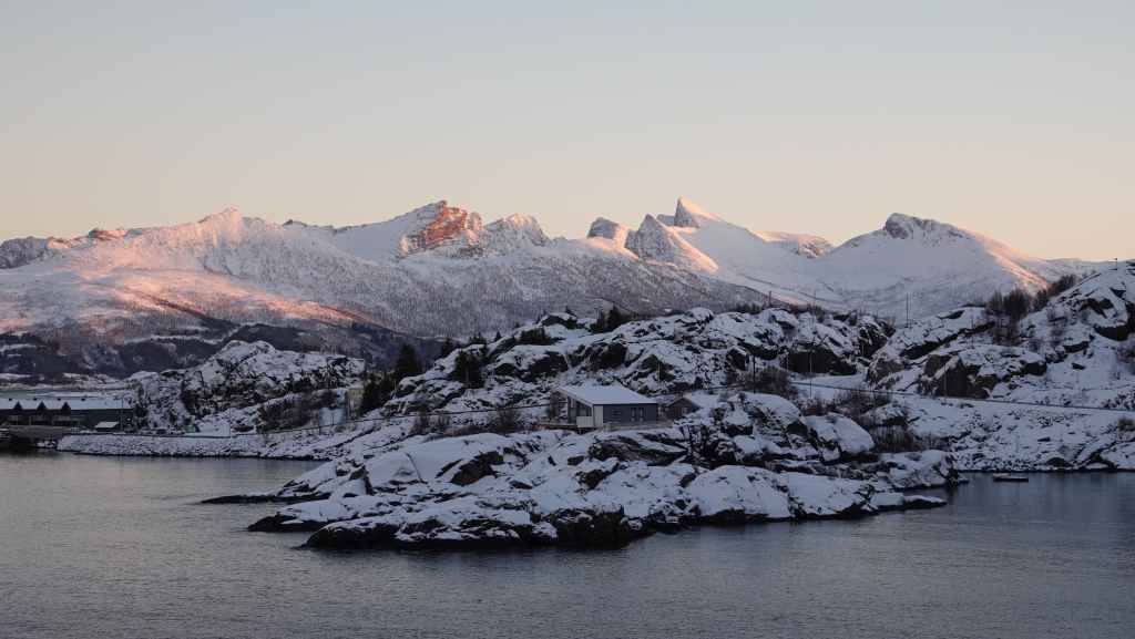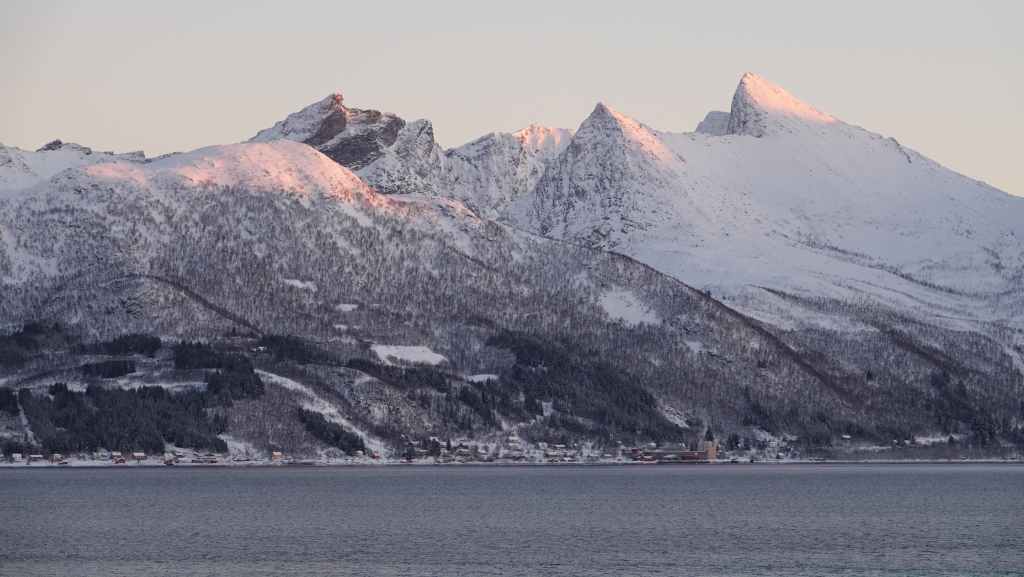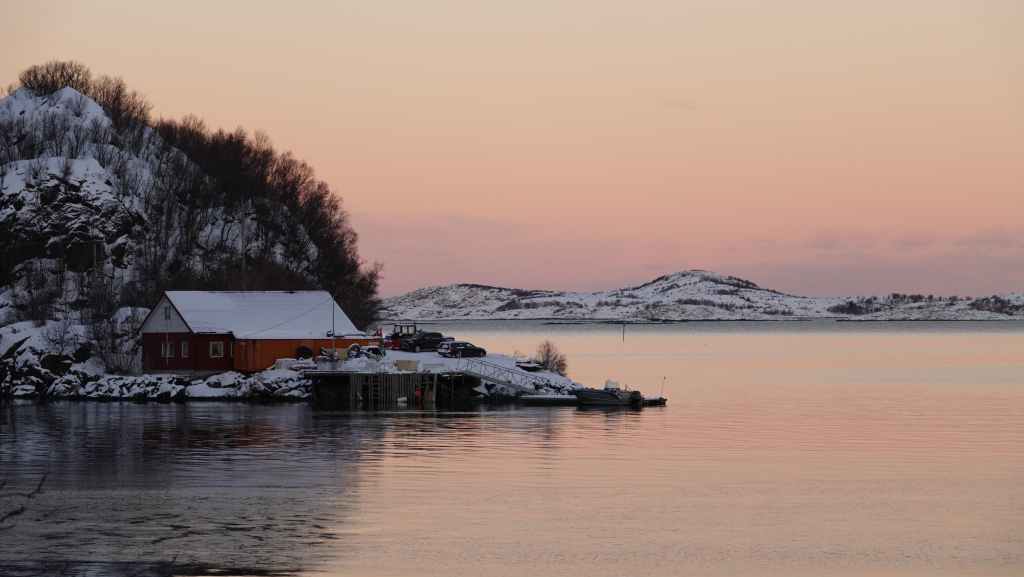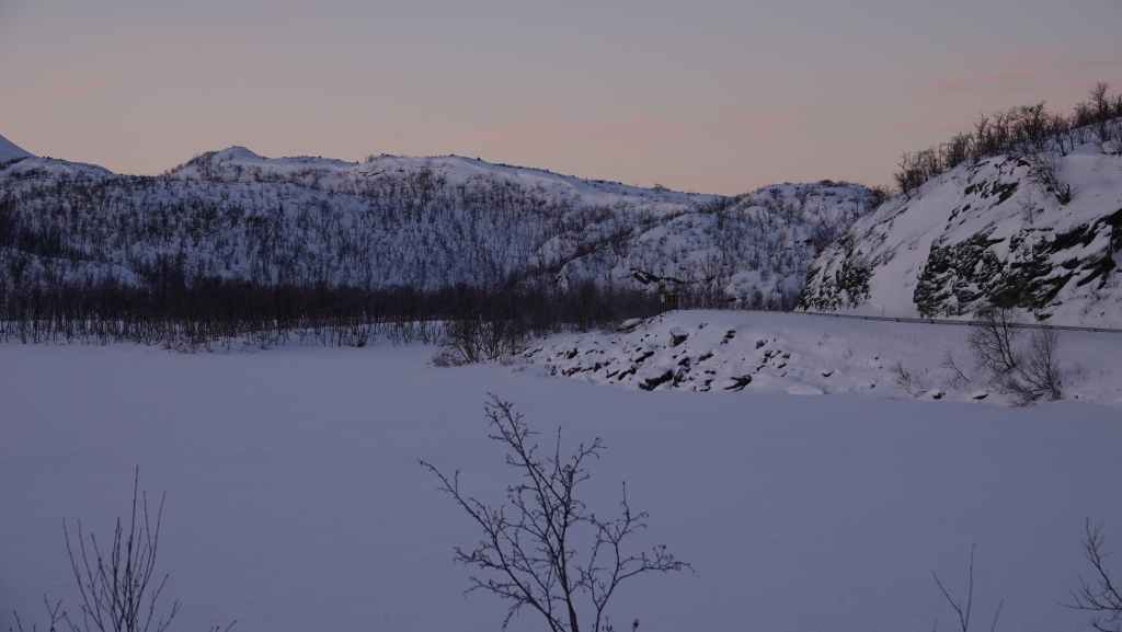Nous longeons de magnifiques fjords, traversons plusieurs tunnels, et passons quelques cols avant de rejoindre l’est de l’île. Nous nous arrêtons également à Tungeneset (les dents du diable). La nuit commence à tomber et du coup, plus rien à voir, hormis les belles couleurs rosées du soir, en haut du fjord Stønesbotn… à 16h00 !