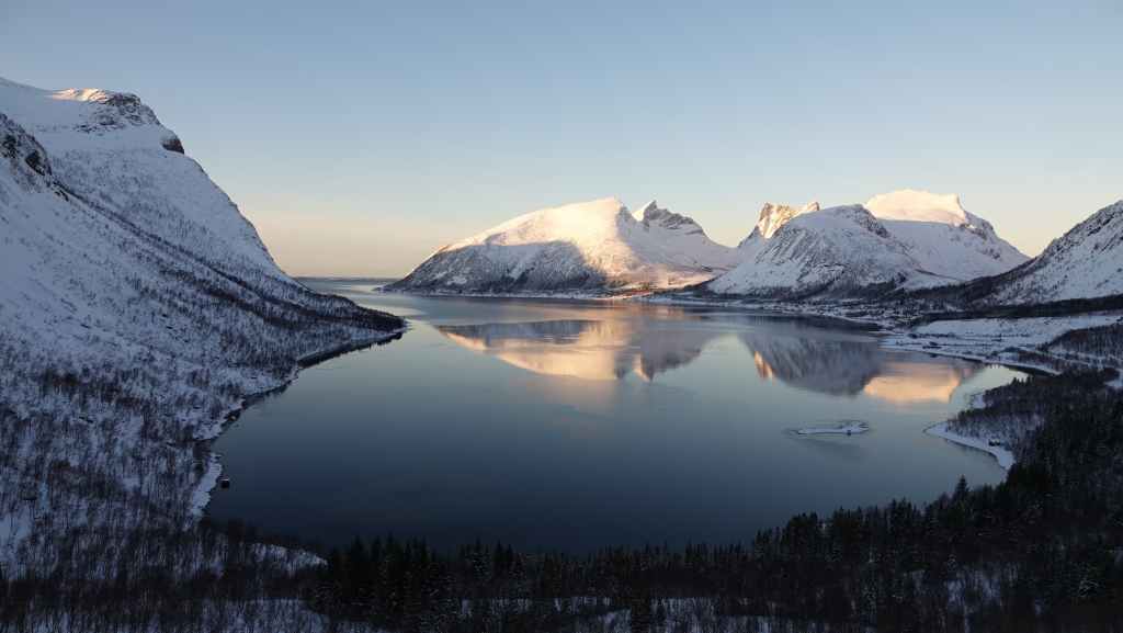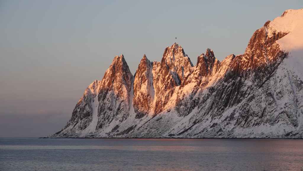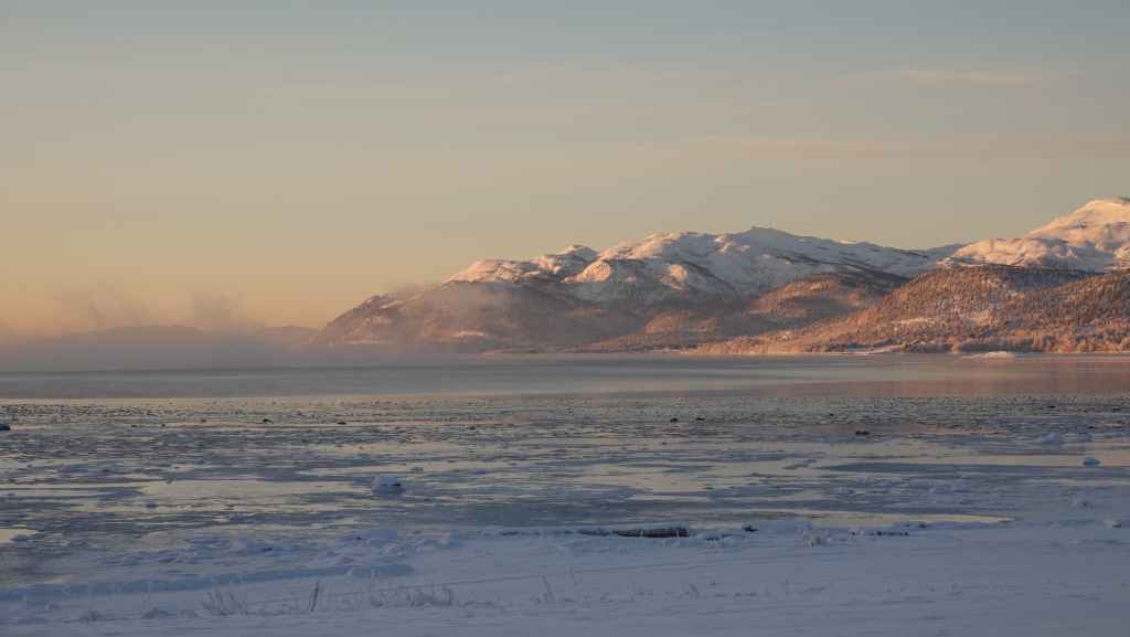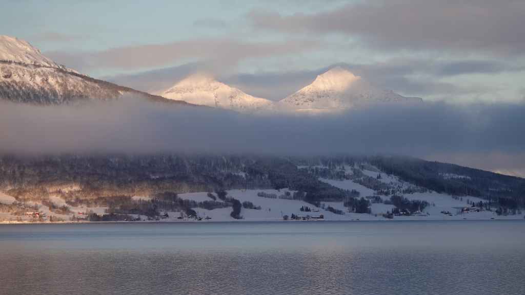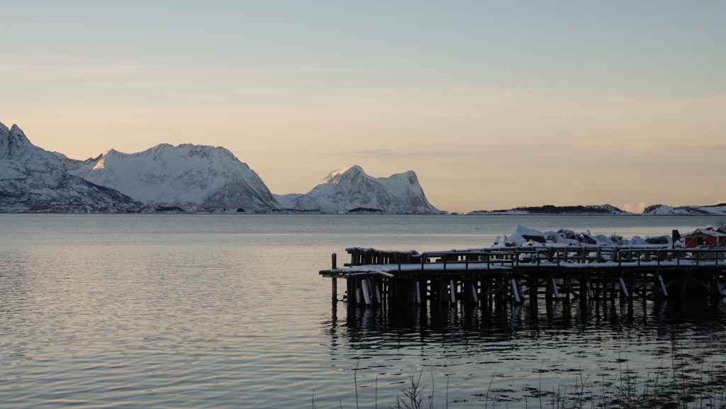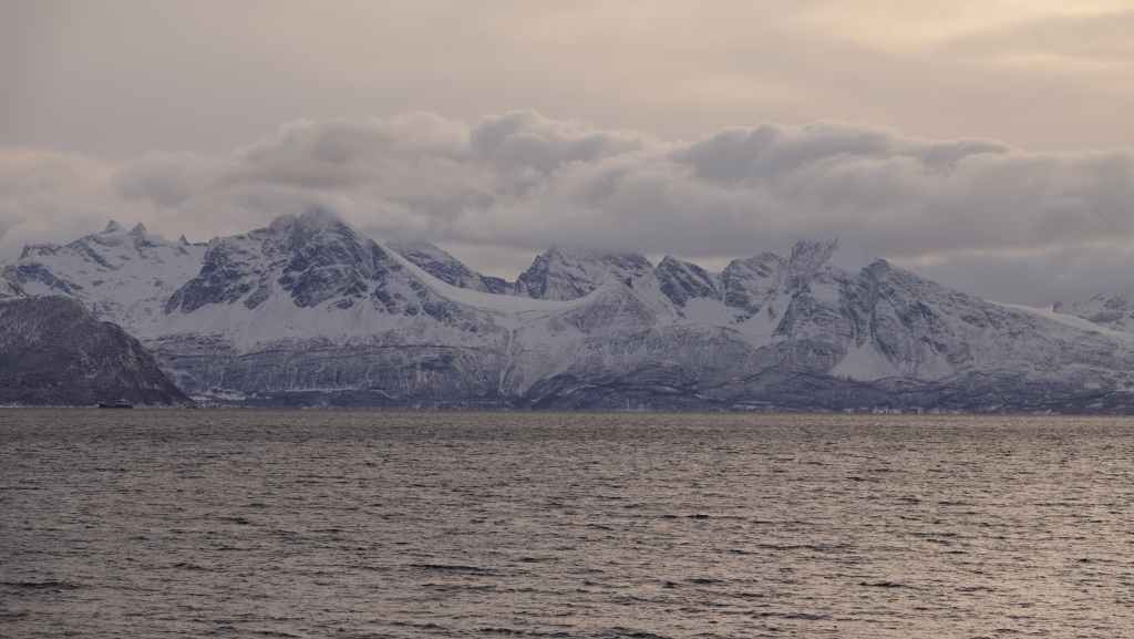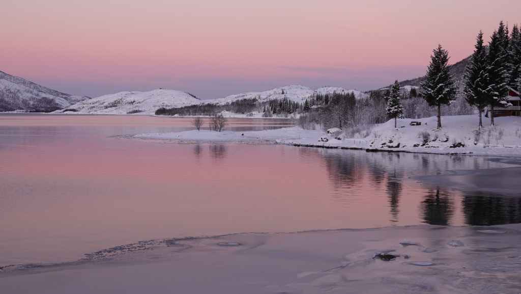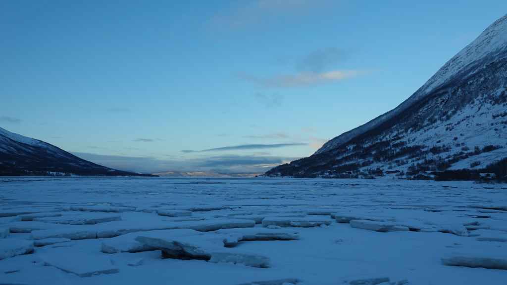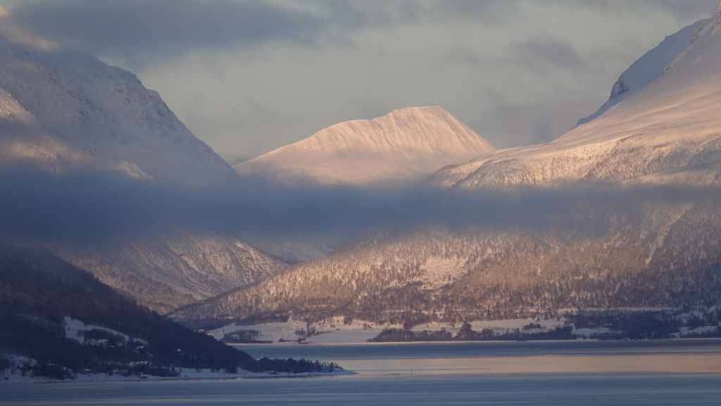 Nous longeons de magnifiques fjords, traversons plusieurs tunnels, et passons quelques cols avant de rejoindre l’est de l’île. Nous nous arrêtons également à Tungeneset (les dents du diable). La nuit commence à tomber et du coup, plus rien à voir, hormis les belles couleurs rosées du soir, en haut du fjord Stønesbotn… à 16h00 !
