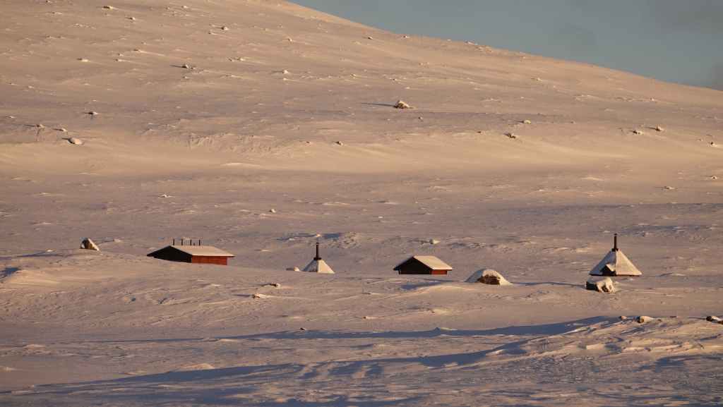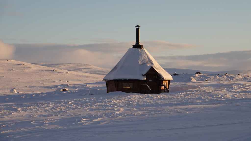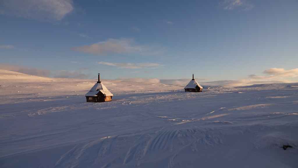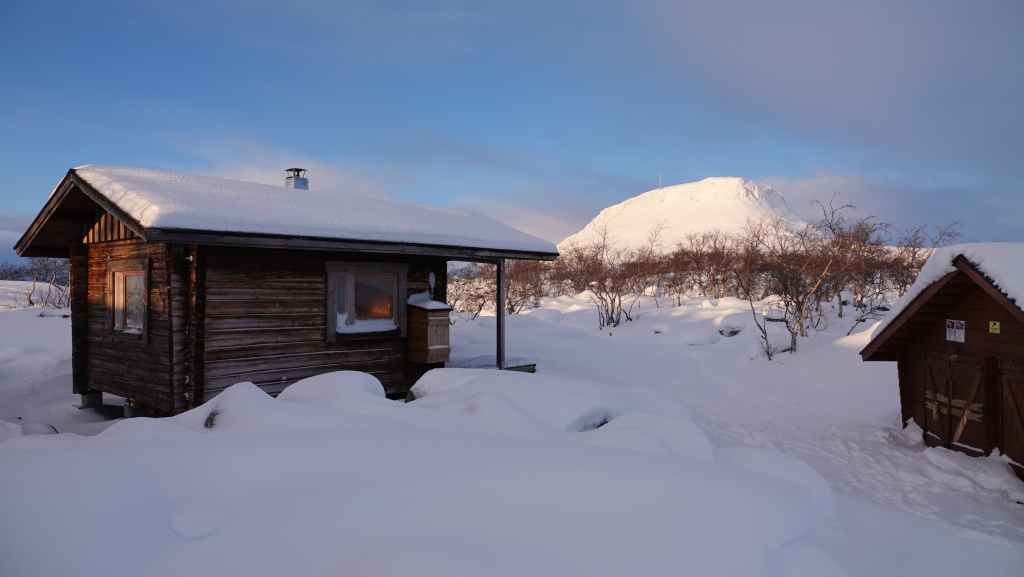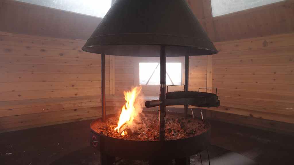L’ensoleillement peine à réchauffer, d’autant que l’astre solaire effleure les sommets suédois… Vers midi, je passe sous la falaise sud du Mont Saana, après avoir traversé le petit lac Saanajärvenlompolo. Puis j’aperçois un groupement de cabanes au bord du lac Saanajärvi. Il y a un baraquement avec 5 toilettes sèches, 2 petits cabanons fermés à clé et 2 kotas : ce sont des petites cabanes hexagonales avec à l’intérieur un braséro, et un petit peu de bois de chauffage, et des banc fixés au pourtour de la construction. Je m’installe dans le second pour mon repas. Même si la température intérieure est très fraîche, il y fait meilleur que dehors, même au soleil. J’arrive à allumer un petit feu avec des écorces de bouleau qui s’enflamment comme du papier. Ce feu sera plus pour l’ambiance que pour la chaleur !