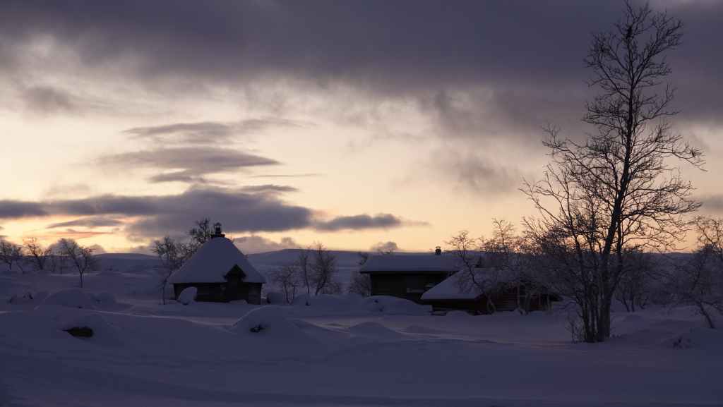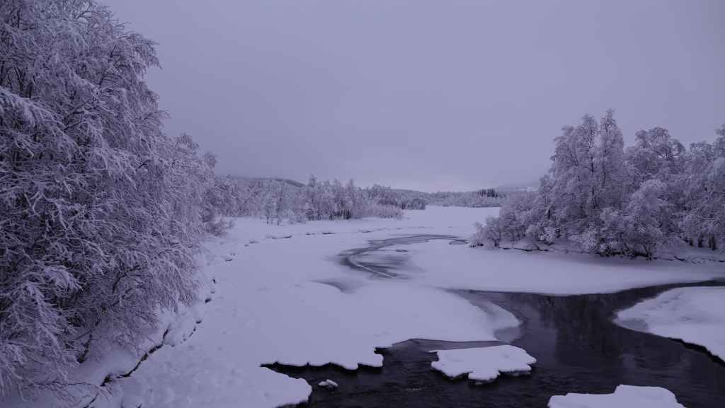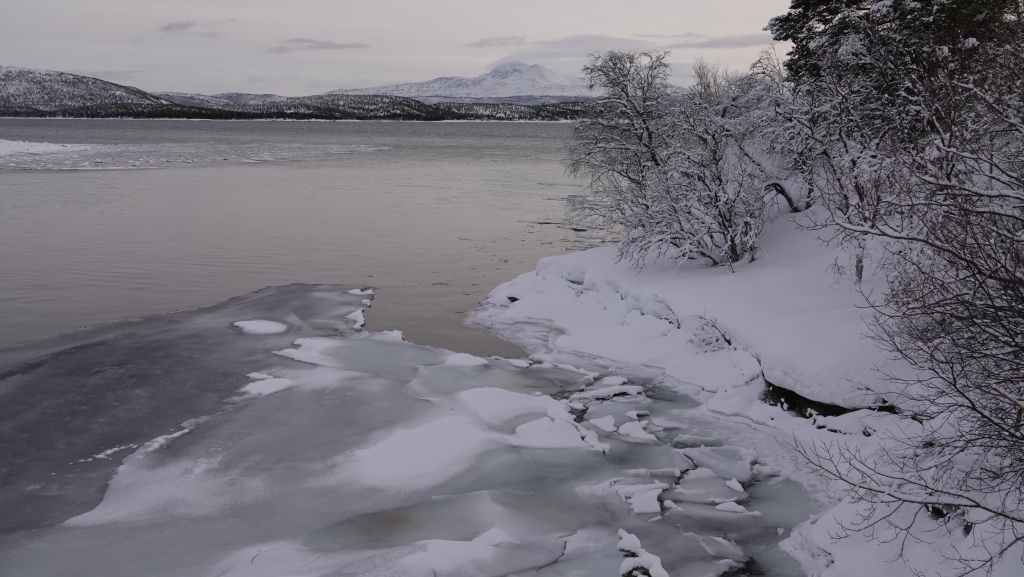 La neige est tombée cette nuit et il y a une dizaine de centimètres de poudreuse au réveil. Le ciel est couvert et quelques flocons tombent toujours. Nous décidons de repartir avec les raquettes au lac Cahkaljärvi, que nous traversons. Le temps neigeux ne nous permet pas une vue sur les montagnes environnantes. Nous redescendons à l’appartement pour le déjeuner.