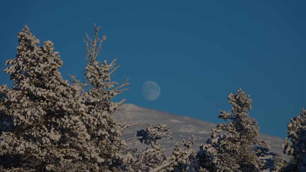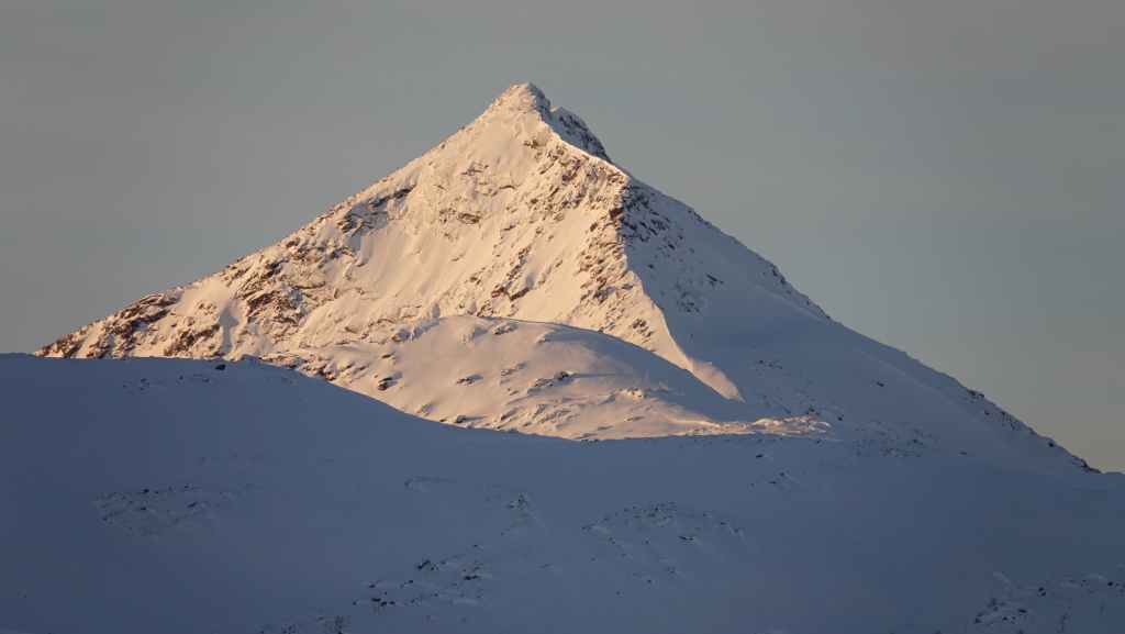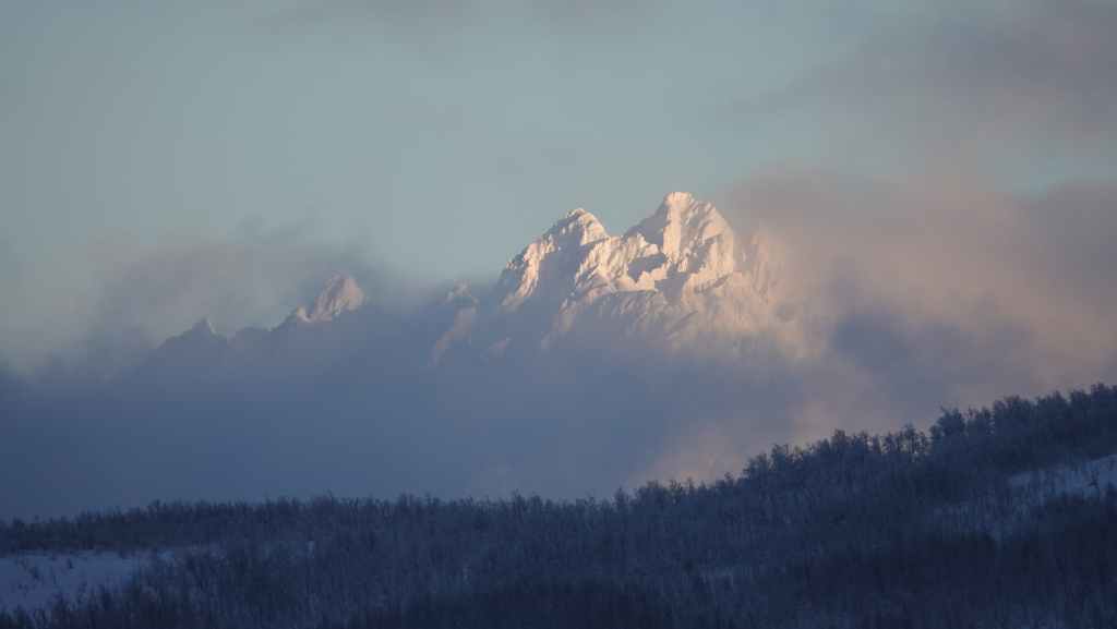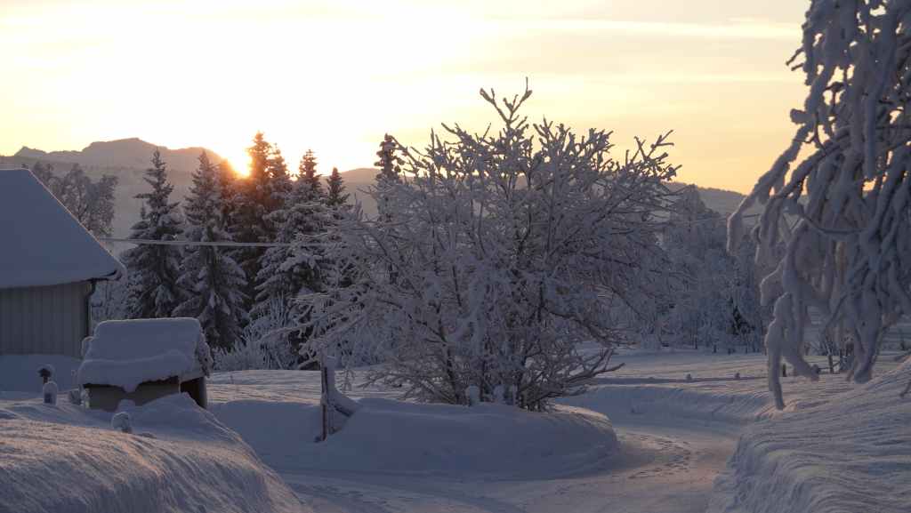 Pour ce dernier jour de janvier, je vais partir seul en randonnée raquettes. La boucle d’environ 12 km part du village et monte au pied (côté sud du Mont Saana) avant de rejoindre un kota pour pique-niquer. Il fait toujours aussi beau et le froid est moins vif (- 10°C) mais avec du vent. Je démarre à 10 heures. Le jour est bien là mais le soleil apparait un peu plus tard, en cours de montée, derrière une petite barre de nuages.