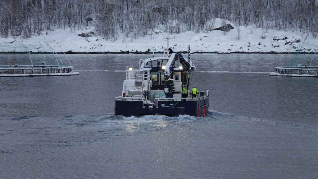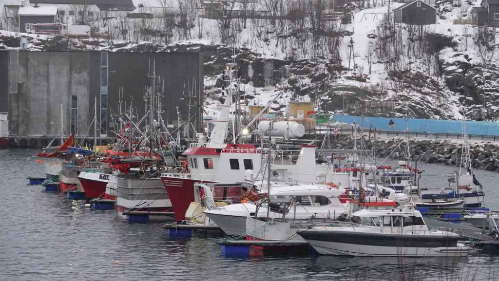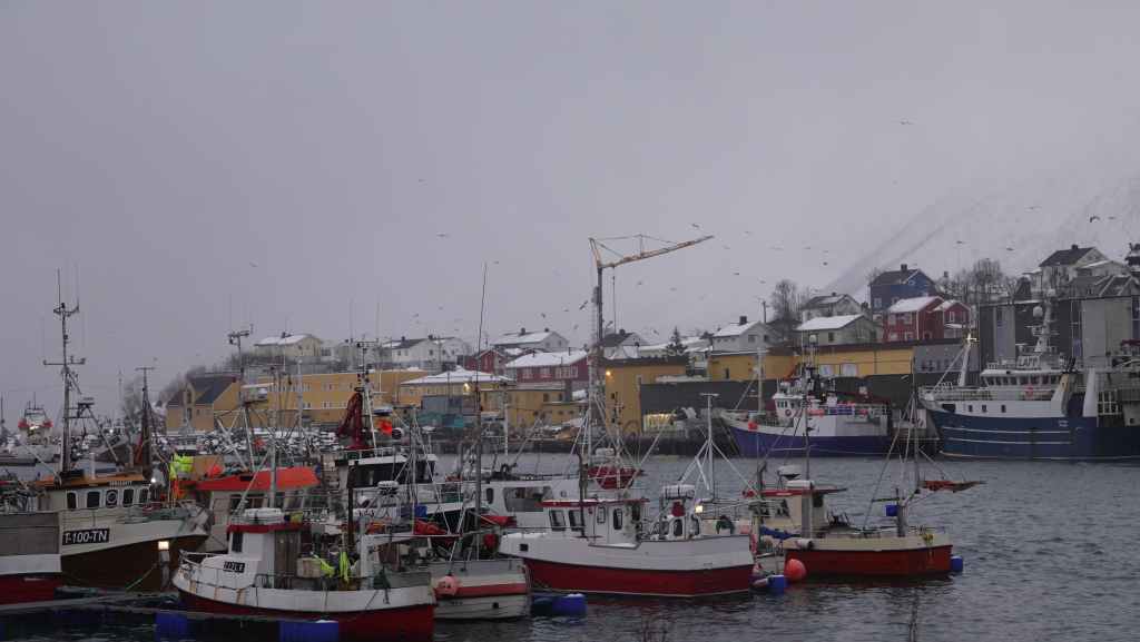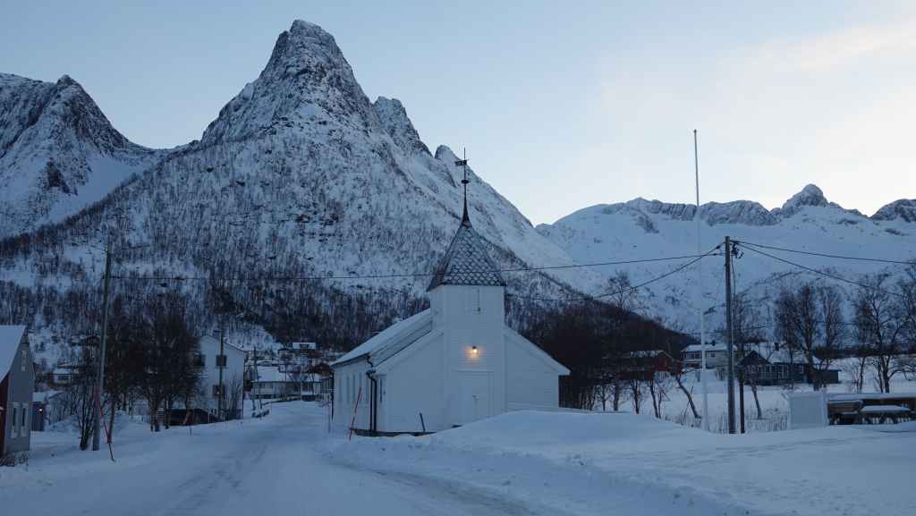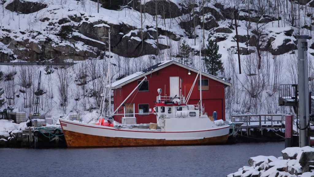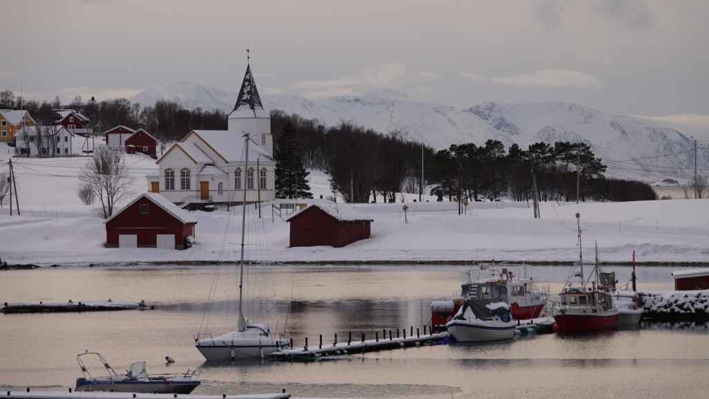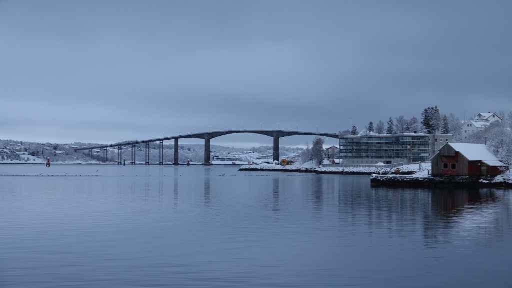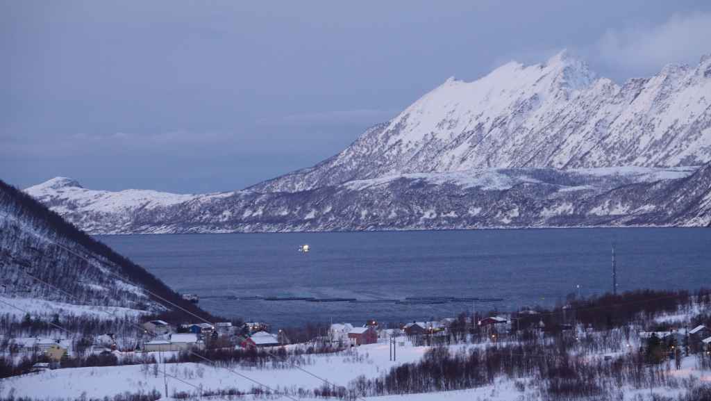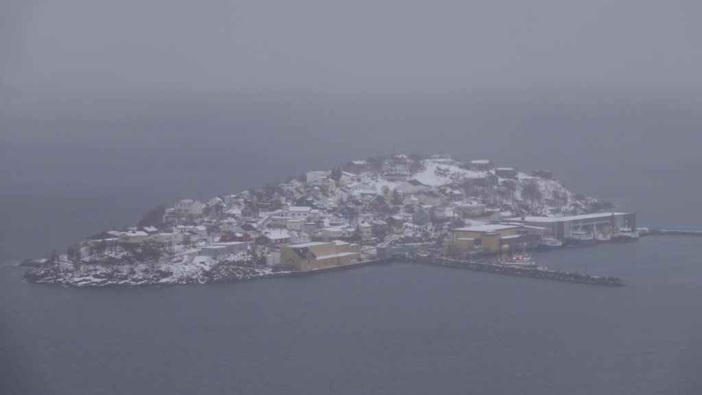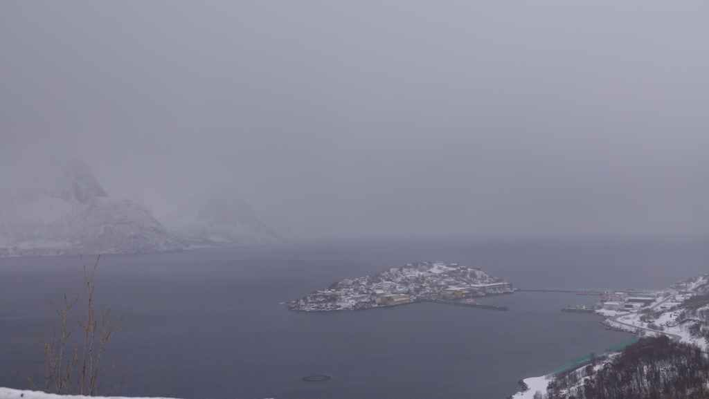 Arrivés au pied de Husøy, nous traversons en voiture la digue qui relie l’îlot à l’île principale. Celle-ci est bordée par un haut mur vert et moche qui protège la digue lors des tempêtes. Le bas du village est caché par le port et ses usines de pêcherie. La météo peu engageante ne donne pas une belle image de ce qui doit joli par temps ensoleillé. Après un petit tour dans la rue principale verglacée, nous faisons demi-tour et prenons la direction de Botnhamn.