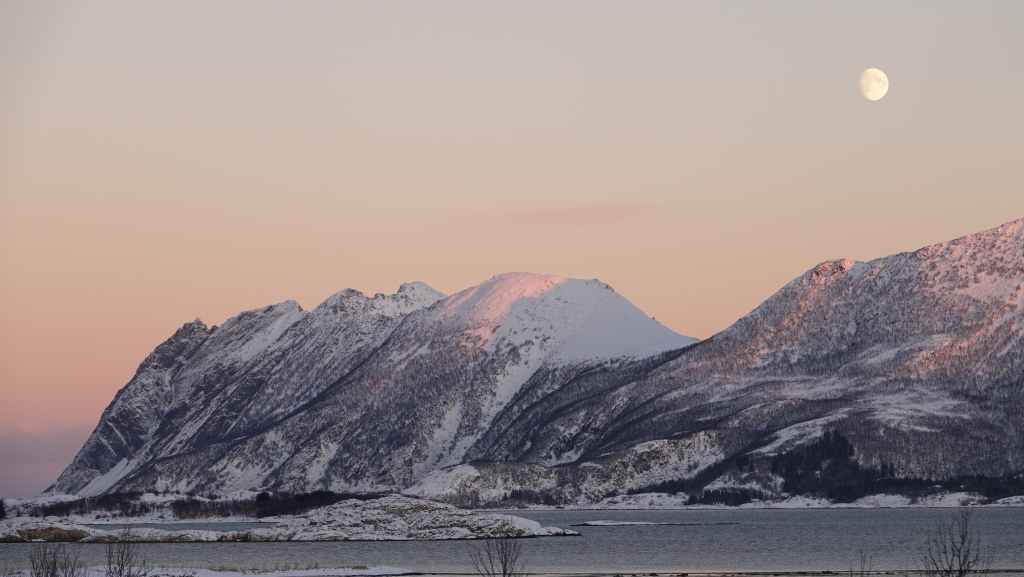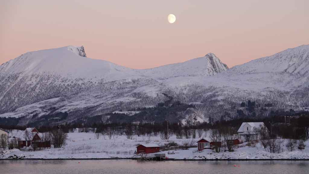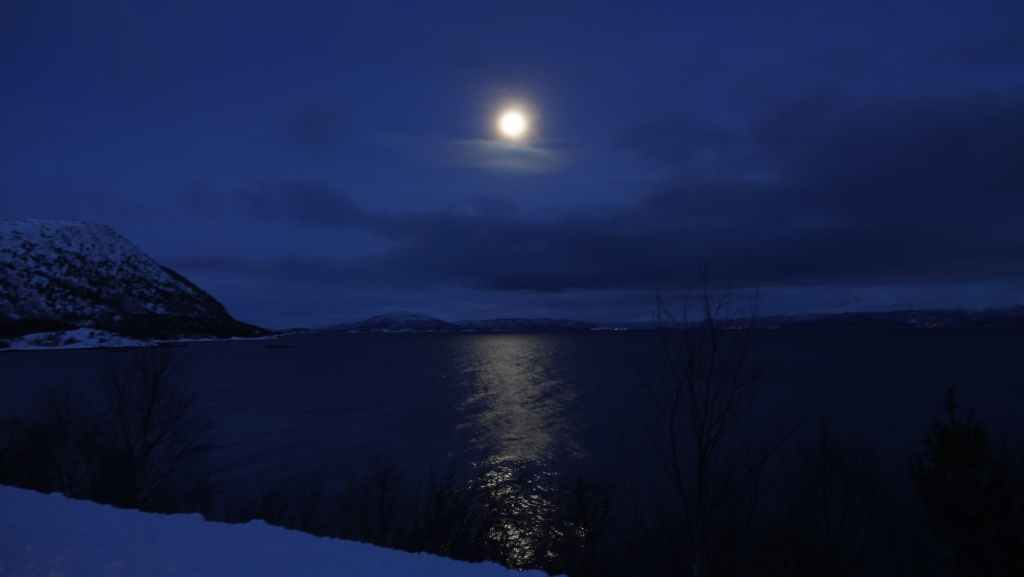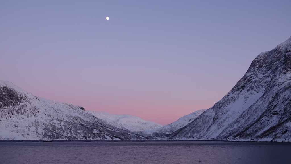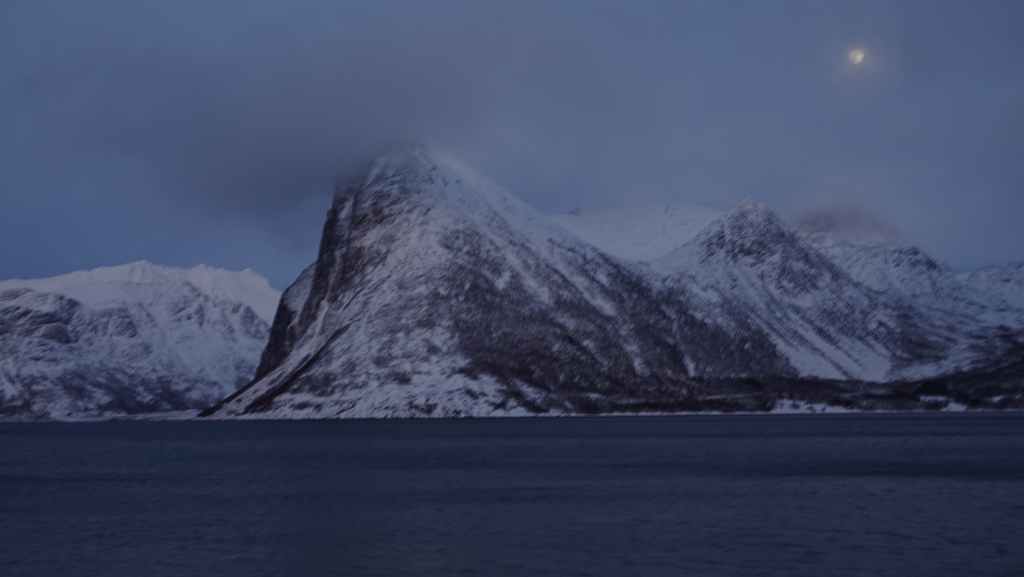 La nuit tombe mais les paysages, avec la lune qui éclaire le fjord et les à-pics des montagnes, sont somptueux !