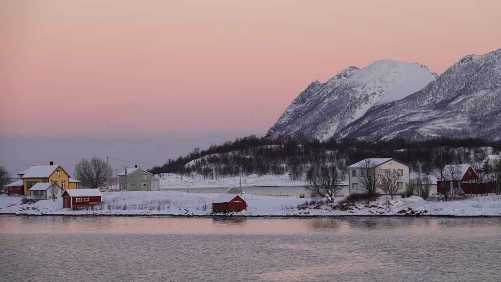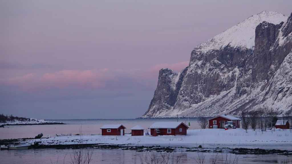 Ce matin, c’est toujours du très beau temps froid. Nous avons décidé d’aller visiter les fjords du nord-ouest de l’île, les plus réputés. Le ciel rosé du matin est de la partie et nous commençons par nous rendre à Gryllefjorden, petit village de pêcheurs aux maisons colorées. Nous nous baladons dans les rues où quelques habitants se déplacent avec une sorte de luge à guidon pour aller faire faire des courses.