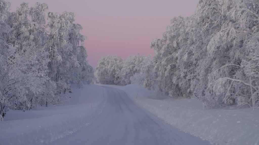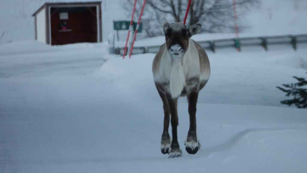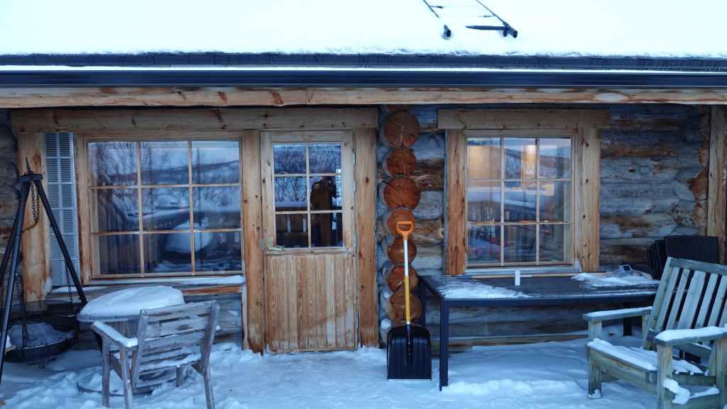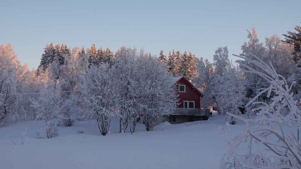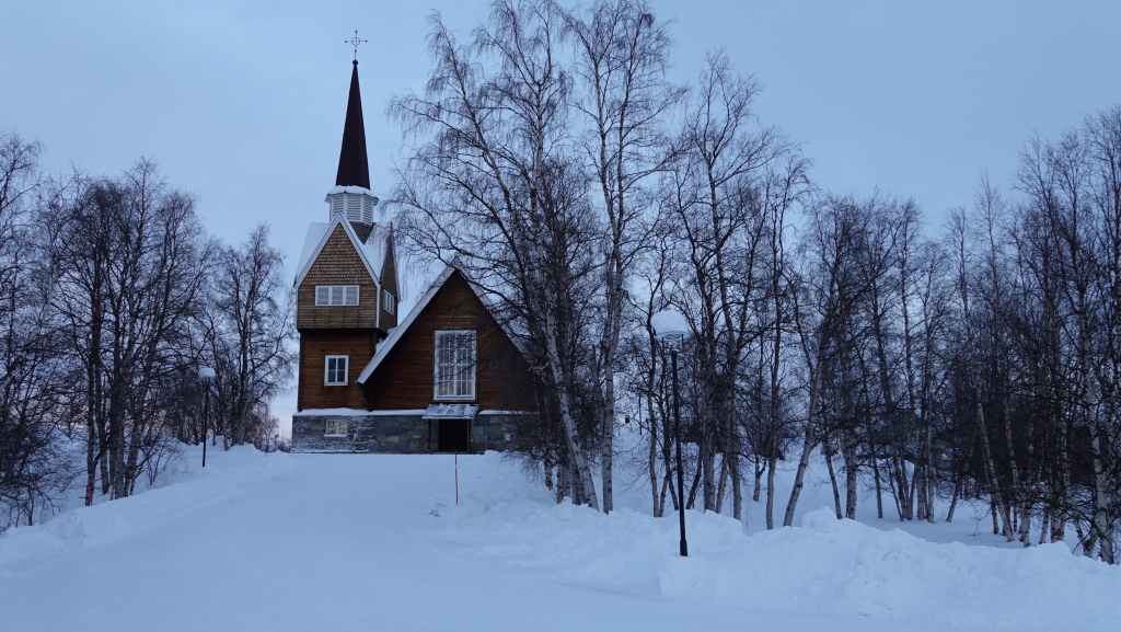 Pour l’après-midi, nous décidons de descendre vers le sud à Kaaresuvanto, à la frontière suédoise. Il y a 2 ans, nous avions visité un magasin de souvenirs intéressant avec de l’artisanat Sami (habitants autochtones éleveurs de rennes). Mais à notre arrivée, le magasin est fermé pour l’hiver. Nous nous rabattons sur une courte visite de Karesuanto, la ville jumelle côté suédois, de l’autre côté de la rivière Muonioalven. Peu de chose à voir hormis l’église protestante en bois. Retour de nuit à Kilpisjärvi.