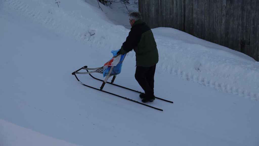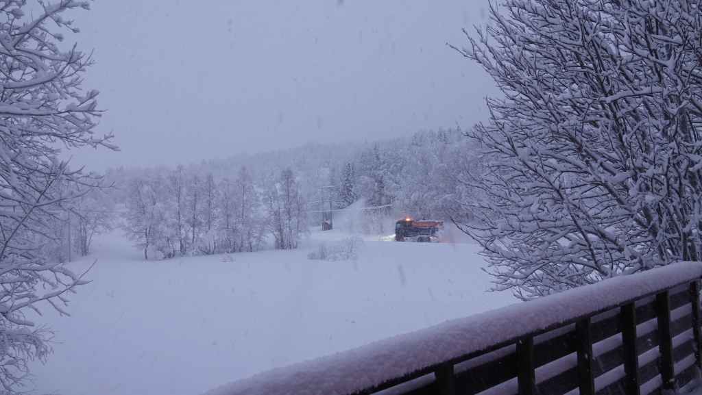 Il est tombé dans la nuit une dizaine de centimètres de neige et il tombe encore quelques flocons au matin. Après le petit-déjeuner, j’entreprends le déneigement sur notre tout petit bout de chemin, plus par plaisir que par nécessité ! Le vieux paysan voisin déneige le chemin principal avec son tracteur et sa fraise à neige. On en profite pour discuter un peu, un tout petit peu, lui aussi ayant un anglais de base ! Mais je sais qu’il élève une cinquantaine de vaches pour leur lait.