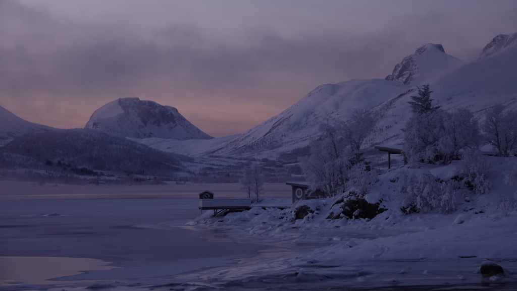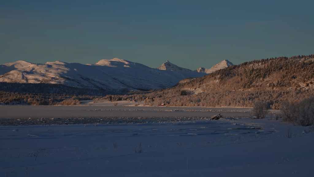 – 22°C et grand ciel clair au réveil. On a choisi cette journée pour aller « raquetter » dans le parc national d’Ånderdalen au sud-ouest de l’île. Nous longeons le fjord Tranøybotn, dont les eaux salées sont gelées sur les rives. Nous stoppons sur le parking à l’entrée du parc national, qui est payant l’été, vers Mrknes et son camping. Nous devons faire un aller / retour au lac Åndervatnet à 6 km du parking.