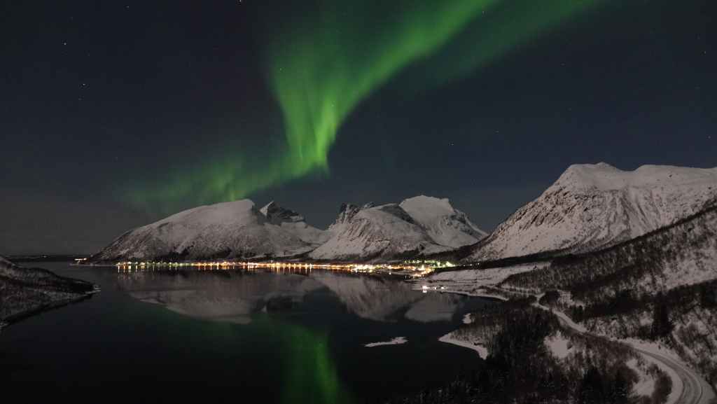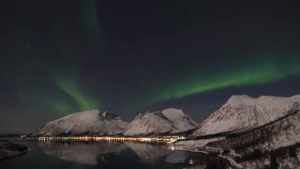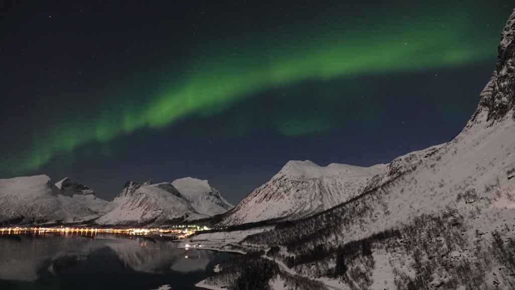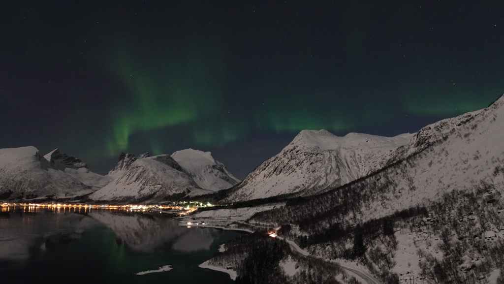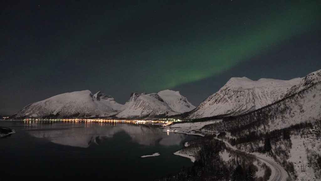 Retour à la maison par l’est de l’île. Comme le ciel est toujours très clair en soirée, nous partons à la chasse aux aurores boréales. Pour ça, nous avons une trentaine de kilomètres à faire pour rejoindre une plate-forme belvédère au-dessus Nordfjorden et le village de Bergsbotn. Peu de monde au début, mais le site est célèbre et le belvédère se remplit progressivement de touristes. Le spectacle est au rendez-vous et après deux heures d’observation au froid, on prend le chemin de la maison.