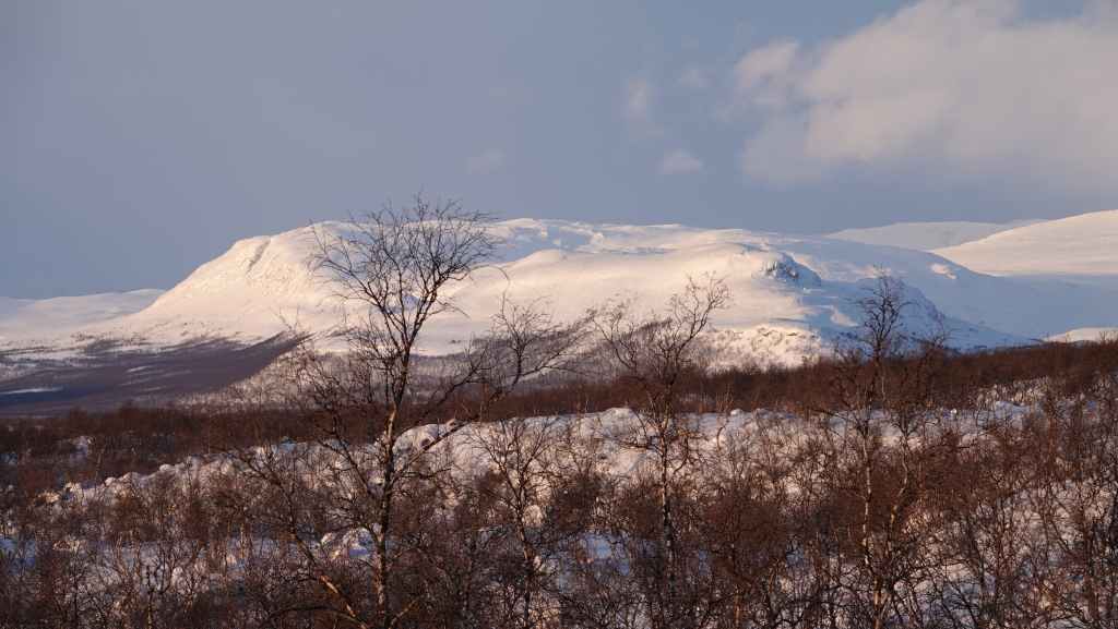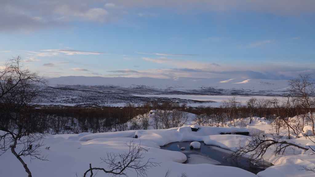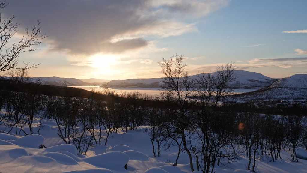 Après une excellente nuit, nous partons au supermarché de Kilpisjärvi. S’ensuit une petite balade dans la neige dans les hauteurs du village jusqu’aux abords du lac Cahkaljärvi. Il y a de très belles éclaircies et la température avoisine les -7°C.