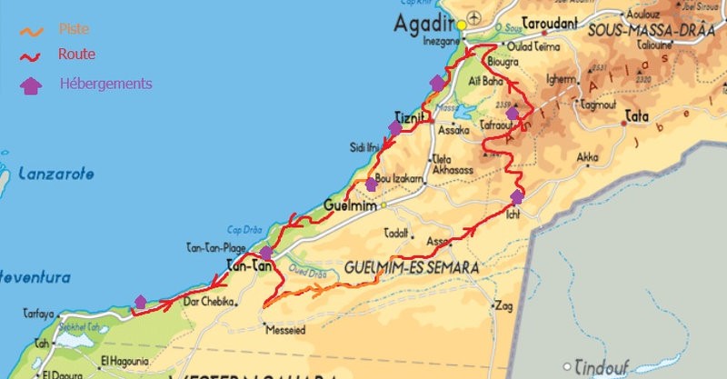 Donc une semaine avant le départ, nous avons opté pour un autre pays arabe et déjà connu : le Maroc, et plus précisément le sud d’Agadir. En une journée, nous avons donc construit notre itinéraire, réservé notre vol Orly – Agadir et son parking, 9 nuitées dans 8 lieux différents, et un véhicule 4×4, histoire de profiter de quelques pistes sauvages.