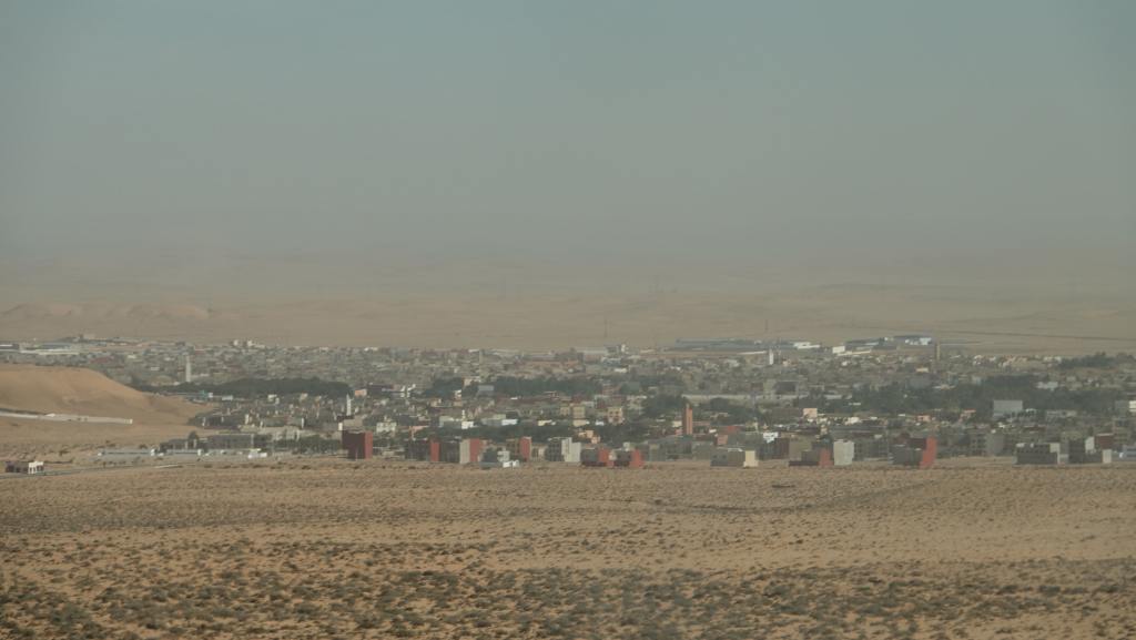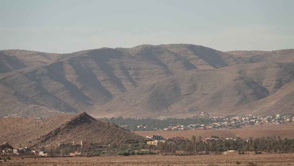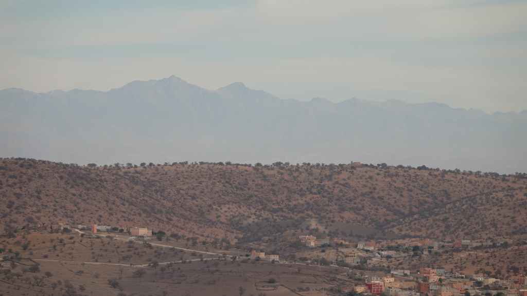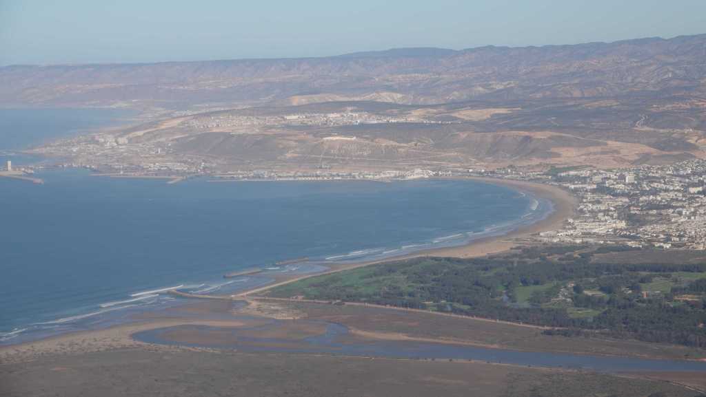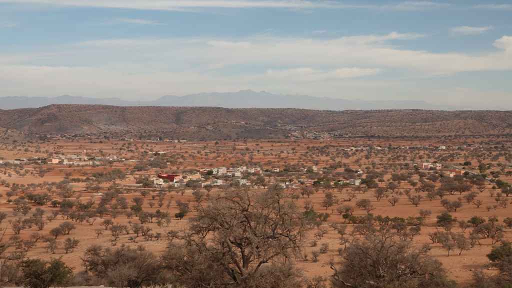 Après avoir dépassé le lac du barrage Ahl Souss, au niveau très bas, nous passons la ville d’Aït Baha. On retrouve ensuite une plaine aux couleurs orangées puis Biougra, la dernière ville avant l’aéroport.