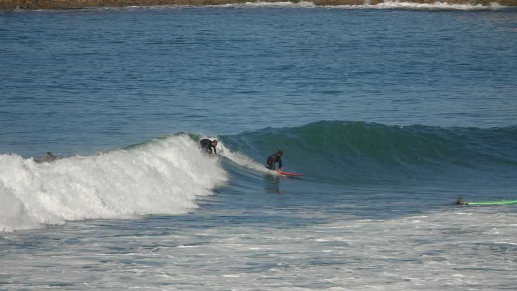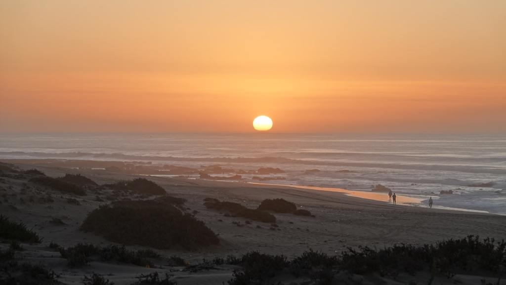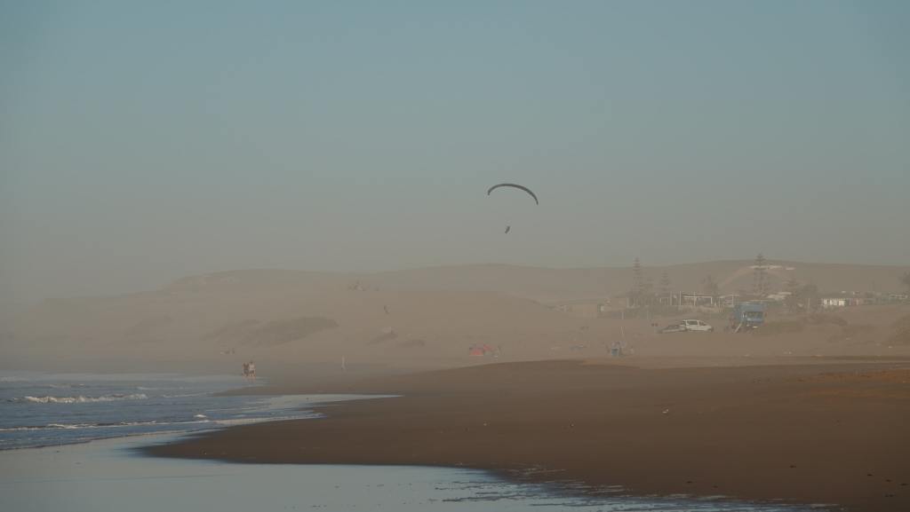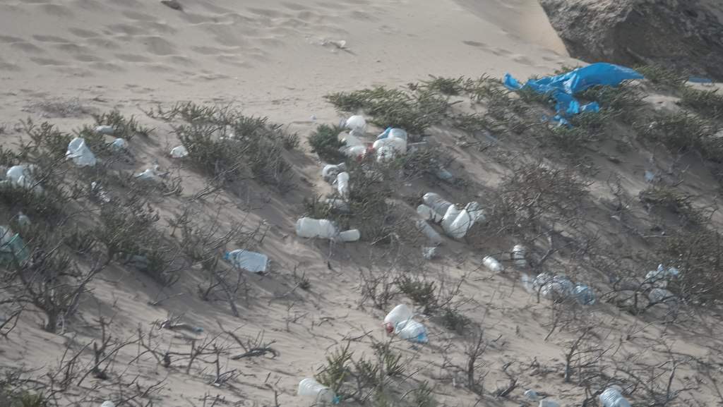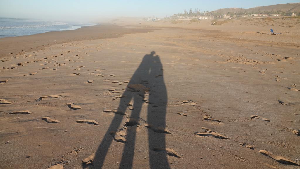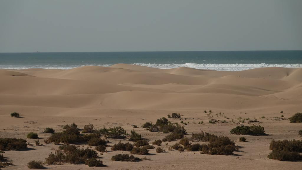 On s’installe sans connaître le futur contenu de nos assiettes : ce sera 8 pauvres sardines grillées +++ et toutes sèches… alors après avoir payé quelques dirhams (en gros 10 dirhams = 1 euro), nous quittons l’endroit très déçus. Quelques surfeurs s’exercent sur les rouleaux de l’océan. Côté terre, nous observons au loin de jolies dunes de sable clair, avec à nos pieds de nombreux déchets.