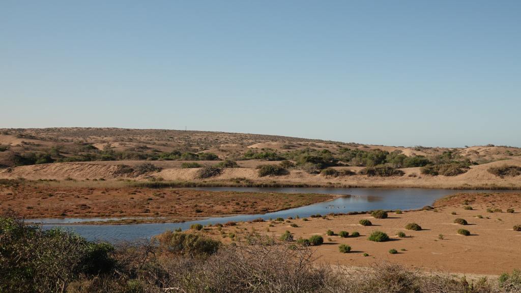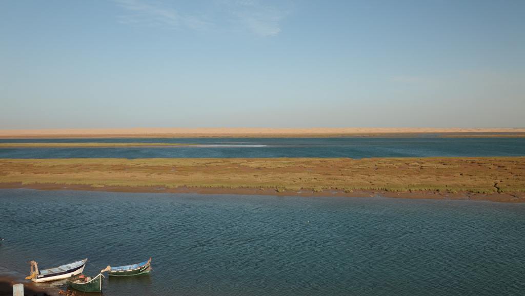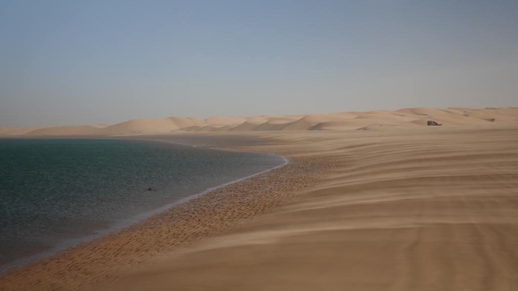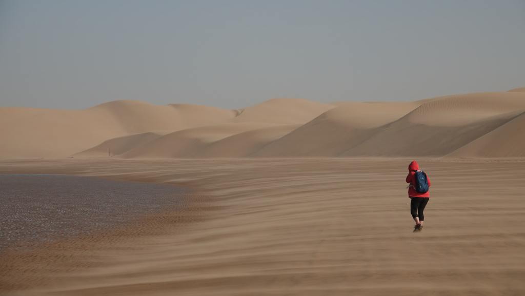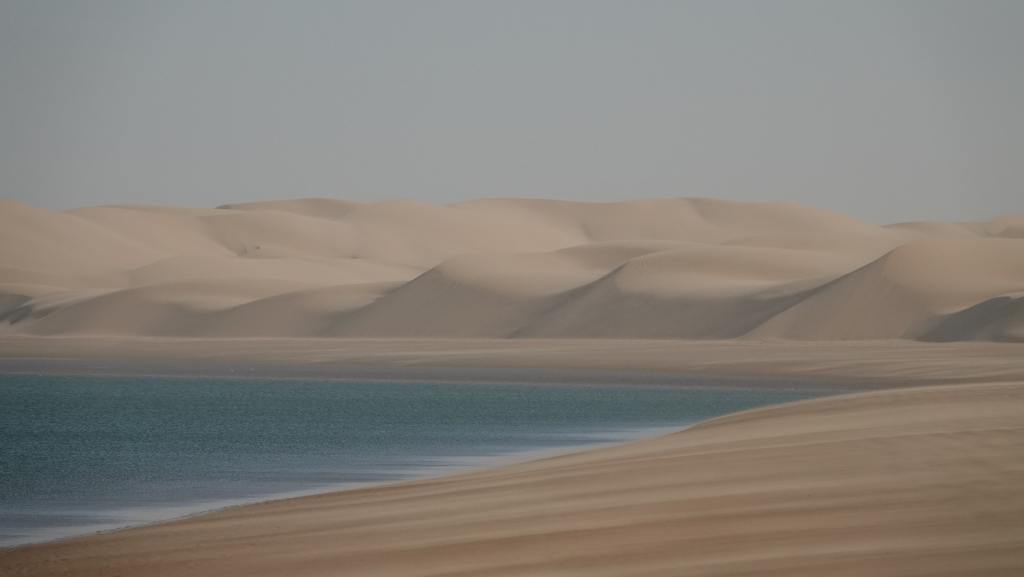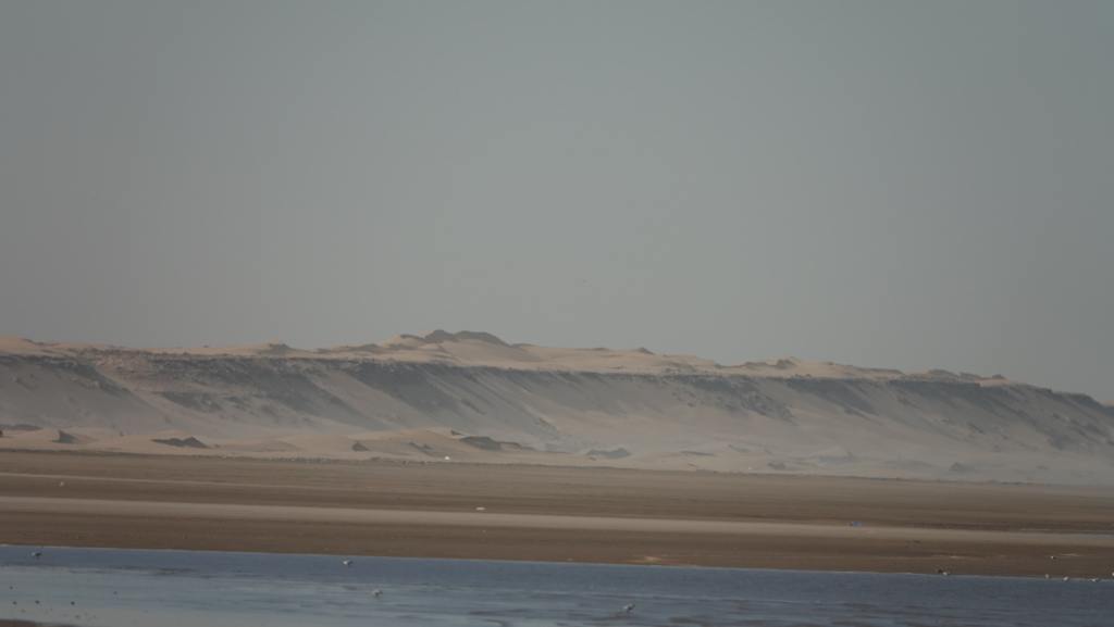 Le parking est situé en haut d’une petite falaise et un chemin bétonné descend vers les barques de pêcheurs : il est d’ailleurs possible de payer un de ces pêcheurs pour une promenade sur la lagune. Du haut la vue est impressionnante sur le parc national : eaux bleues et dunes dorées sans oublier le vert de la végétation. De nombreux oiseaux peuplent le site. On part en balade vers le nord pour rejoindre les grandes dunes. Ce site est vraiment magnifique et la brume de sable rend le paysage irréel. on fait un A/R de 5 km sur un sable parfois dur, parfois très meuble. Le retour se fait avec un vent de plus en plus puissant, qui se transforme en tempête de sable.
