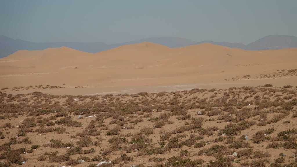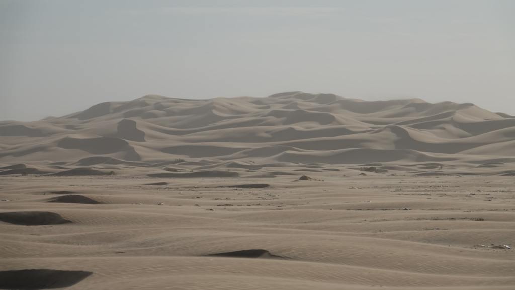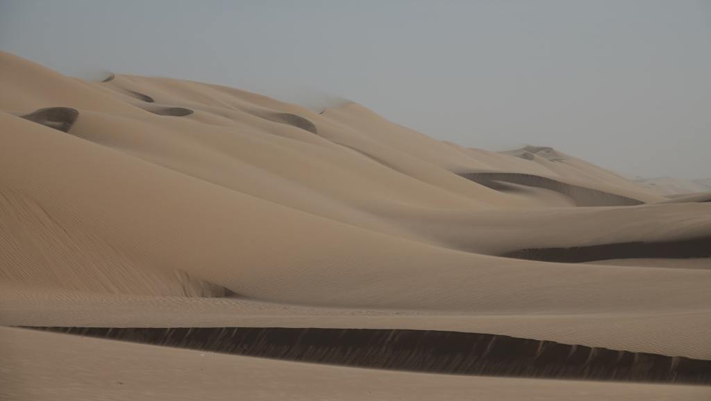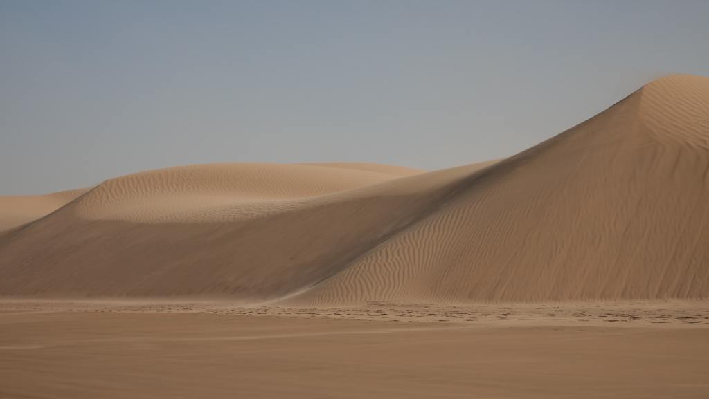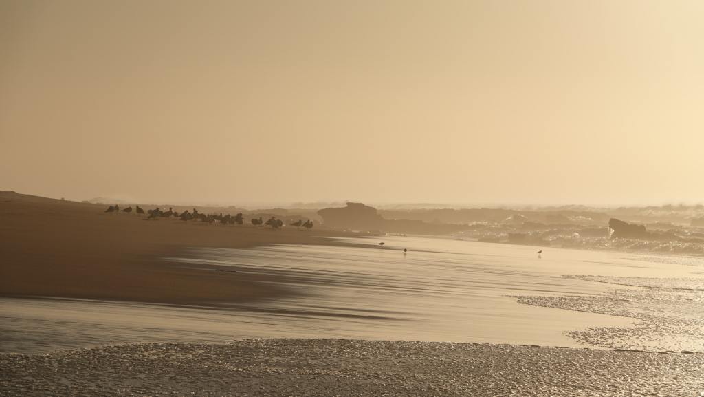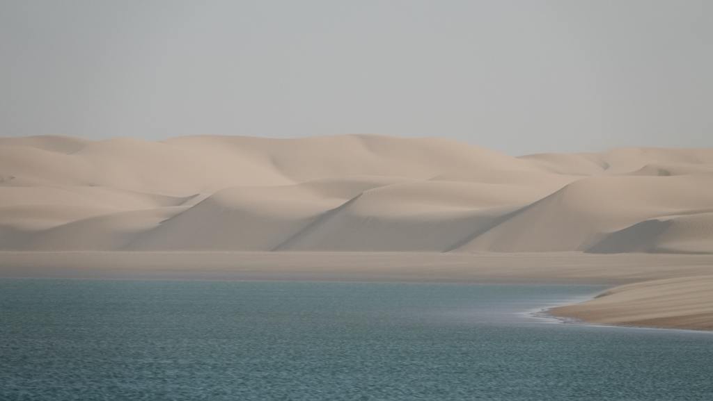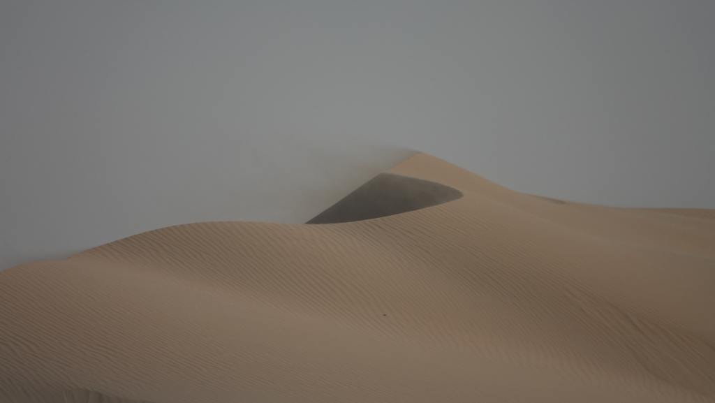 Le parking est situé en haut d’une petite falaise et un chemin bétonné descend vers les barques de pêcheurs : il est d’ailleurs possible de payer un de ces pêcheurs pour une promenade sur la lagune. Du haut la vue est impressionnante sur le parc national : eaux bleues et dunes dorées sans oublier le vert de la végétation. De nombreux oiseaux peuplent le site. On part en balade vers le nord pour rejoindre les grandes dunes. Ce site est vraiment magnifique et la brume de sable rend le paysage irréel. on fait un A/R de 5 km sur un sable parfois dur, parfois très meuble. Le retour se fait avec un vent de plus en plus puissant, qui se transforme en tempête de sable.
