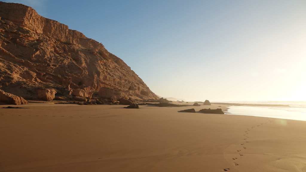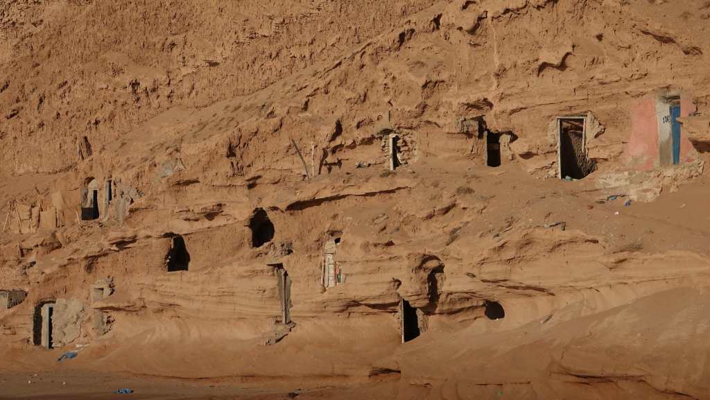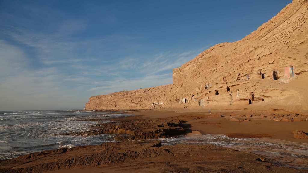 Nous reprenons la route en direction de Douira, où nous arrivons au Riad Sahara Sunset Beach en milieu d’après-midi. C’est Ibrahim qui nous accueille dans cette maison d’hôtes principalement équestre. Il nous présente Floran et Nora dans un beau salon avec vue sur mer, un couple franco marocain, propriétaires des lieux. Nous apprécions l’accueil chaleureux et les conseils de nos hôtes, autour d’un thé à la menthe. Puis, en moins de 10 mn à pied, nous descendons à la plage, où sont installées dans les falaises, ce qu’on appelle ici des grottes mais qui sont en fait des abris troglodytes, creusés par les pêcheurs. Ils sont, pour la plupart, abandonnés et en bien mauvais état.