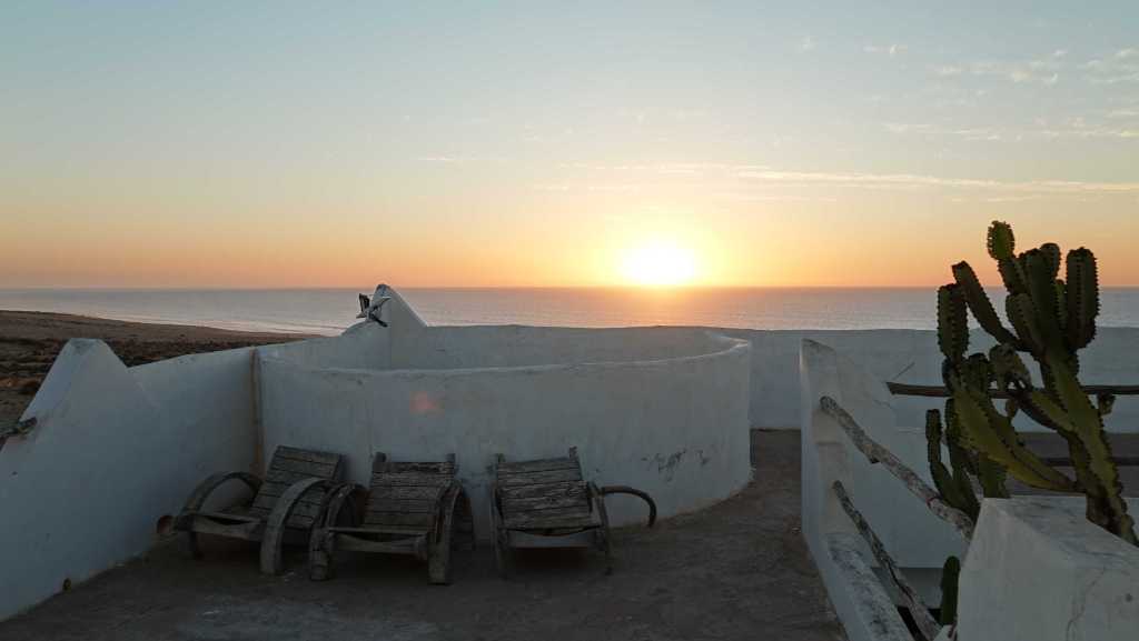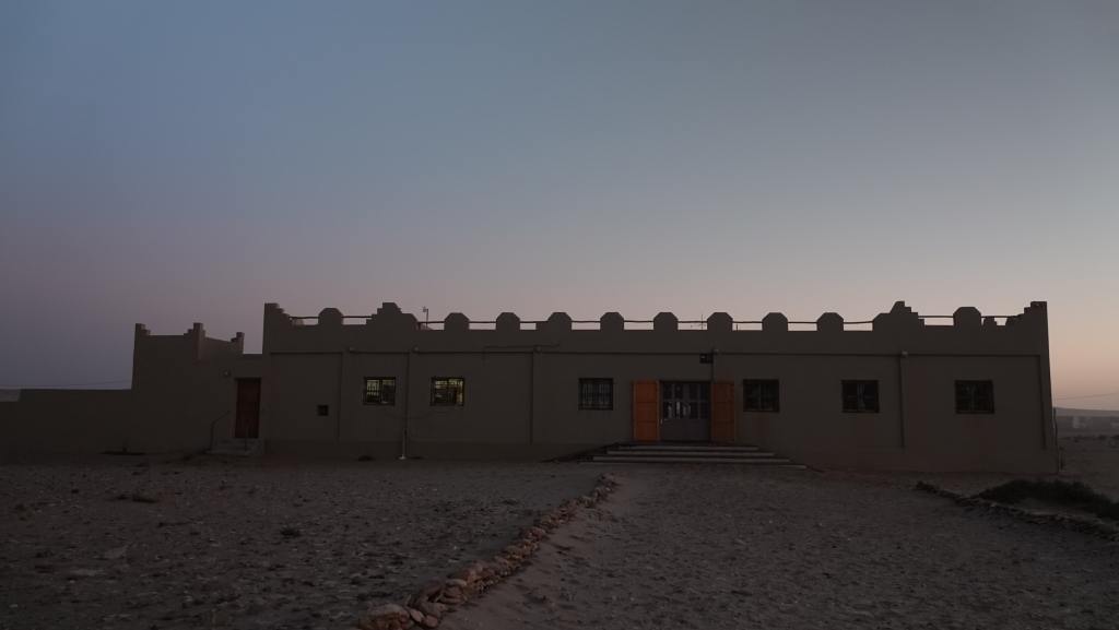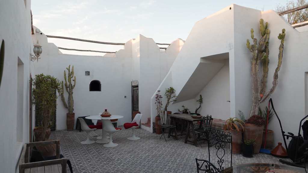 Toujours par la N1 également en travaux au sud de El Ouatia ou Tan-Tan plage, nous longeons l’océan et arrivons à notre étape du soir à Akfenir, à la Courbine d’Argent, une maison d’hôte tenue par un couple de français. C’est Nathalie qui nous accueille dans son riad construit par son père. On s’installe dans notre chambre rénovée et très claire. Nathalie nous donne RDV dans le salon pour un apéritif avec les autres voyageurs. Nous sommes 4 couples de français dont un couple de quinquas avec qui nous sympathisons. Alexis et Sophie sont pilote et hôtesse chez Air France. Nous poursuivons la discussion à table en partageant un repas délicieux et très copieux. Nous découvrons que nous nous retrouverons 2 jours après à l’étape à Icht. On papote encore une fois très tardivement.