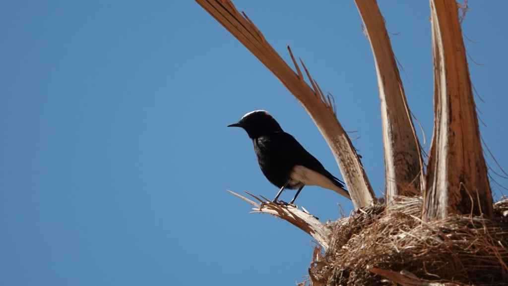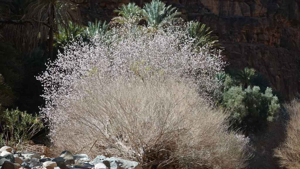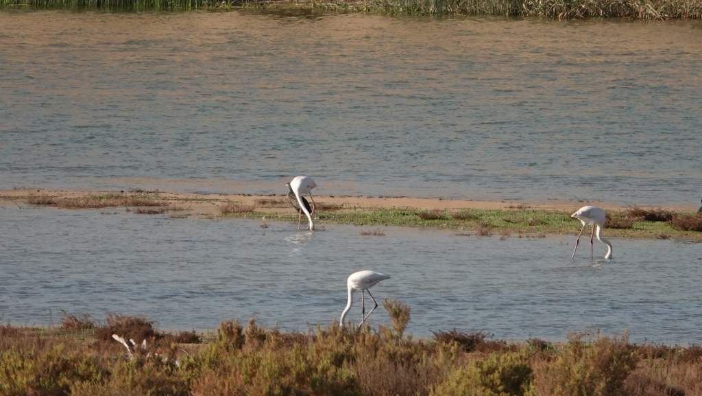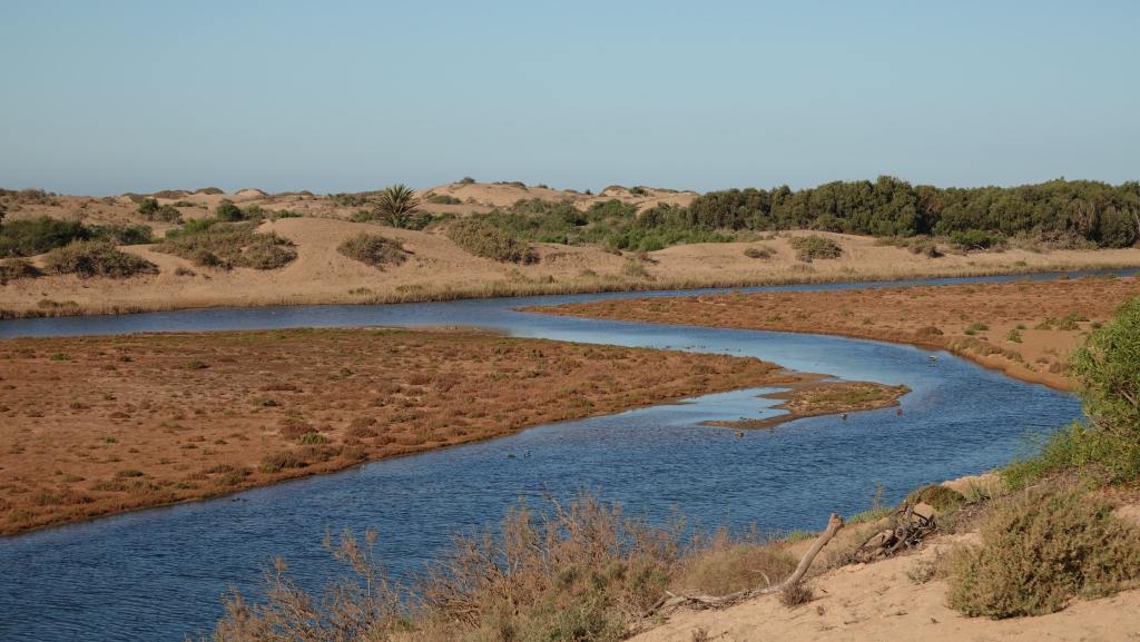 Après un copieux petit-déjeuner, où nous découvrons l’Amlou (pâte faite d’amandes grillées moulues mélangée avec de l’huile d’Argan), nous quittons Douira pour rejoindre, par une piste sablonneuse, le Parc National de Soussmassa et son oued à Sidi R’Bat, réputé pour ses ibis chauves. En une balade de 7 km A/R, nous observons des tadornes casarca, des spatules, des flamants roses… blancs, et des cormorans, mais pas d’ibis. Nous discutons avec un garde forestier en moto, qui entre autres, nous conseille un resto à Oued Massa.