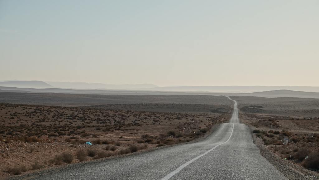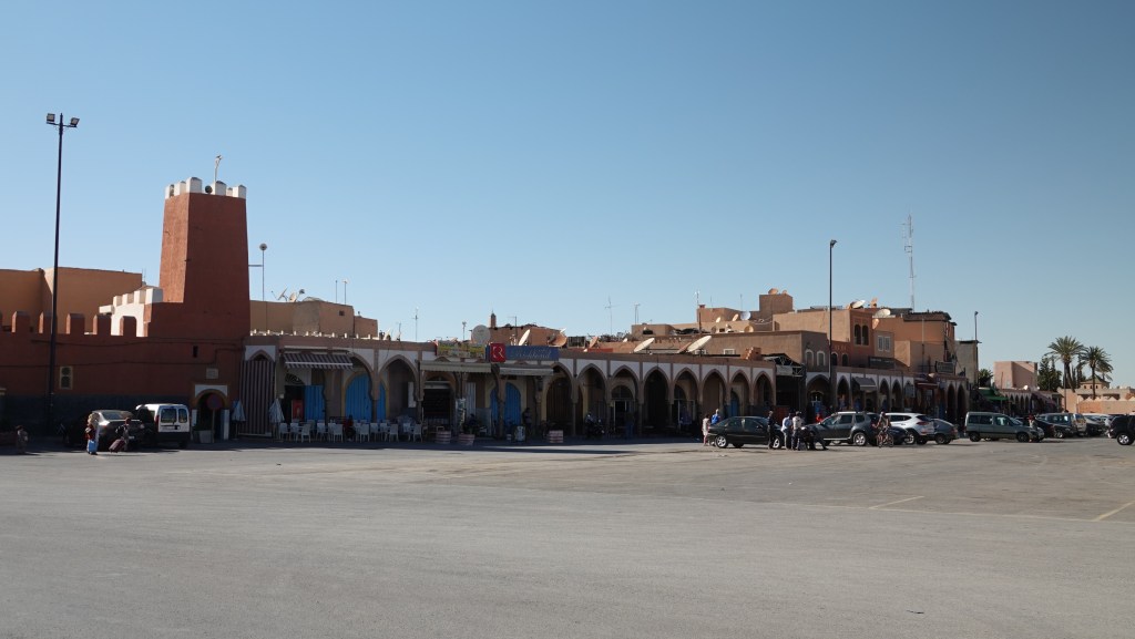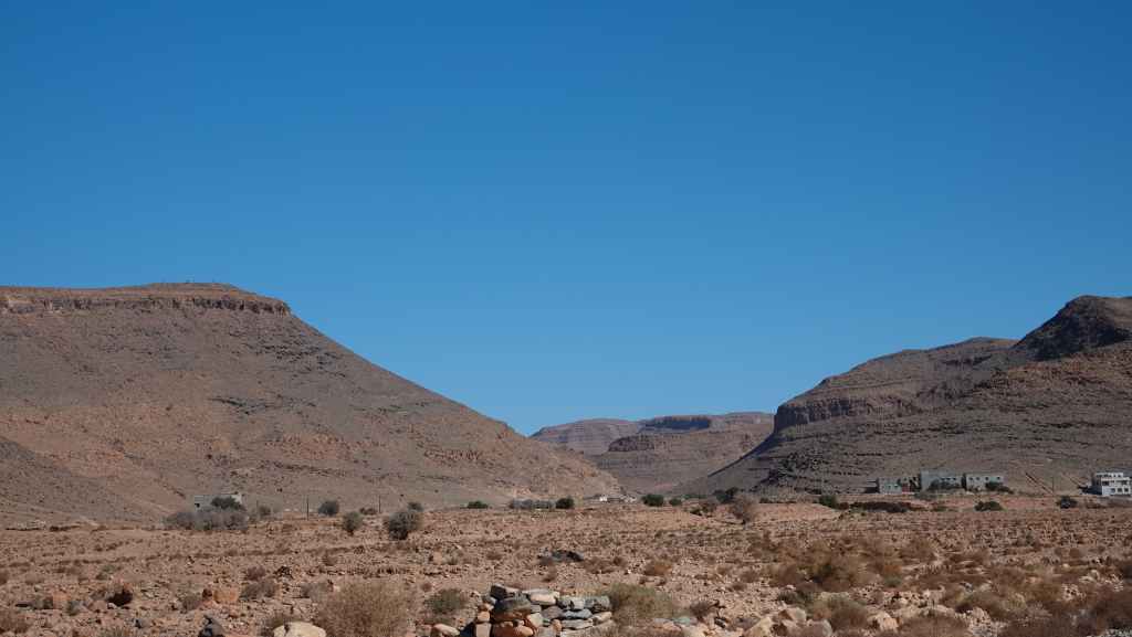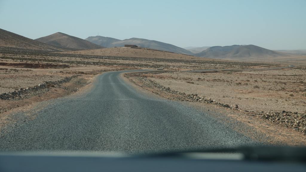Le petit-déjeuner se prend dans le hall de l’hôtel, derrière les baies vitrées qui donnent sur la rue : pas discret du tout et un mendiant fait des allers retours sur le trottoir en nous regardant intensément à chaque passage, en attendant notre sortie. Nous devons retirer de l’argent au DAB voisin de l’hôtel et une dame fait la manche au pied du distributeur. Un troisième homme s’approche de la banque et réclame des sous à un autre marocain plus âgé mais bien habillé… que doit-on faire : donner et inciter ces personnes à mendier ou refuser ? Finalement le marocain donne quelques dirhams aux 3 mendiants et nous l’imitons à la suite. Le sud du Maroc est très pauvre et il n’y a pas de travail pour tout le monde… Ces 3 personnes sous remercient puis disparaissent dans la rue. On charge les bagages dans le coffre et l’aventure continue On part vers sud est par la P1600 sur Maps ou RR103 sur l’application Osmand. La route est goudronnée et traversons Tilemzoun.