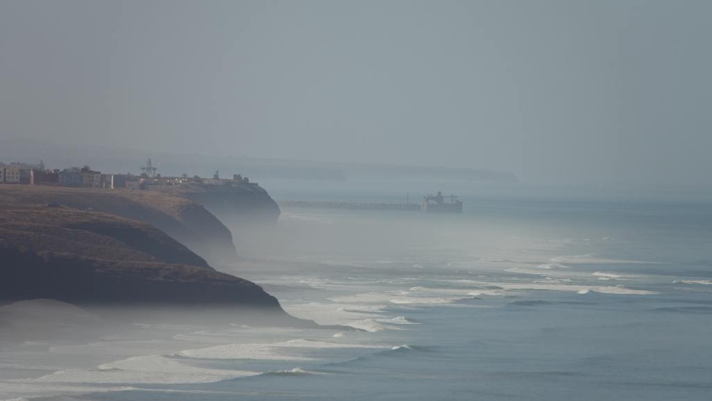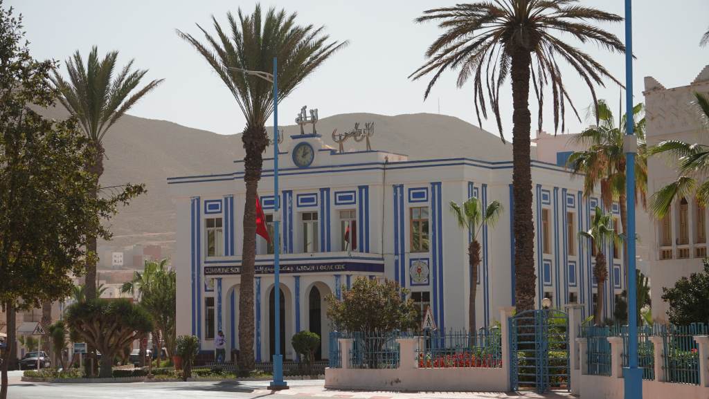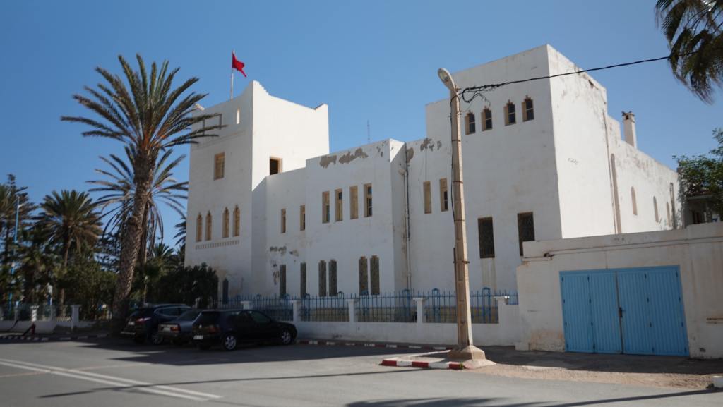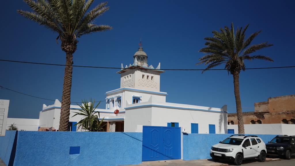 Après le petit-déjeuner tardif (pas avant 9h00), nous reprenons la route P1905 pour rejoindre Mirleft que nous visitons rapidement, Une jolie mosquée toute neuve, un marché animé et une boutique où nous achetons un pot d’amlou… Nous continuons en direction de Sidi Ifni. Nous nous garons dans le quartier un peu ancien où trône un phare, et des bâtiments administratifs tous peints en blanc. Depuis une grande terrasse, nous avons un magnifique point de vue sur l’océan, la plage et une aire pour camping-cars…