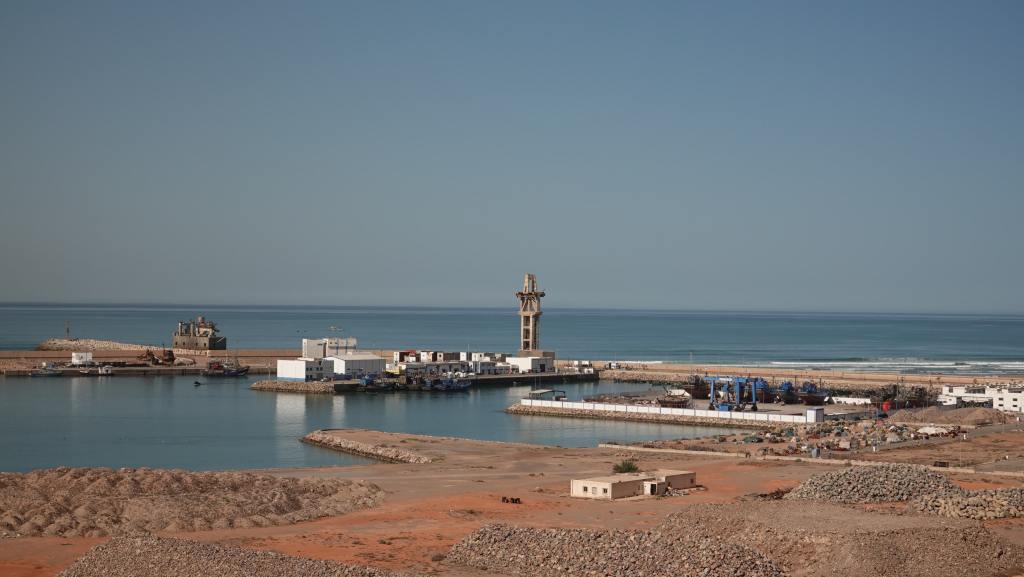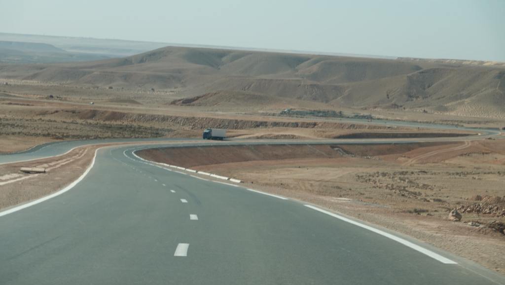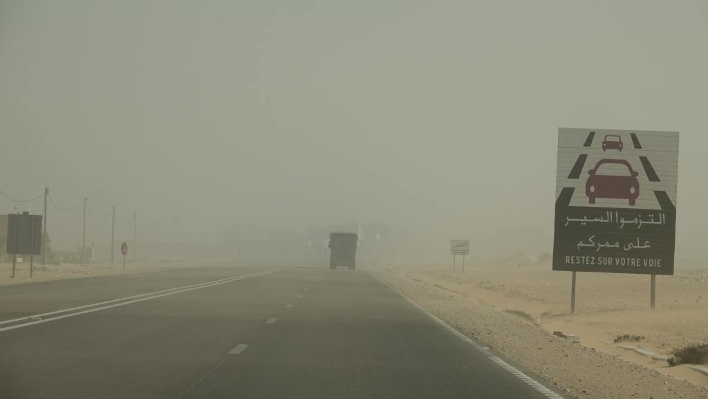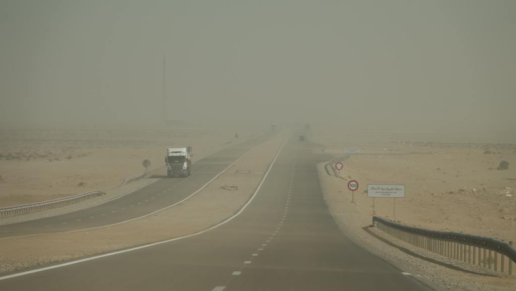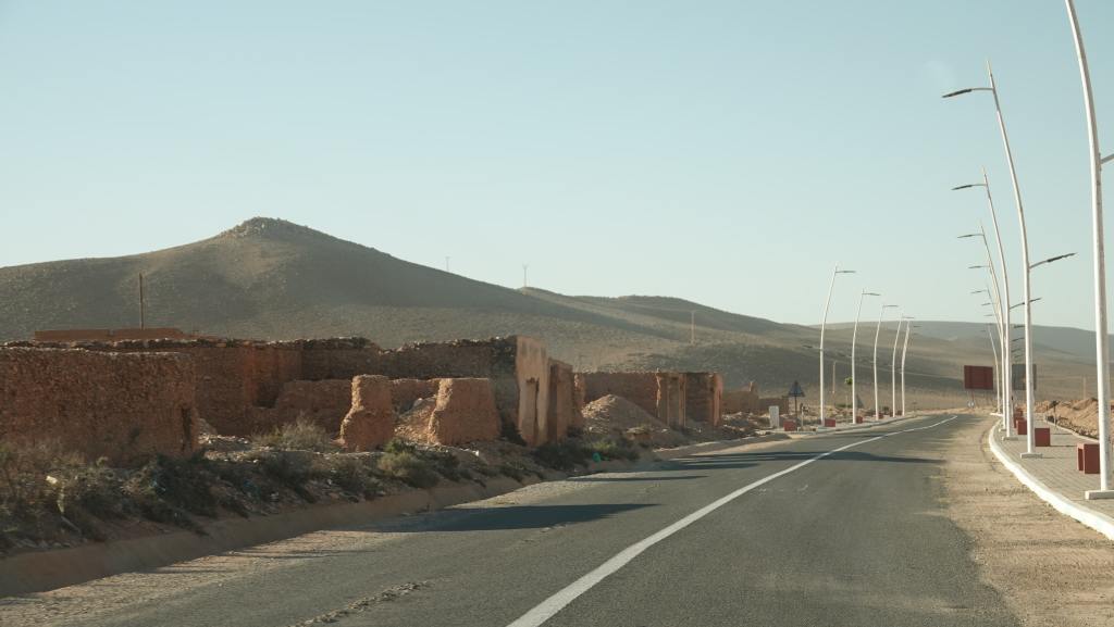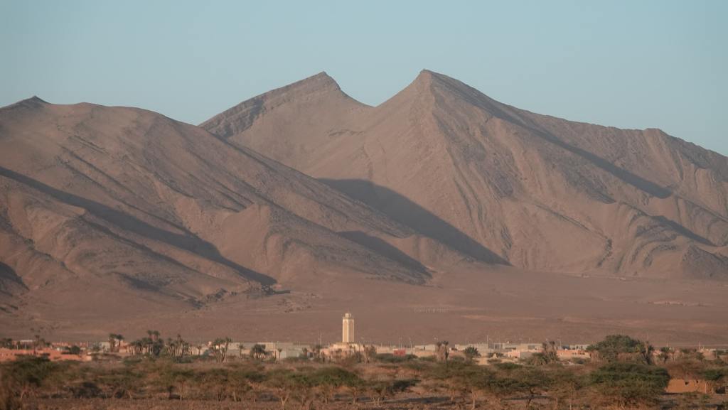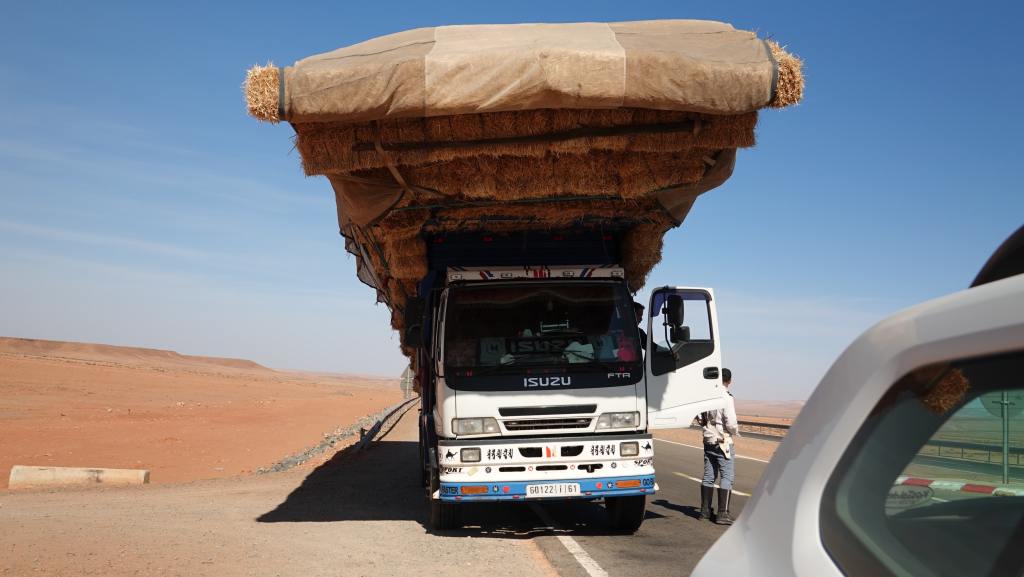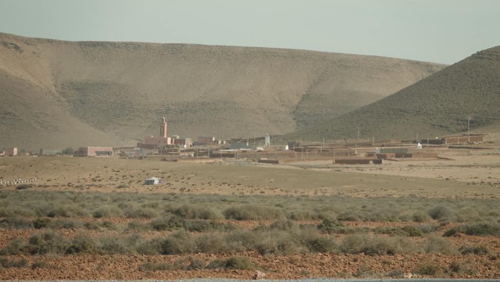 Pour le déjeuner, nous stoppons dans un restoroute fréquenté uniquement par des locaux… et la qualité n’est vraiment pas au RDV : brochettes de bœuf ou plutôt de très vieux bœuf pas tendres du tout ! Nous continuons sur la N1 limitée à 100 km/h… et où une descente m’entraine à 113 km/h vitesse contrôlée par la Gendarmerie Royale qui nous arrête au rond-point suivant, en même temps qu’un camion de paille surchargé. Le gendarme qui rempli le PV est très sympathique et me propose même un thé à la menthe dans son vieux Patrol, que je refuse poliment. Nous traversons Tan-Tan, une ville au milieu du désert que nous aurons l’occasion de découvrir au retour.