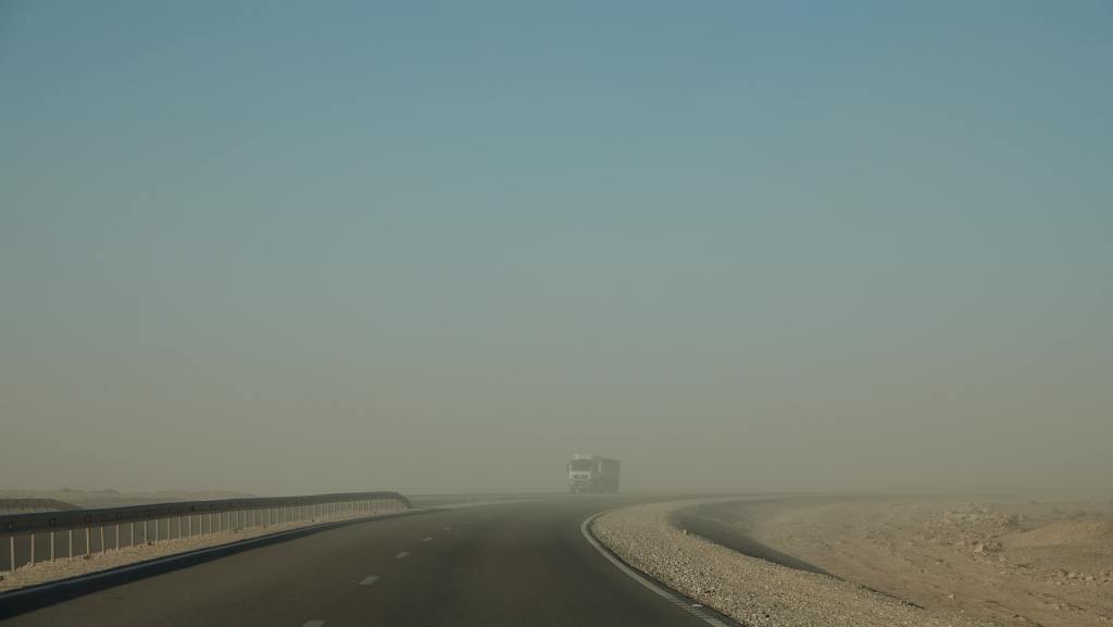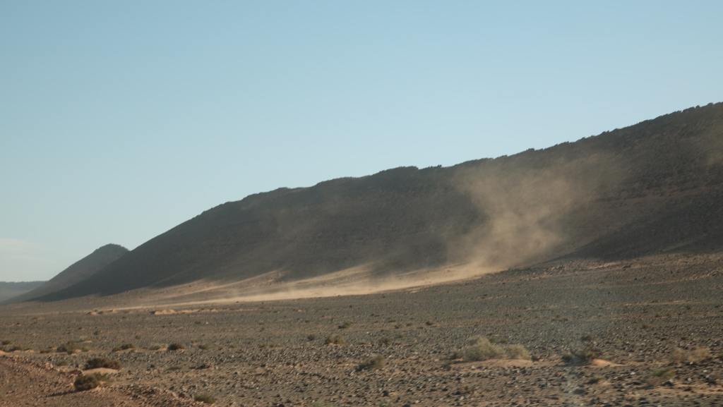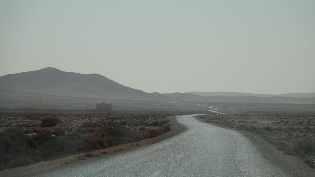 Nous reprenons la route avec une visibilité réduite due au sable pour déjeuner dans un restaurant d’Afkhenir, fréquenté par les touristes et les routiers qui descendent vers le Sahara ou remontent vers les grandes villes du nord.
