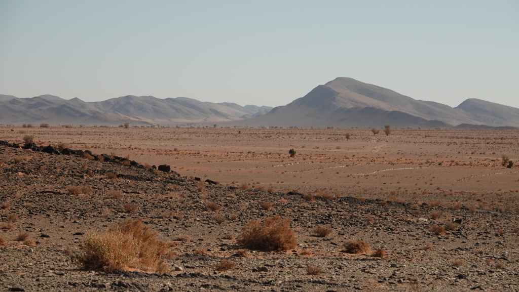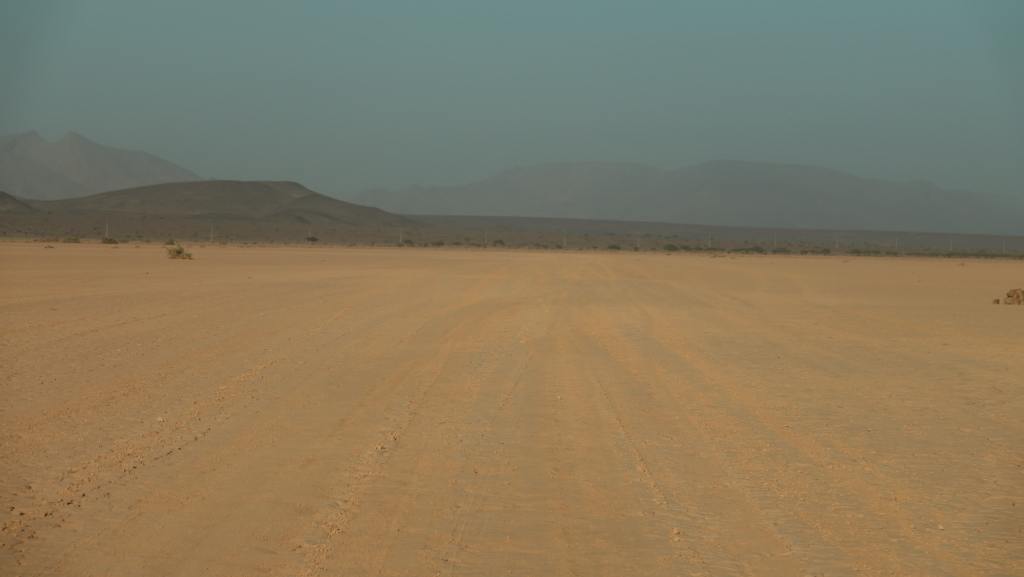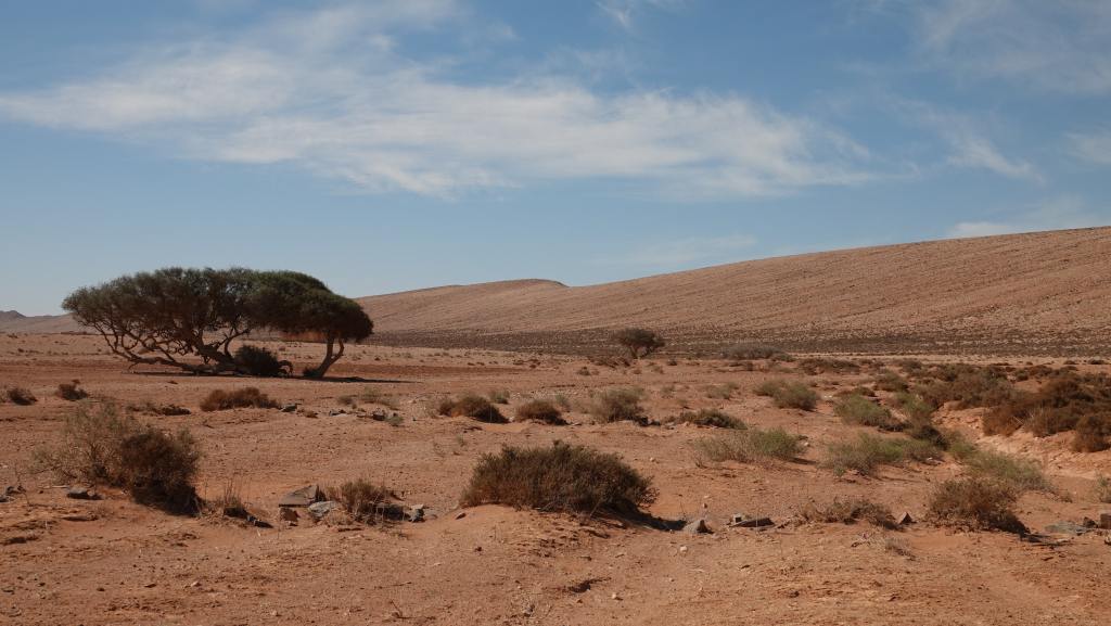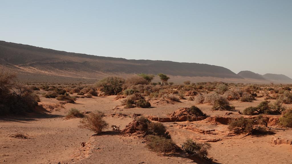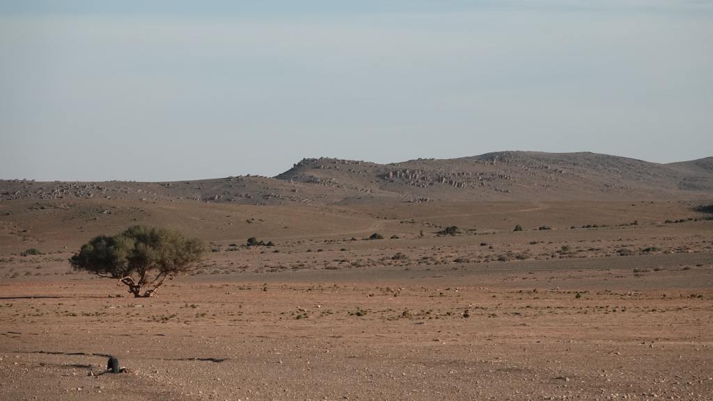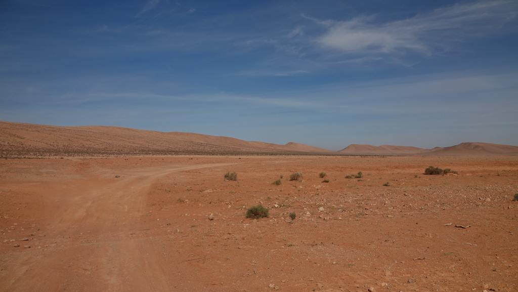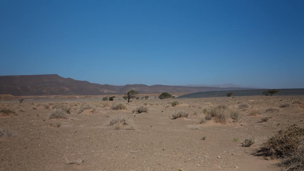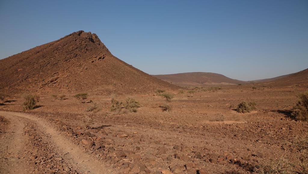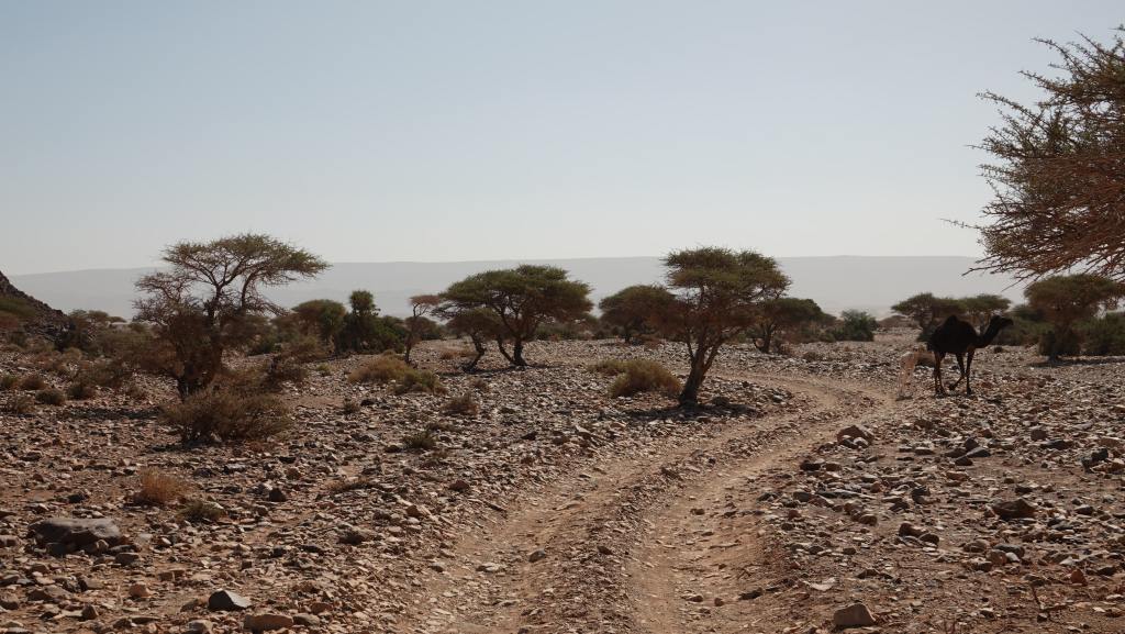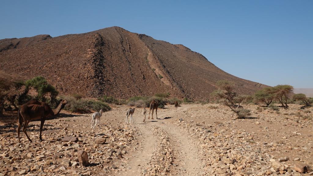 Nous attaquons par une piste retravaillée récemment mais avec pas mal de tôle ondulée : la vitesse moyenne est alors de 20 km/h. On traverse des paysages aux couleurs orangées et grises anthracites. Un oued à sec est bordé d’acacias. Quelques rares habitations en ruines se détachent dans cette vaste plaine encadrée de montagnes culminants à 650 m au nord et 400 m au sud. Deux camps de nomades en toile sont dispatchés le long de la piste et nous croisons à plusieurs reprises leurs dromadaires.