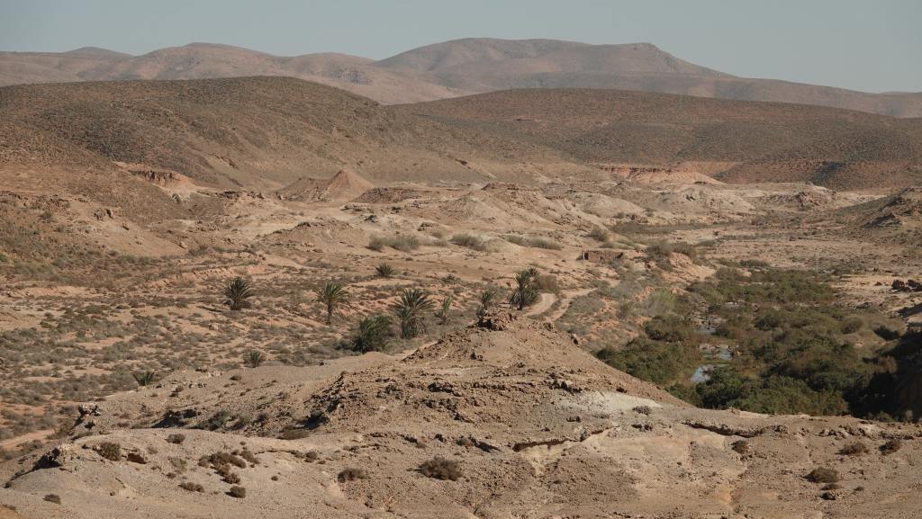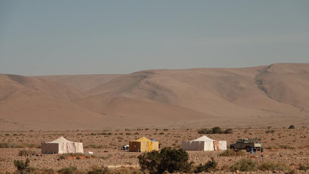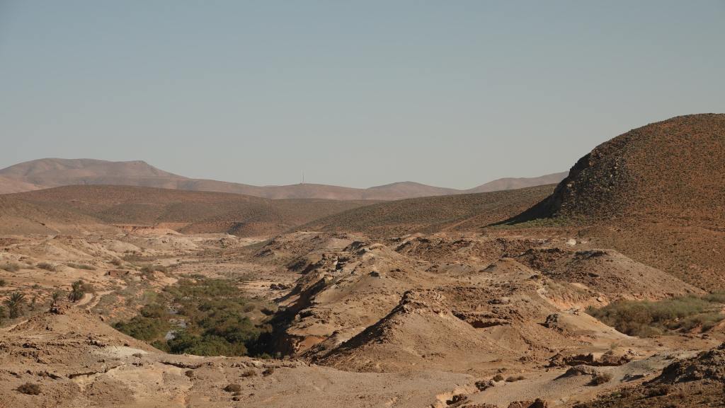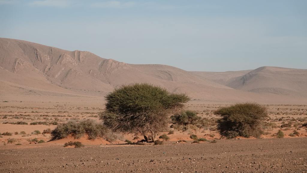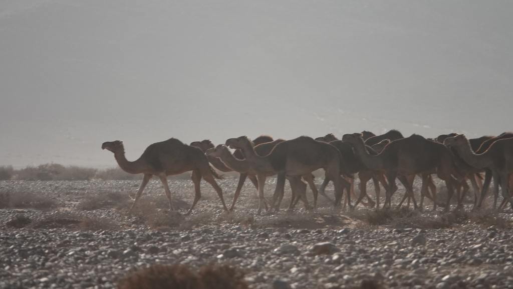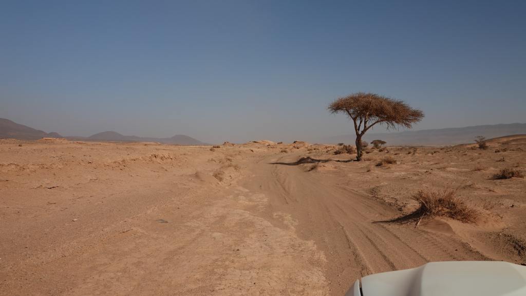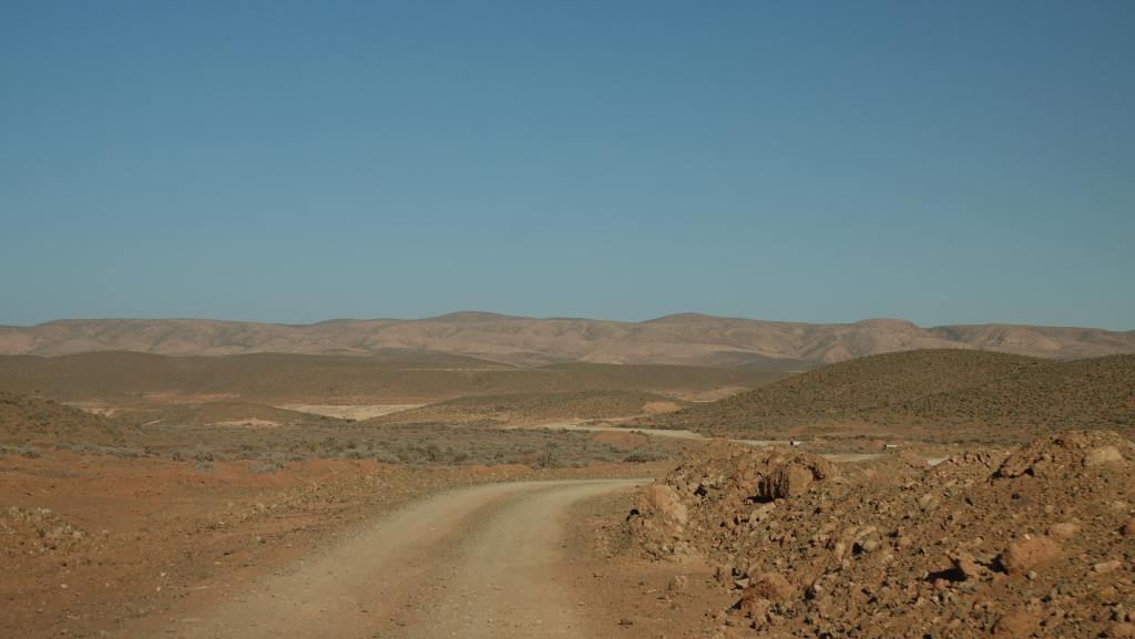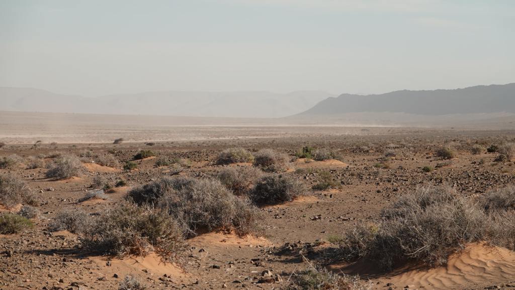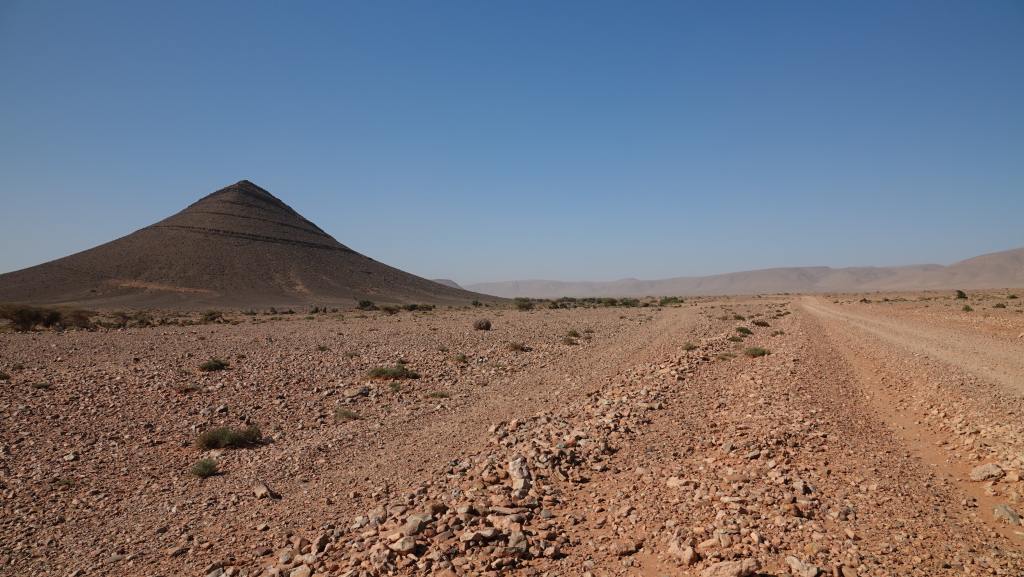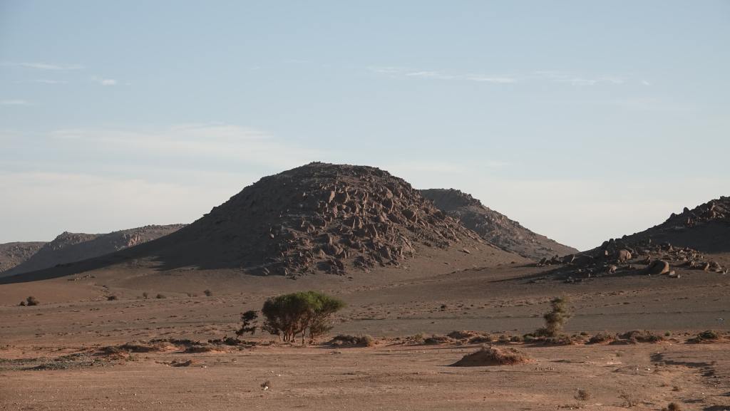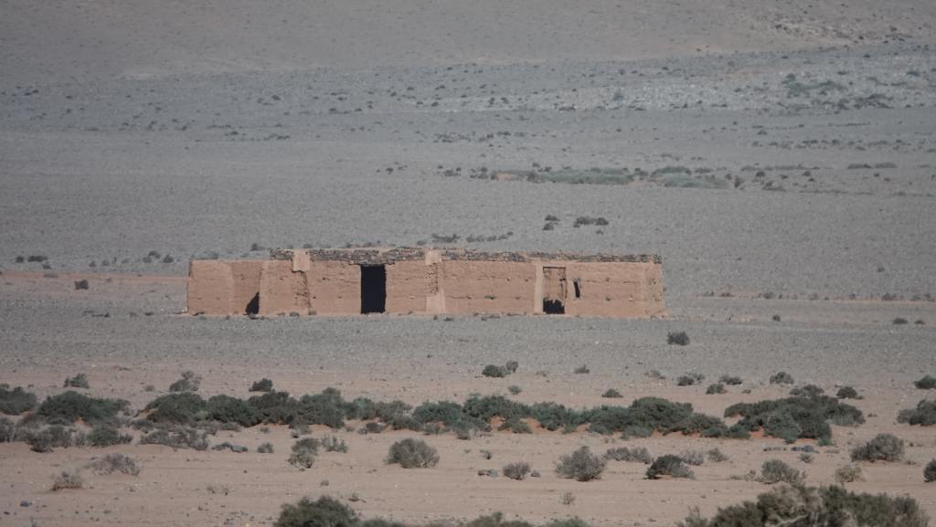 Nous attaquons par une piste retravaillée récemment mais avec pas mal de tôle ondulée : la vitesse moyenne est alors de 20 km/h. On traverse des paysages aux couleurs orangées et grises anthracites. Un oued à sec est bordé d’acacias. Quelques rares habitations en ruines se détachent dans cette vaste plaine encadrée de montagnes culminants à 650 m au nord et 400 m au sud. Deux camps de nomades en toile sont dispatchés le long de la piste et nous croisons à plusieurs reprises leurs dromadaires.