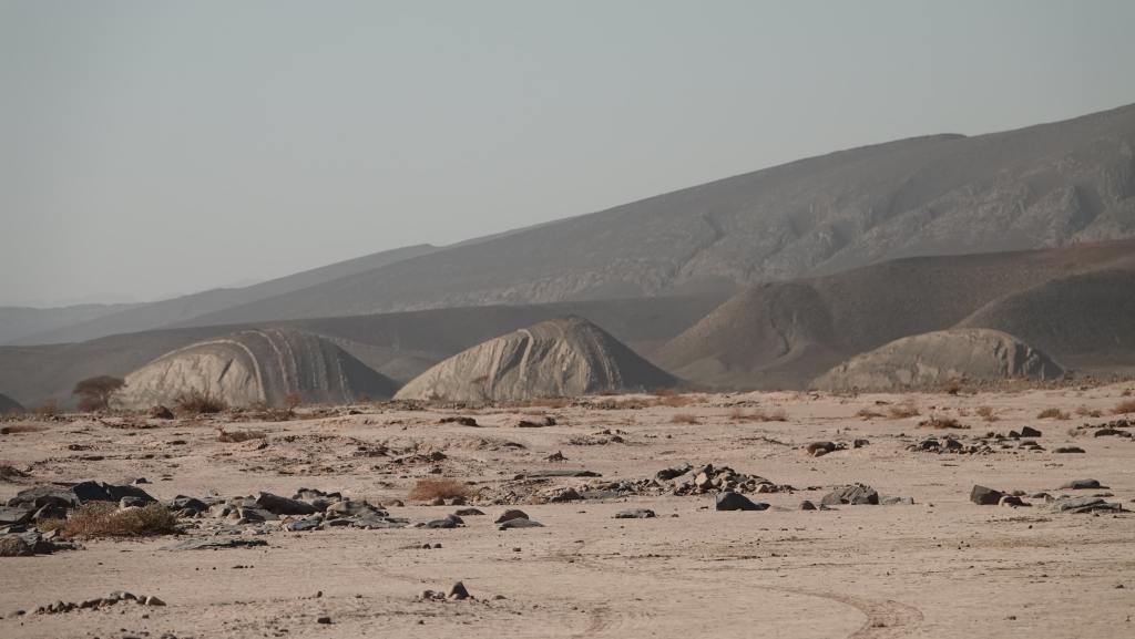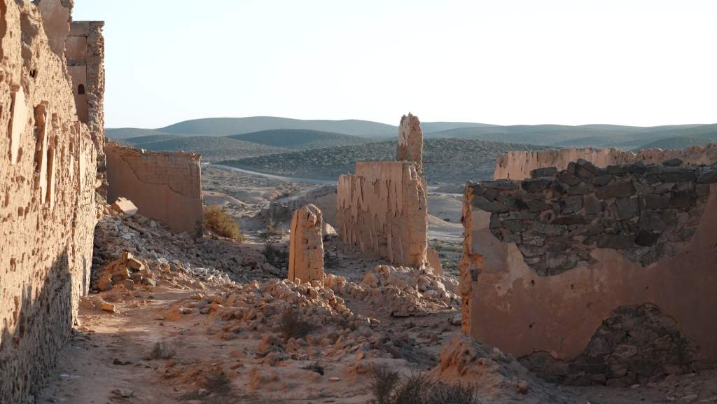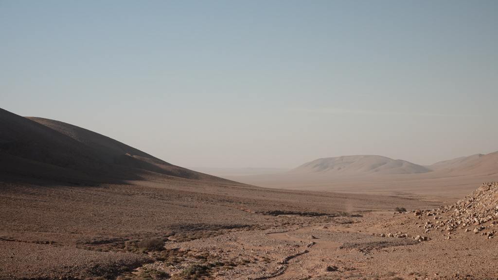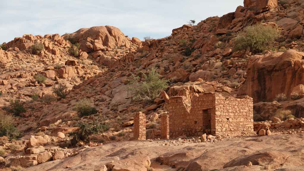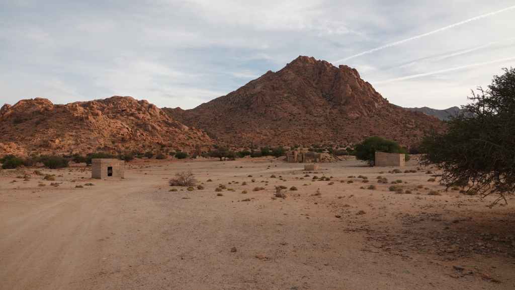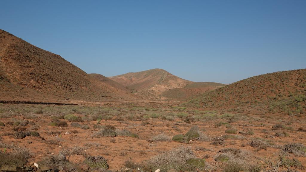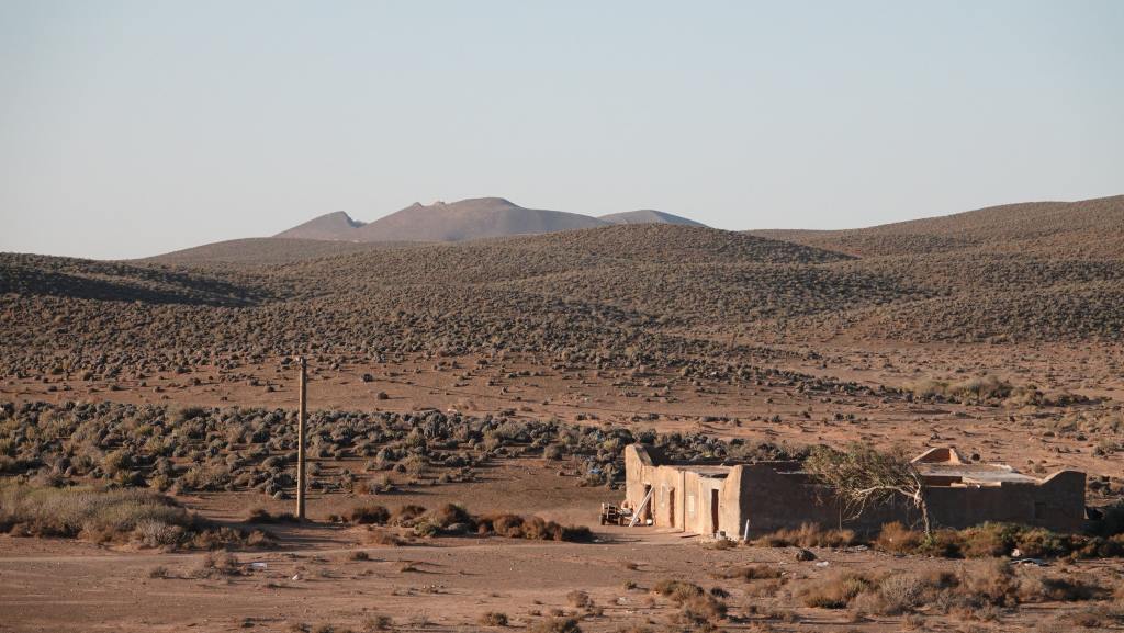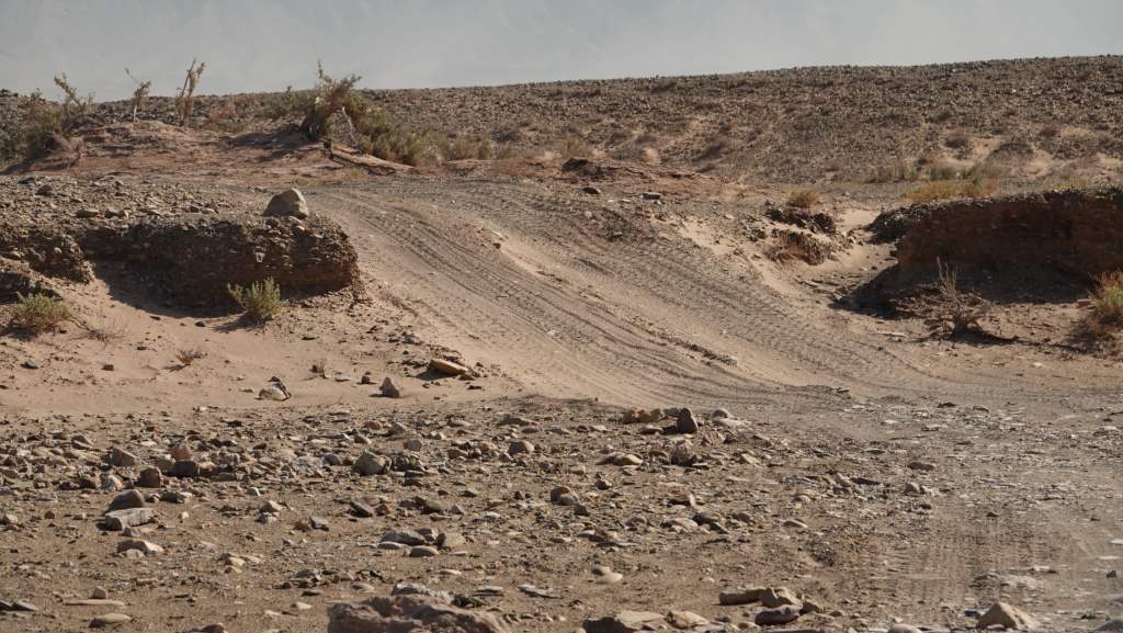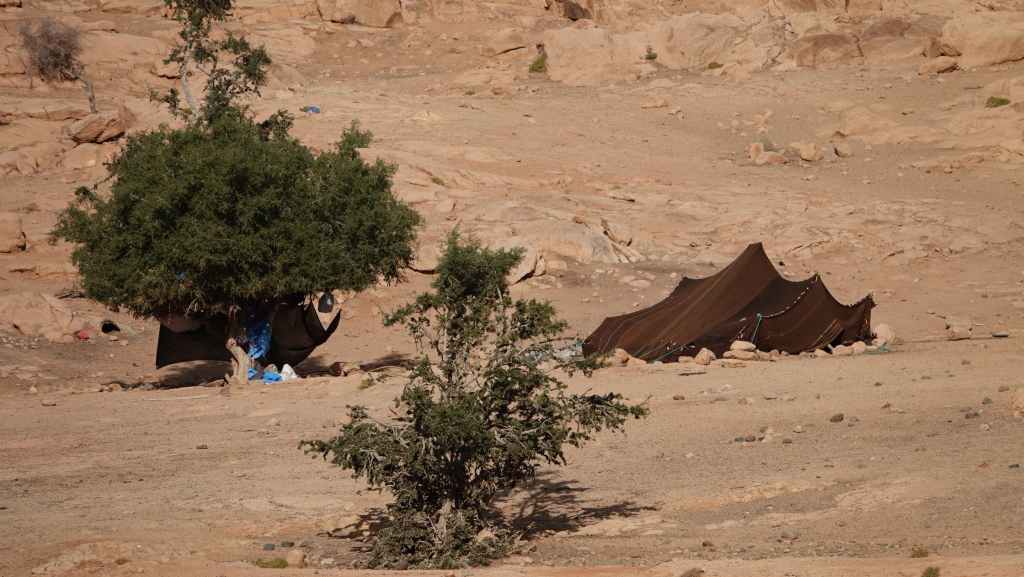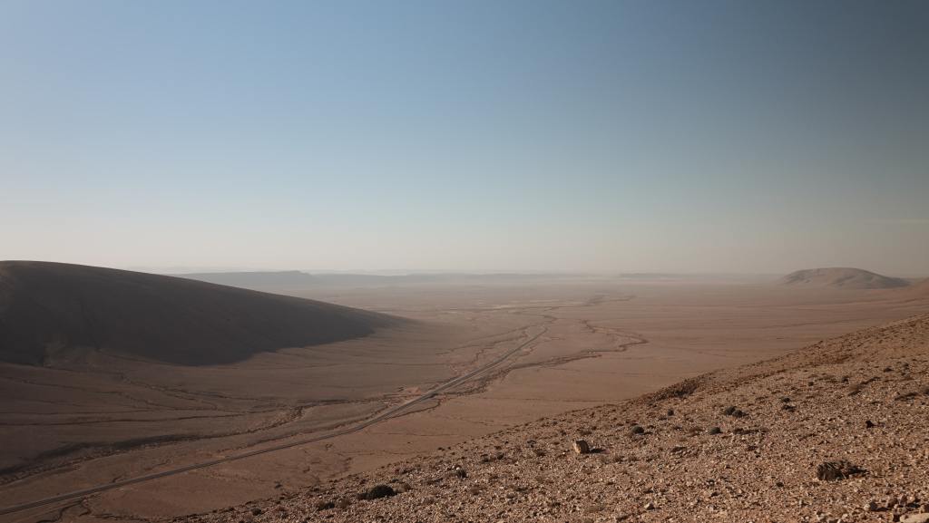 Nous attaquons par une piste retravaillée récemment mais avec pas mal de tôle ondulée : la vitesse moyenne est alors de 20 km/h. On traverse des paysages aux couleurs orangées et grises anthracites. Un oued à sec est bordé d’acacias. Quelques rares habitations en ruines se détachent dans cette vaste plaine encadrée de montagnes culminants à 650 m au nord et 400 m au sud. Deux camps de nomades en toile sont dispatchés le long de la piste et nous croisons à plusieurs reprises leurs dromadaires.