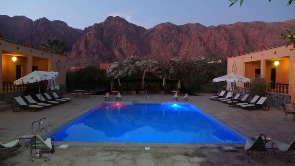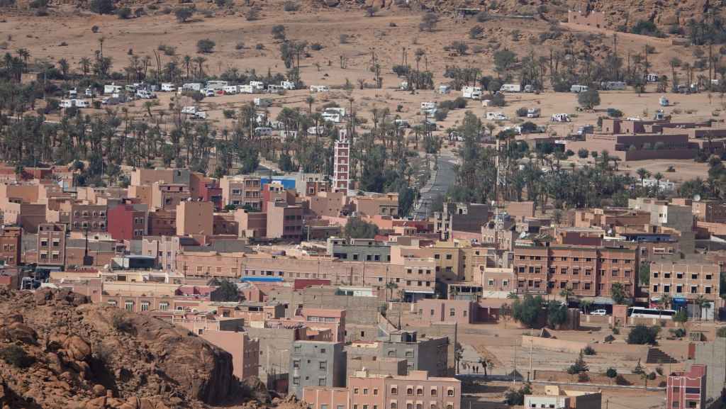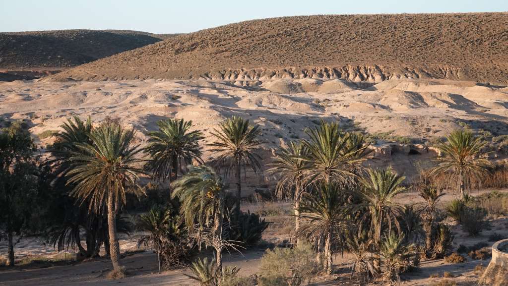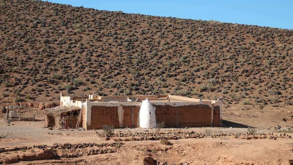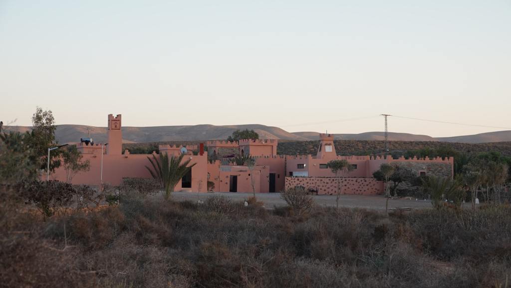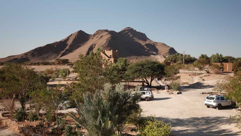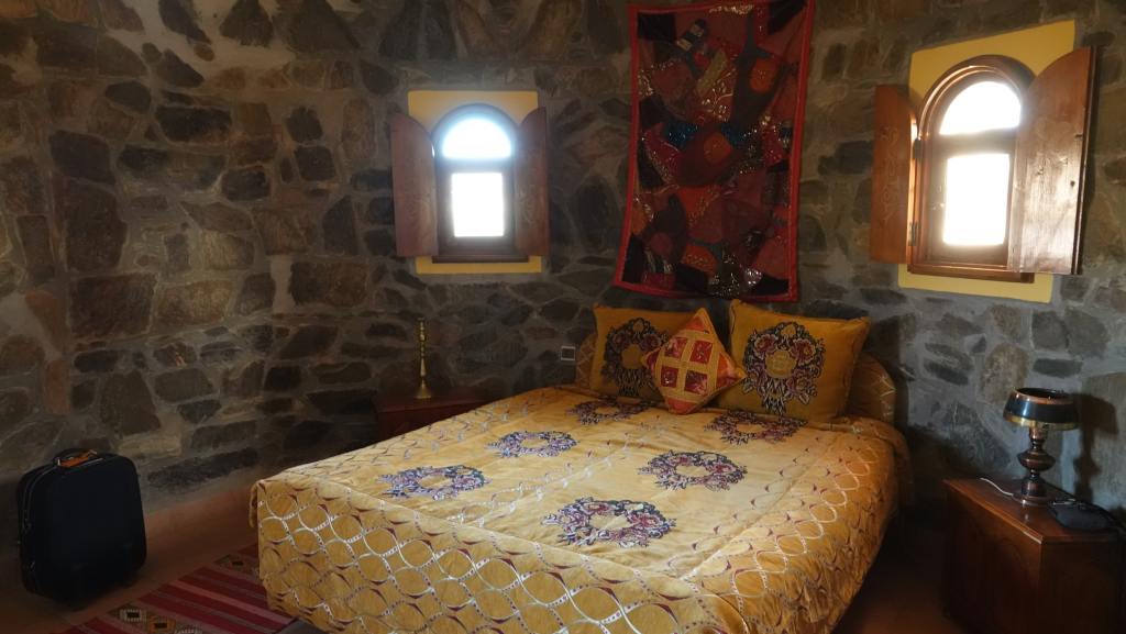 Il fait nuit noire quand nous remontons vers le nord est, par la RN17, vers Icht. La progression est difficile car les phares du Duster éclairent à 20 mètres devant le capot. En plus, on croise des 4×4 équipés de barres leds et qui ne prennent pas la peine de les couper en croisant d’autres véhicules : de vrais abrutis ! Le risque est de percuter des piétons ou cyclistes non éclairés ou alors des animaux… La tension est grande et la fatigue de la journée se fait sentir. Enfin Icht que l’on traverse pour rejoindre le camping – hôtel Borj Biramane. En cours de route, nous avions prévenu de notre arrivée tardive. Il est 20h30 quand nous franchissons le portail et un membre du personnel nous attend avec sa lampe torche pour nous garer au mieux. Ils nous ont gardé un tajine et comme prévu , on retrouve Sophie et Alexis installés dans le salon. Après le repas pris en solitaires, on repart dans de sympathiques discutions jusque vers minuit. On retrouve notre confortable chambre située dans une maisonnette, pour une nuit réparatrice.