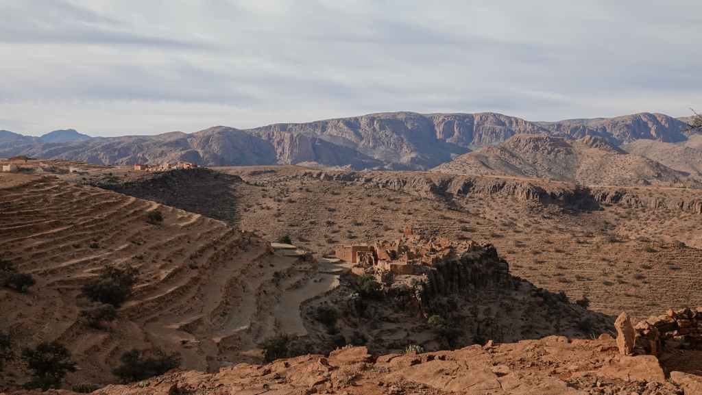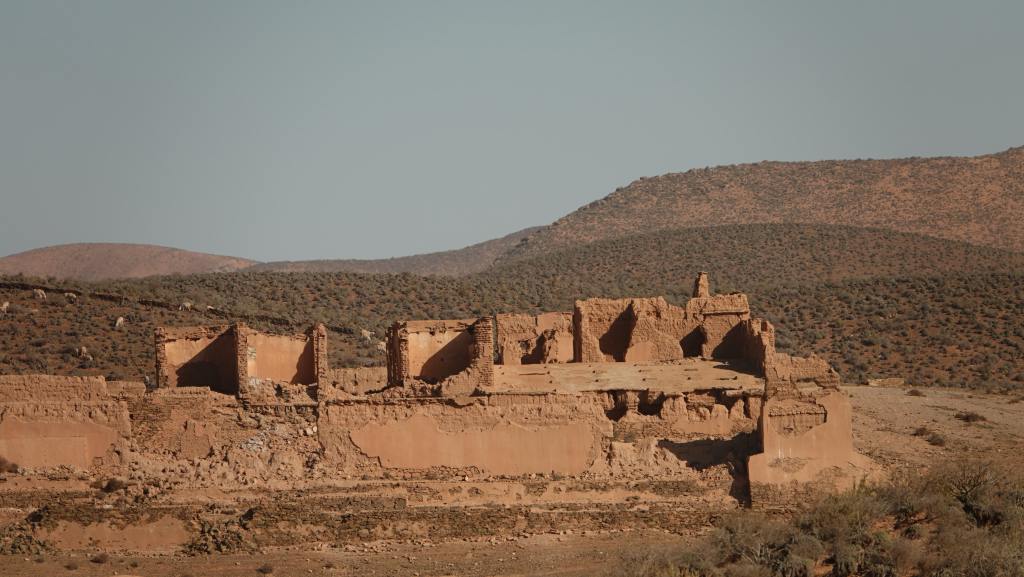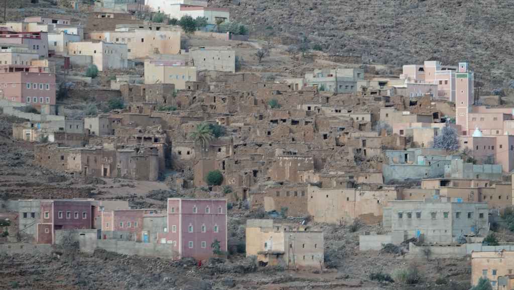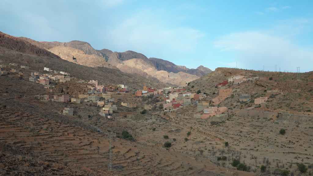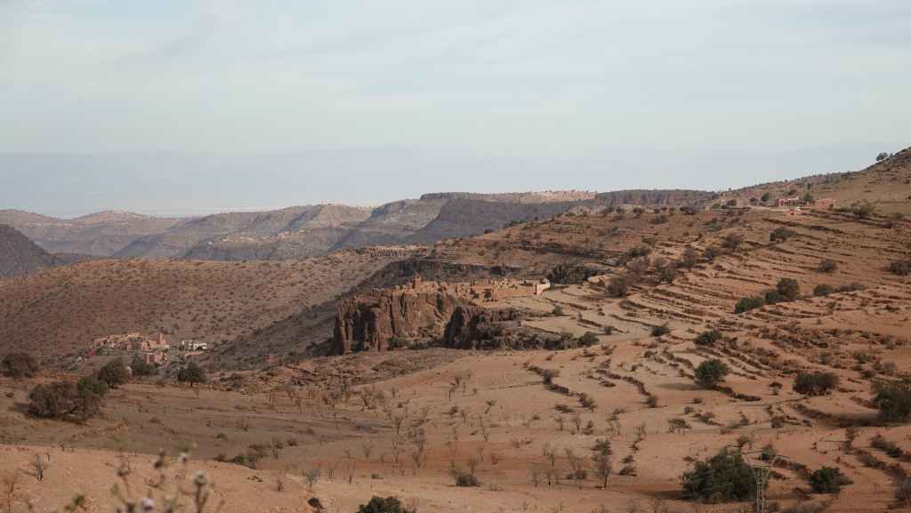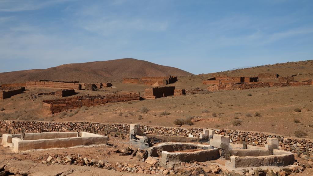 On retrouve tout de même la Kasbah Tizourgane perchée sur sa butte rocheuse et un peu plus loin, on découvre un village en forme de fer à cheval puis les ruines d’un village berbère en contre-bas de la route, sur notre gauche, et bien plus loin un agadir, également sur notre gauche.