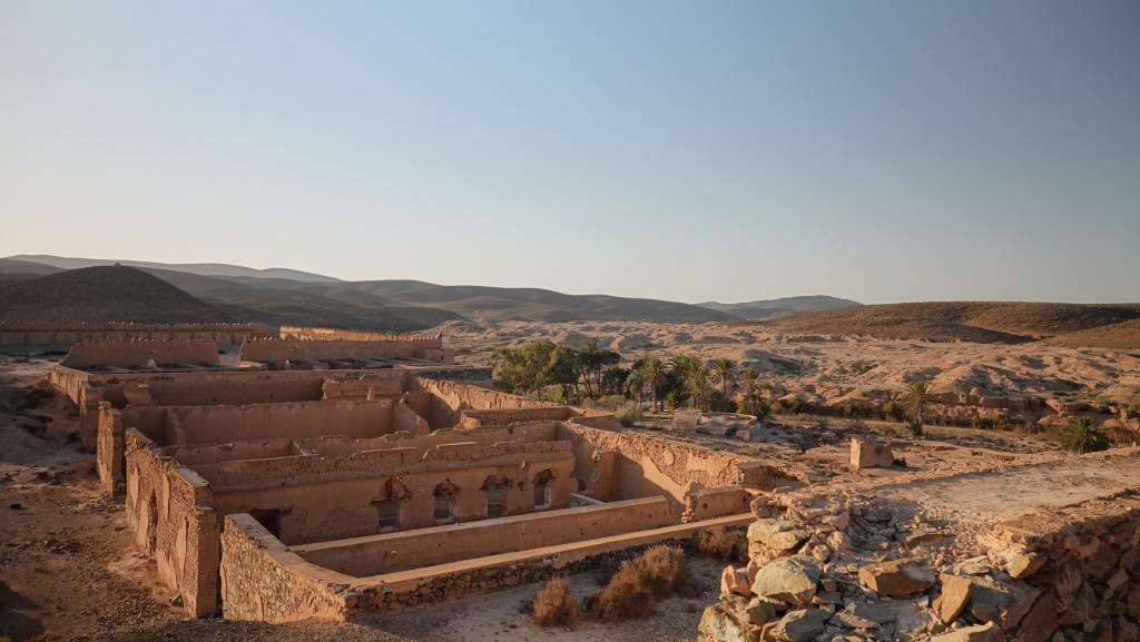 Nous empruntons une piste de 4 km pour rejoindre la construction en terre faite par ou plutôt pour les français dans les années 30. Ce gigantesque fort est désormais dans un piteux état st se délabre d’années en années. Il fait ici 35°C et on est pas habitués. Après une visite, nous poursuivons la piste sur moins d’1 km pour gagner notre hébergement du jour FBJ soit Fort Bou Jerif. Il s’agit d’un petit complexe touristique avec hôtel, camping, tentes de location et restaurant. Comme on a choisit la version confort, la personne de l’accueil nous conduit vers l’hôtel situé à 200 m des bâtiments principaux. Ce complexe est propriété d’un ancien pilote moto suisse qui a participé au Dakar puis à son organisation. Comme nous avons repéré au camping un pick-up et sa cellule amovible, nous allons tailler la bavette avec les propriétaires de la Rochelle. Après le repas, nous regagnons notre chambre au décor oriental. Moustiques et autre petites bêtes piquantes nous accompagnent pour la nuit.