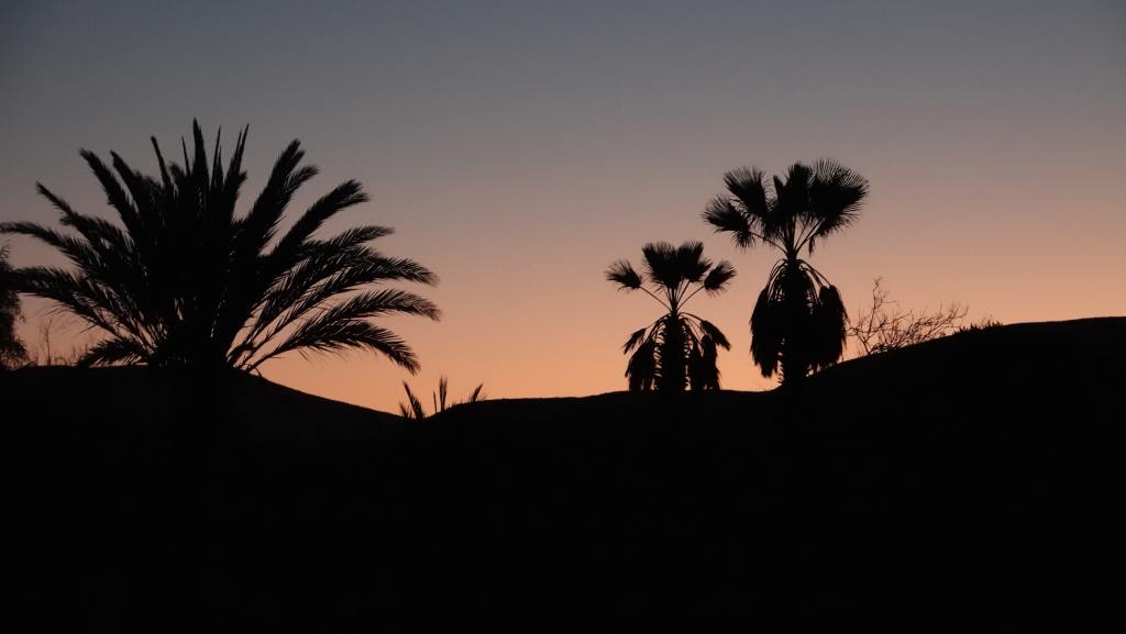 En redescendant on croit rejoindre le goudron mais ce n’est qu’un mirage ! La RP1309 n’est pas asphaltée et on poursuit à vitesse modérée même si on atteint parfois les 50 km/k sur des étendues de terre bien planes. Le soleil passe derrière l’horizon alors que nous sommes toujours sur la piste cette fois-ci plus roulante et enfin le goudron sur la RP1308, alors que la nuit tombe sur Aouinet Torkoz. Nous pouvons alors accélérer pour rejoindre Assa.