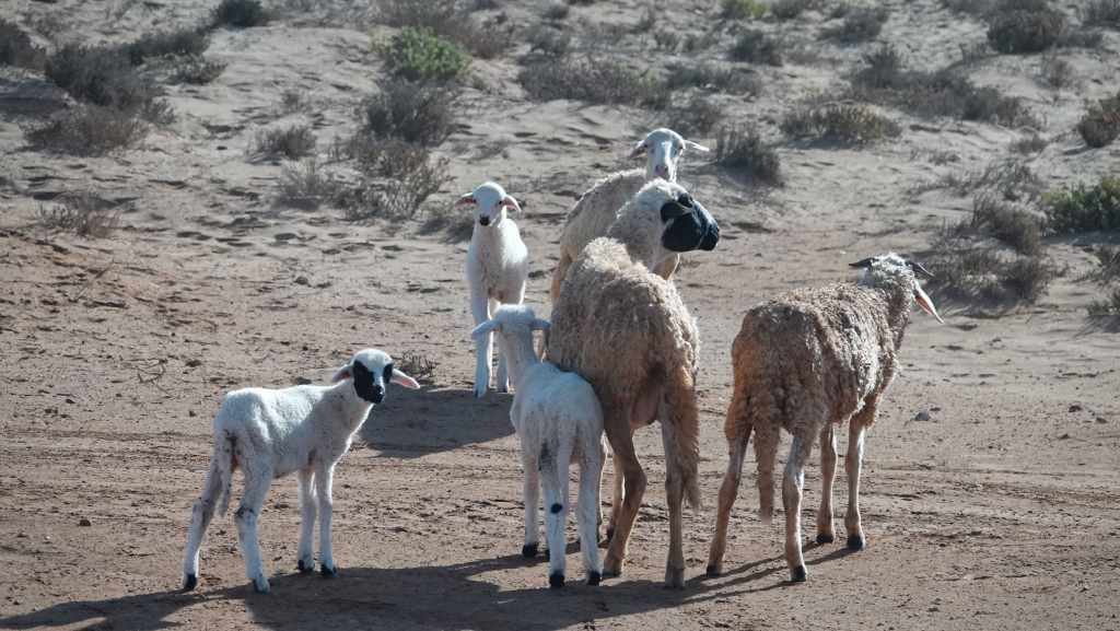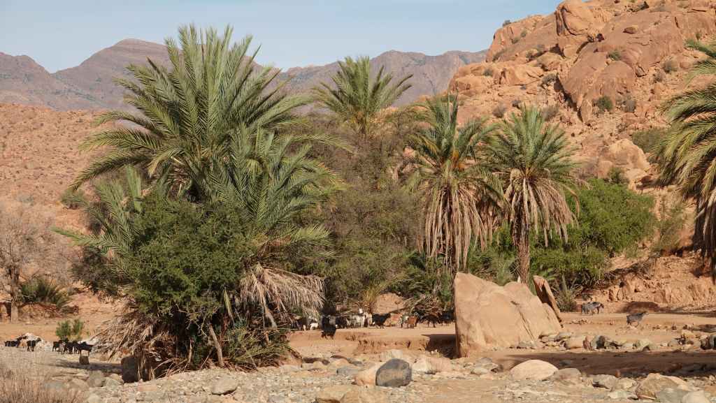 Nous avons bien du mal à trouver le sentier, même si nous n’avons aucun risque de nous perdre. A l’approche d’un carrefour, au creux des montagnes, 2 gars finissent de charger la benne d’un camion avec des galets de la rivière asséchée. Ils repartent en même temps que nous et avons l’impression de vivre la série « des routes de l’impossible » tellement le camion balance sur le fond de l’oued. Eux descendent vers la ville, et nous, nous remontons vers l’est. A cet endroit, un berger puise l’eau d’un puits afin d’abreuver son troupeau de chèvre.