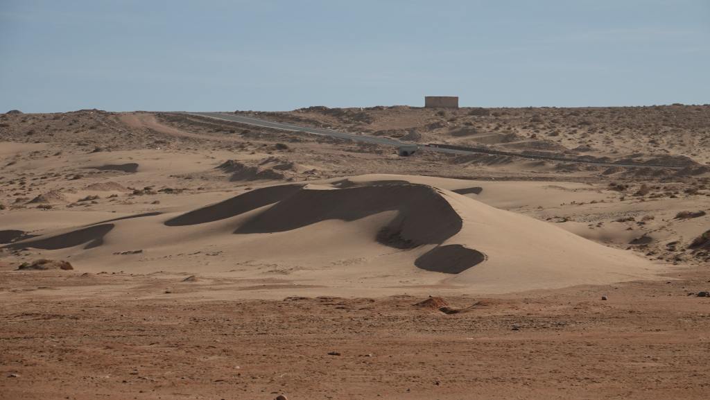 La jeune serveuse accro au smartphone ayant désertée au moment de nous servir le petit-déjeuner, nous continuons la piste de la veille sur 7 km afin de rejoindre une route goudronnée. Pour reprendre la N1 en direction de Tan-Tan, nous coupons par une jolie piste sablonneuse. La N1 est en travaux pour la transformer en 2×2 voies du nord au sud du Maroc.