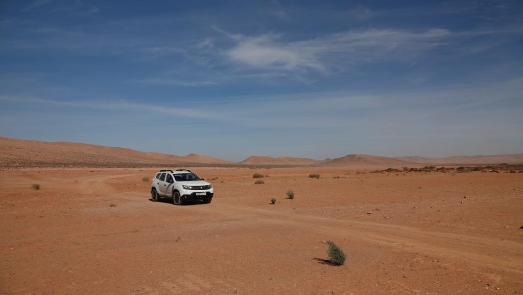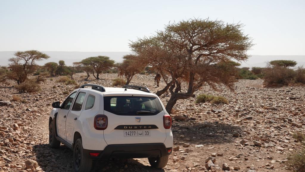 On récupère nos bagages, une carte SIM Orange (10 € pour Go), des Dirhams, et le Duster 4×4 que nous avons loué chez Exotikcar. Le règlement se fait par CB à l’arrière de la voiture. Il y a des rayures et des d’autres défauts mais peu importe. Le gars nous dit que seul de gros pocs sont important. La voiture est propre. La location est un peu chère avec l’assurance maximum mais cela reste toujours moins chère qu’un gros 4×4 à 120 € / jour.