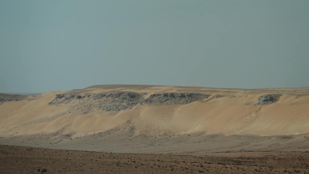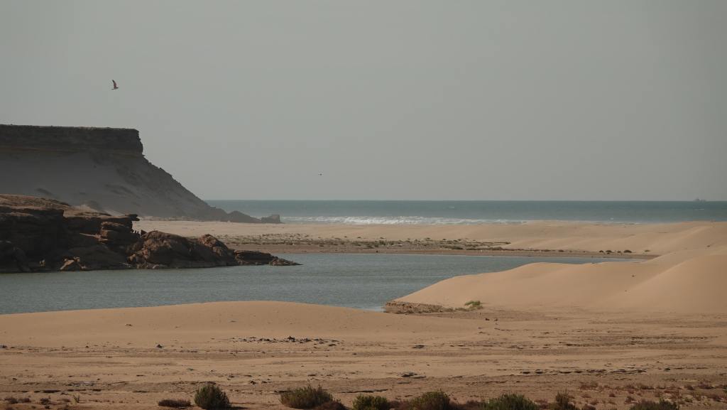 Après le petit-déj à la française, nous quittons la Courbine d’Argent, pour nous rendre à quelques kilomètres, au Parc National de Naïla ou Khenifiss : il s’agit d’un « fjord » bordé d’un désert de dunes, un erg. Le vent s’est levé et la route est déjà balayée par le sable.