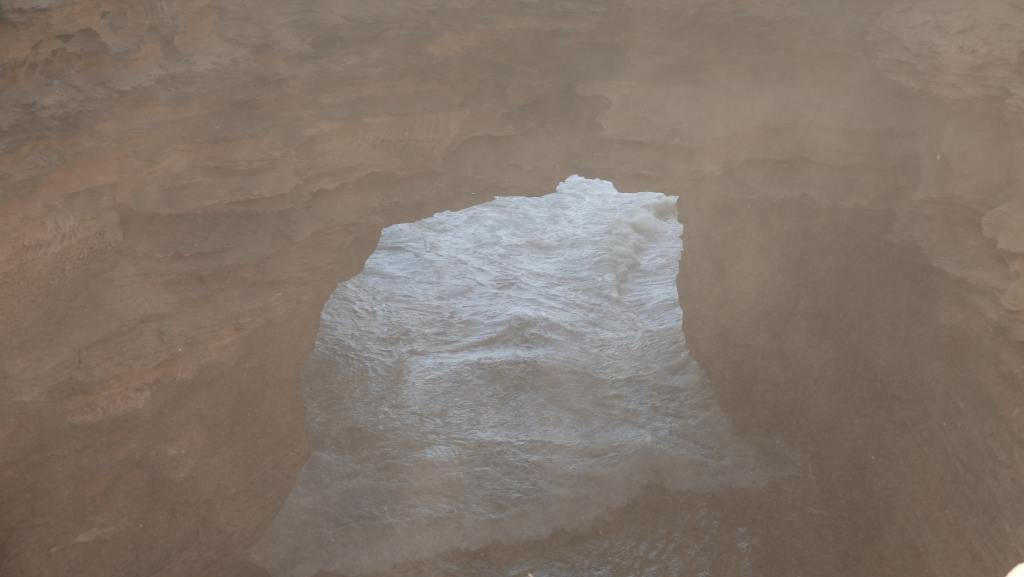 Puis nous stoppons au Trou du Diable ou Ajeb Lah ou un éffondrement au-dessus de la falaise a creusé un trou d’une quarantaine de mètres de diamètre. Les vagues de l’océan s’y engouffre au fond.