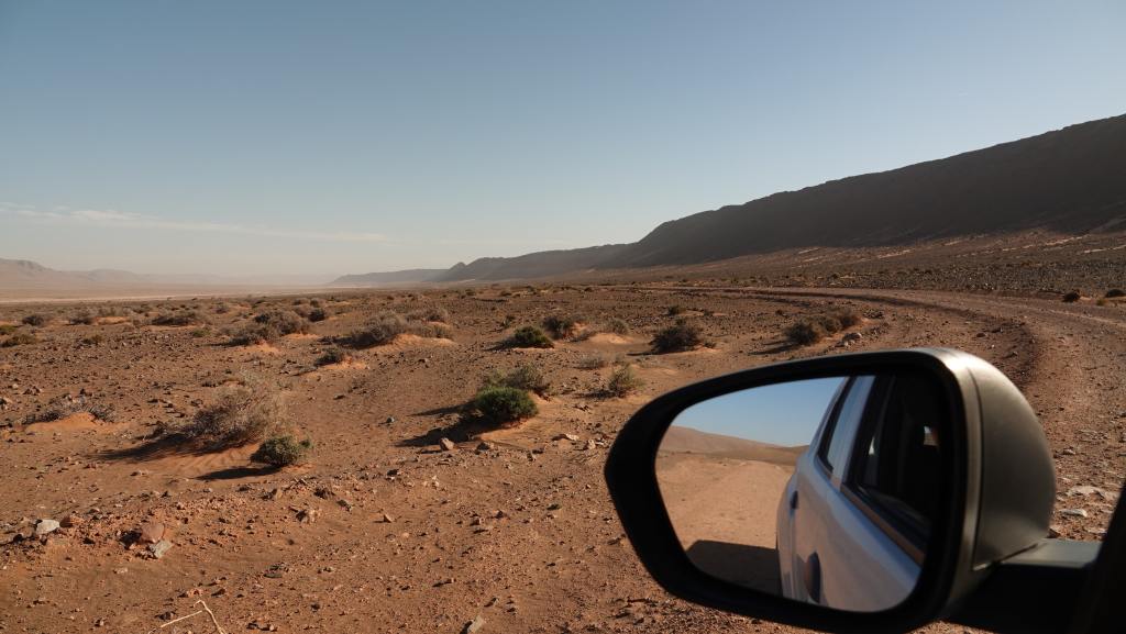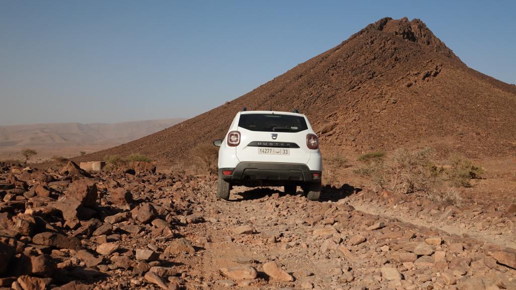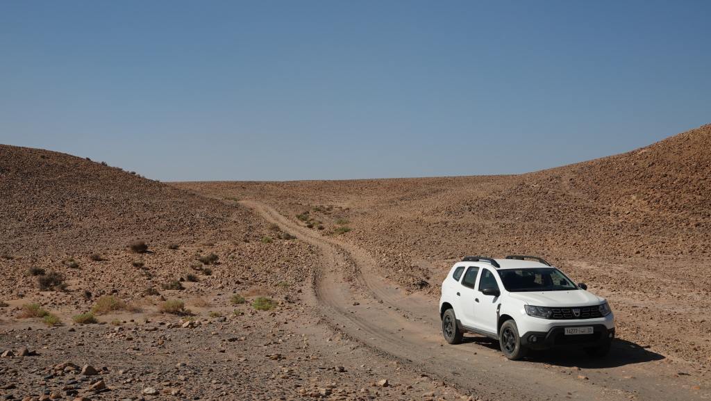 Après avoir franchi une « cluse », nous redescendons vers 150 m d’altitude avant de rejoindre l’ oued Drâa : il s’agit du même oued qui donne le nom à la célèbre vallée bien plus à l’est et qui passe à M’Hamid et Zagora et remonte sur Ouarzazate. Il est ici à sec. on pique-nique à l’arrière du Duster au-dessus d’une nouvelle plaine et de nouveaux paysages grandioses. La progression est : la piste alterne cailloux, sable plus ou mois mou et nous avons parfois quelques hésitations sur les directions à prendre. Mais notre Duster passe partout et nous surprend par ses capacités même si c’est un véhicule que nous connaissions parfaitement avec de venir ici.