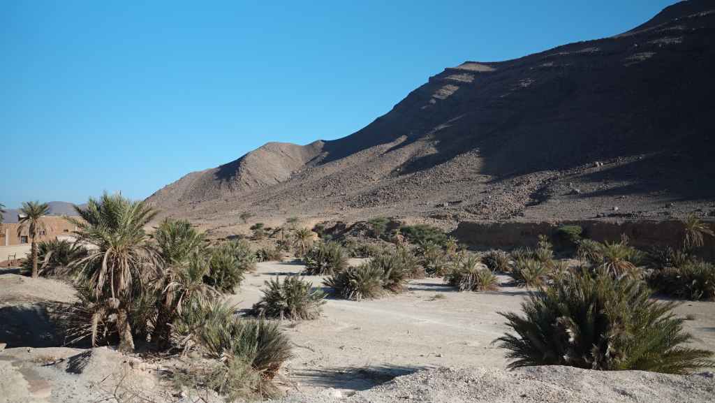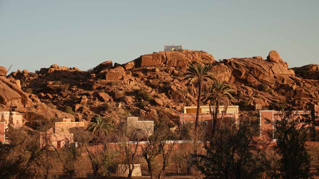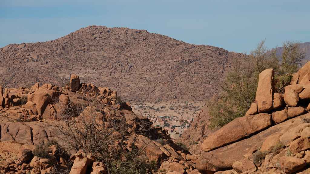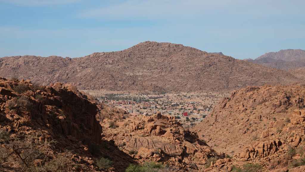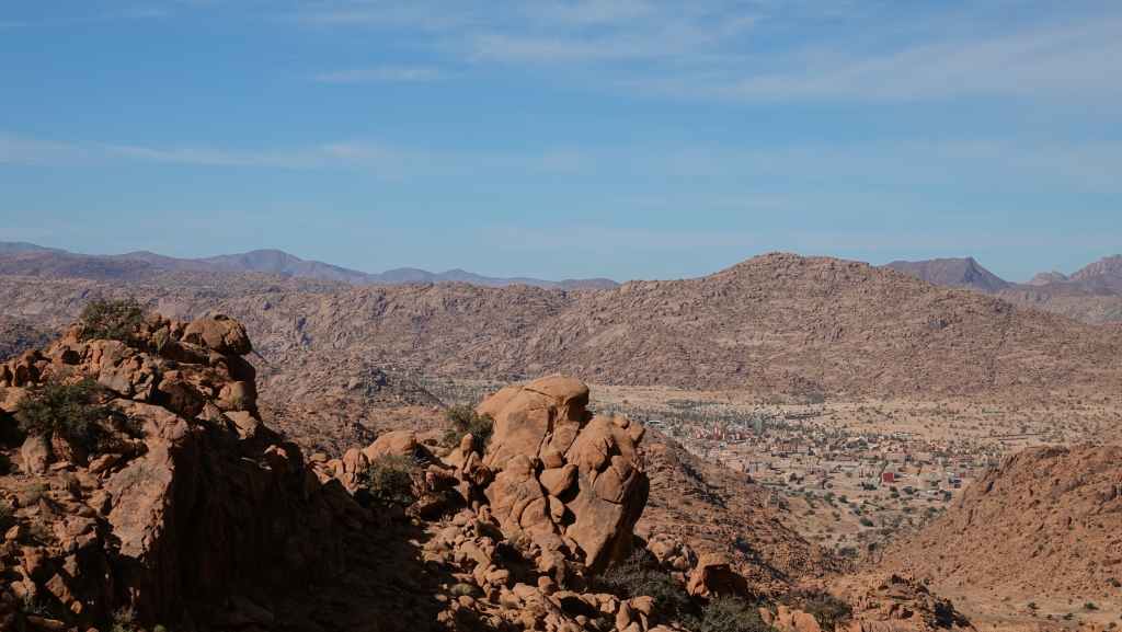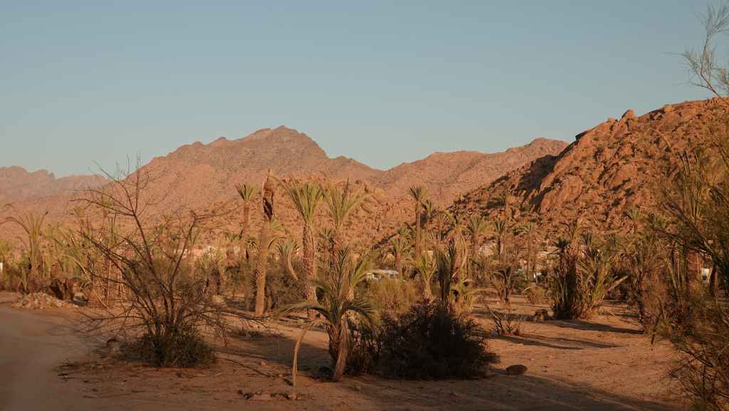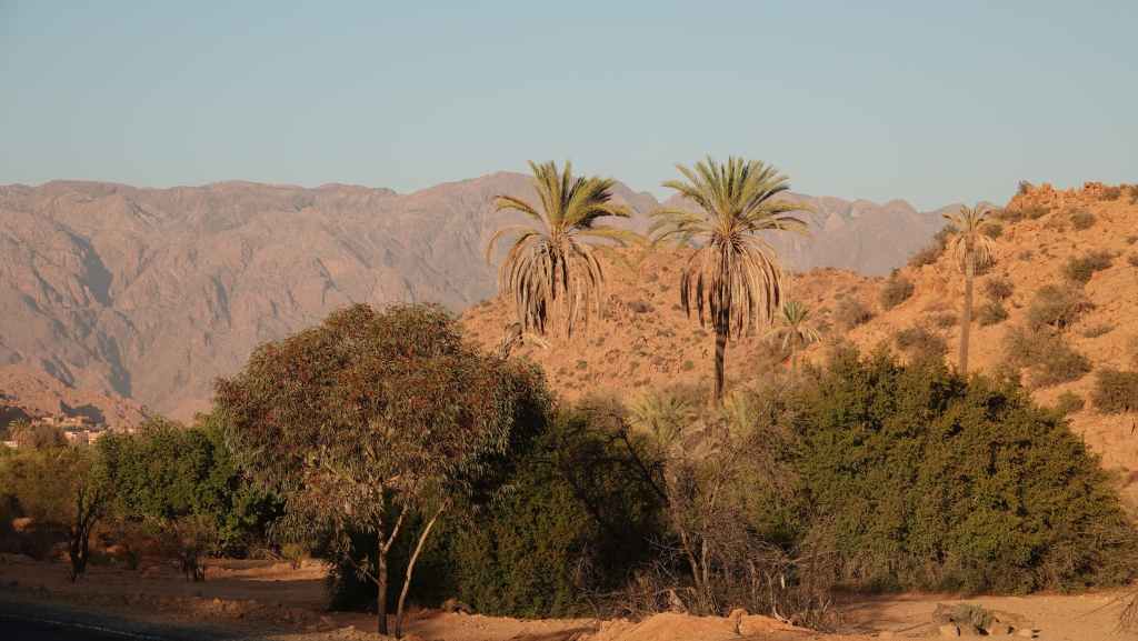Néanmoins, les paysages que nous traversons sont splendides. Nous arrivons en ville aux travers de palmeraies blotties au pied des montagnes de granite rose, éclairées par le soleil.